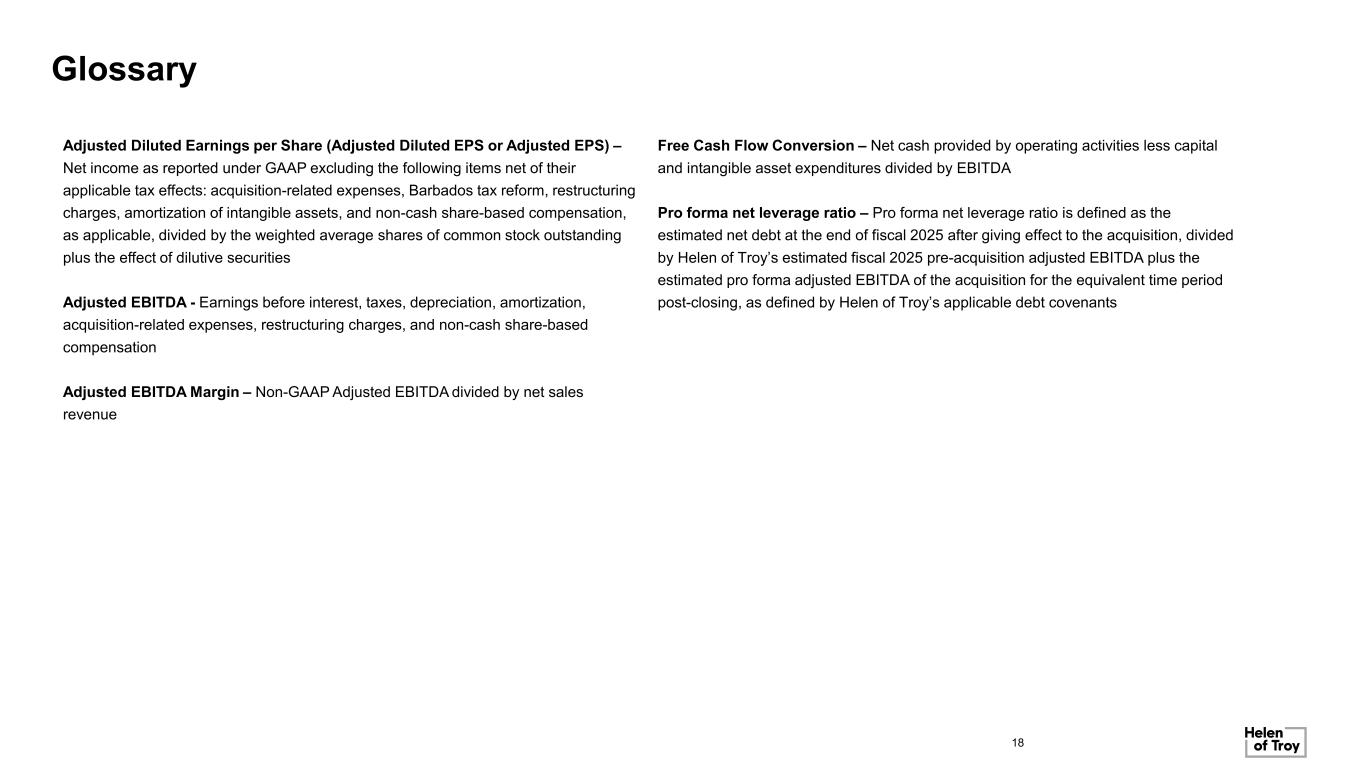 词汇表18调整后稀释每股收益(调整后稀释每股收益或调整后每股收益)–根据公认会计原则报告的净收入,不包括以下项目,扣除其适用的税收影响:收购相关费用、巴巴多斯税收改革、重组费用、无形资产摊销和非现金股份补偿(如适用),除以已发行普通股的加权平均股份加上稀释证券的影响调整后EBITDA-扣除利息、税项、折旧、摊销、收购相关费用、重组费用前的收益,和非现金股份薪酬调整后EBITDA利润率–非公认会计准则调整后EBITDA除以净销售收入自由现金流转换–经营活动提供的净现金减去资本和无形资产支出除以EBITDA备考净杠杆率–备考净杠杆率定义为收购生效后的2025财年末的估计净债务,除以收购生效后的海伦特洛伊家电的估计2025财年收购前调整后EBITDA加上收购完成后同等时间段的估计备考调整后EBITDA,定义见海伦特洛伊家电的适用债务契约