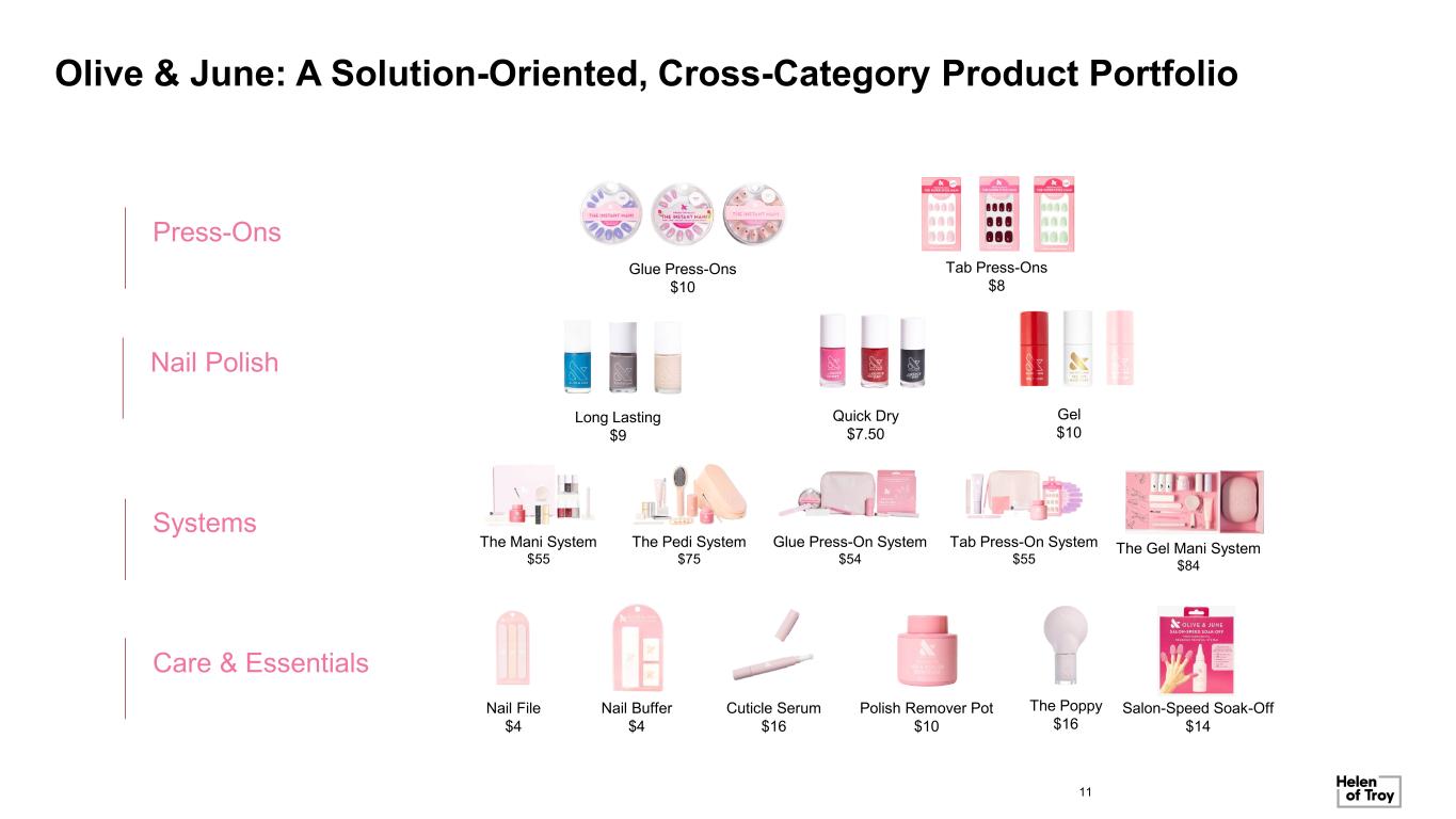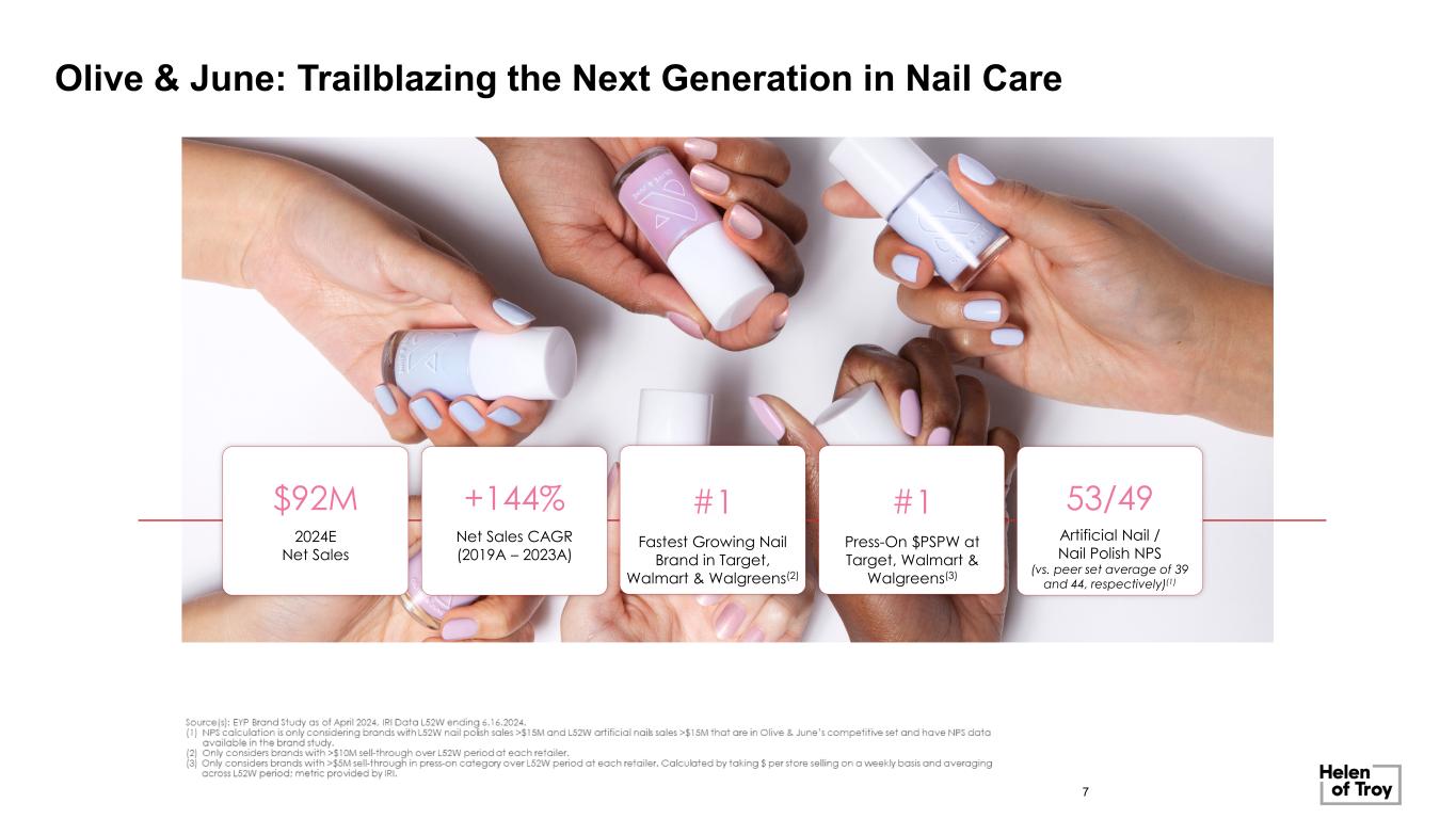 Olive & June:开拓指甲护理领域的下一代9200万美元2024年净销售额# Target、Walmart & Walgreens中增长最快的指甲品牌第一名(2)净销售额CAGR(2019A – 2023a)+ 144% 53/49人造指甲/甲油NPS(对比同行平均水平分别为39和44)(1)# Target、Walmart & Walgreens中的1 Press-on $ PSPW(3)7