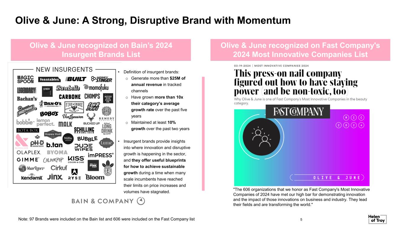 Together Continuing Better Together并购•将海伦特洛伊家电的客户覆盖范围从护发以外的美容领域扩展到$ 2.3B的家庭美甲类别*在COVID期间看到并保持了阶梯式增长•增加了一个独特的、现代的、痴迷于消费者的叛乱品牌,该品牌具有明确的增长潜力,由一支随时准备利用海伦特洛伊家电支持的充满激情的团队推动•利用特洛伊的海伦特洛伊家电的能力和规模,帮助Olive & June为客户提供更多价值并推动品类增长•加强和补充Troy的海伦特洛伊家电的触达具有吸引力且以数字为驱动的消费群,与Z世代和千禧一代建立过度索引•带来数字参与专业知识,可以增强海伦特洛伊家电的数字影响力和专业知识•保留一支忠诚的领导团队,他们热衷于与品牌保持联系并推动增长•所需的支持最少且可实现,未来在营销COE、供应链和其他共享服务方面具有协同效应的潜力4*资料来源:3rd party syndicated data,2024