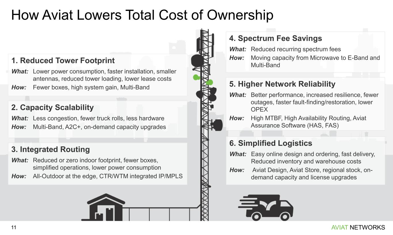 AVIAT网络介绍了AVIAT如何降低总拥有成本11。降低铁塔占用空间What:更低的功耗、更快的安装、更小的天线、减少铁塔负载、更低的租赁成本How:更少的盒子、高系统增益、多波段2。容量可扩展性什么:少拥堵、少货车卷、少硬件怎么样:多波段、A2C +、按需容量升级3。集成路由什么:室内占地面积减少或为零,盒子更少,操作更简化,功耗更低怎么样:边缘全户外,CTR/WTM集成IP/MPLS 4。频谱费用节省什么:降低了经常性频谱费用如何:将容量从微波转移到E波段和多波段5。更高的网络可靠性What:更好的性能、更高的弹性、更少的中断、更快的故障查找/恢复、更低的OPEX how:高MTBF、高可用路由、Aviat Assurance Software(HAS、FAS)6。简化物流什么:线上轻松设计下单,快速发货,降低库存和仓库成本如何:Aviat Design,Aviat Store,区域库存,按需运力和牌照升级