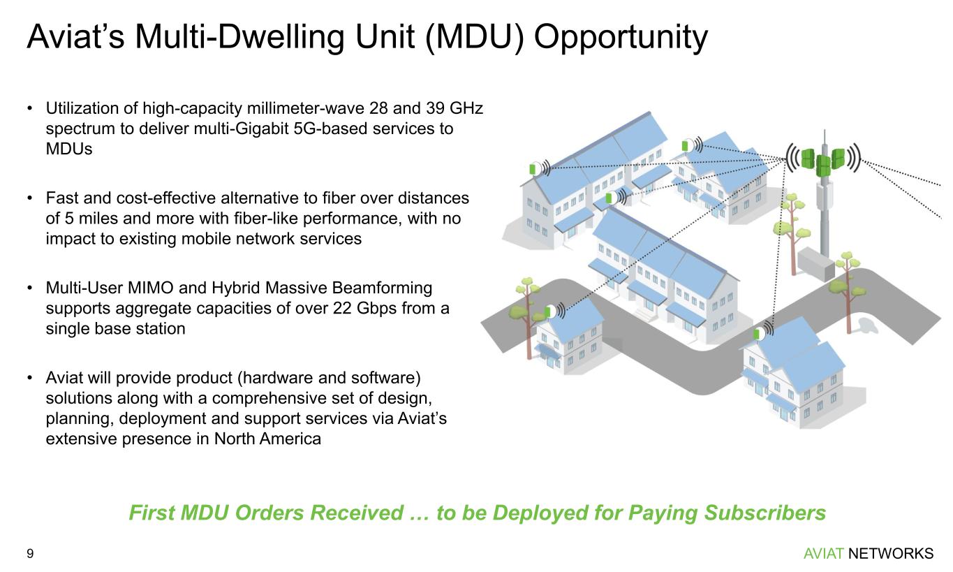 AVIAT NETWORKS AVIAT的多住宅单元(MDU)Opportunity 9收到的首批MDU订单……将部署用于向用户付费•利用高容量毫米波28和39GHz频谱向MDU提供基于千兆5G的服务•在5英里及以上的距离上以类似光纤的性能替代光纤的快速且具有成本效益的方式,对现有移动网络服务没有影响•多用户MIMO和混合大规模波束赋形支持从单个基站到超过22Gbps的聚合容量• AVIAT将提供产品(硬件和软件)解决方案以及一整套全面的设计、规划、通过Aviat在北美的广泛存在提供部署和支持服务