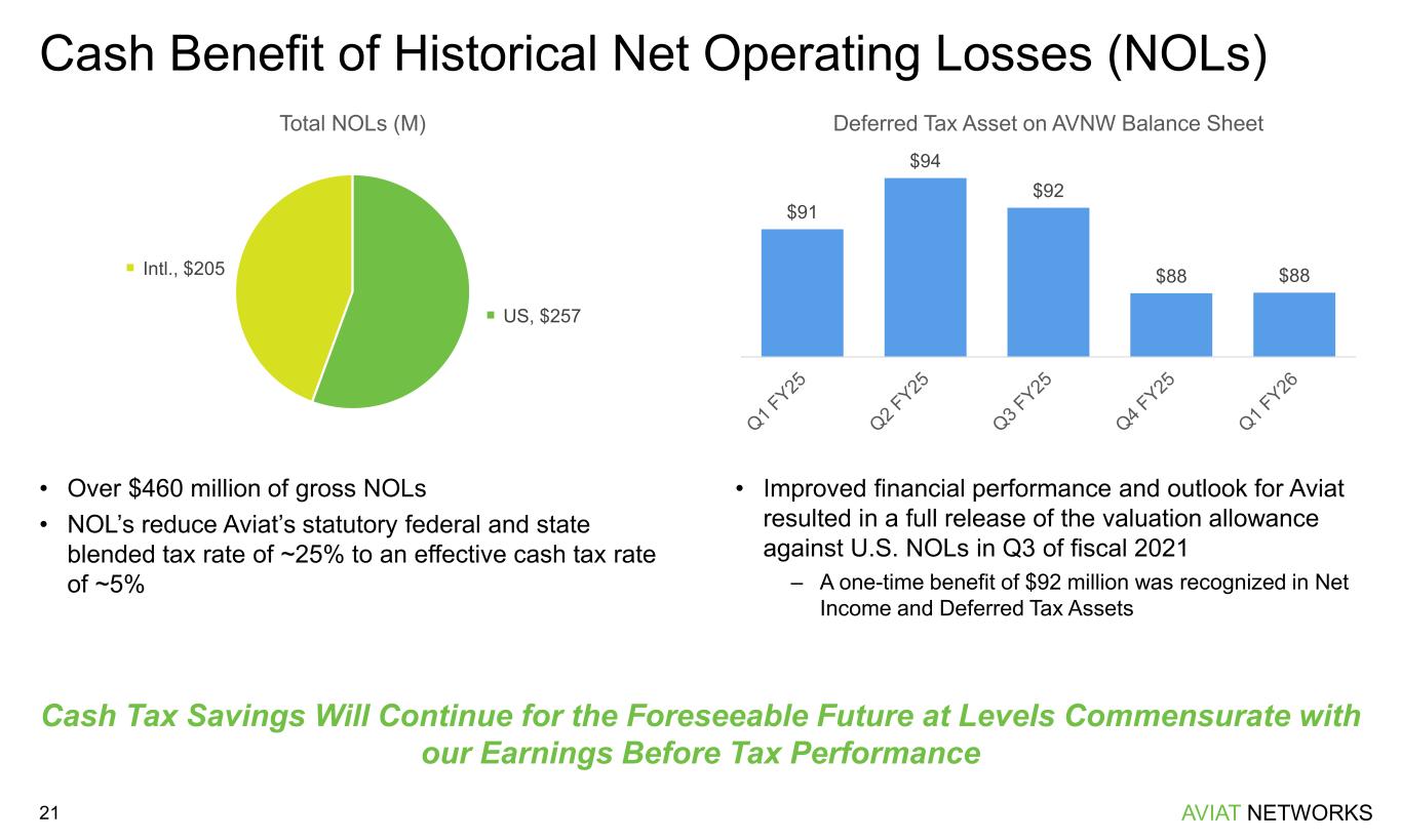 AVIAT Network从历史净经营亏损(NOL)中获得现金收益21现金节税将在可预见的未来继续保持在与我们的税前利润表现相称的水平•超过4.6亿美元的总NOL • NOL将Aviat的法定联邦和州混合税率约25%降至有效现金税率约5% • AviAT的财务业绩和前景改善导致2021财年第三季度针对美国NOL的估值备抵完全释放——在净收入和递延所得税资产中确认了9200万美元的一次性收益美国,257美元国际市场,205美元NOL(M)总额91美元94美元92美元88美元AVNW资产负债表上的递延所得税资产