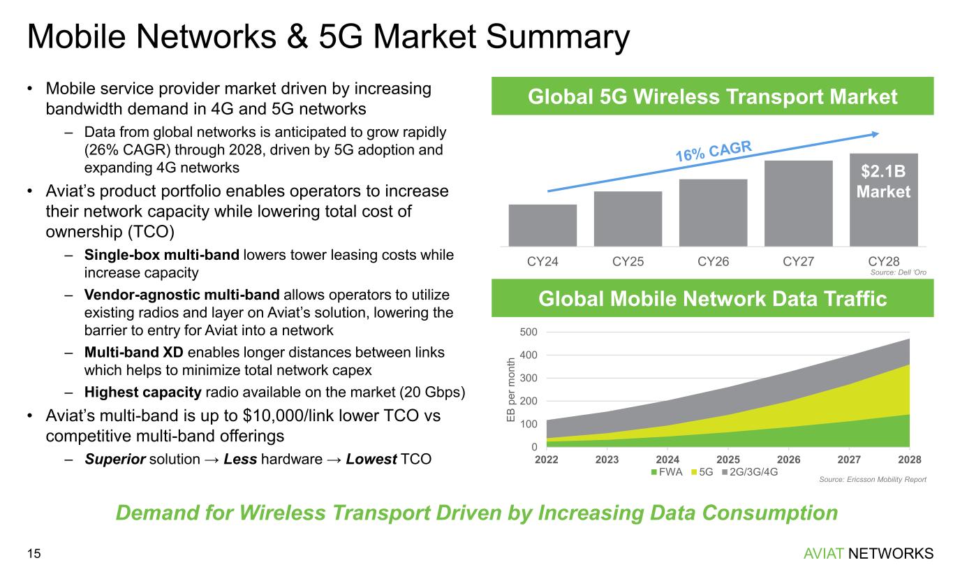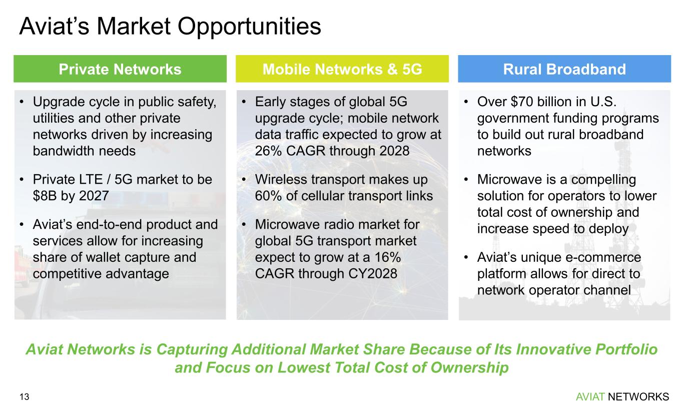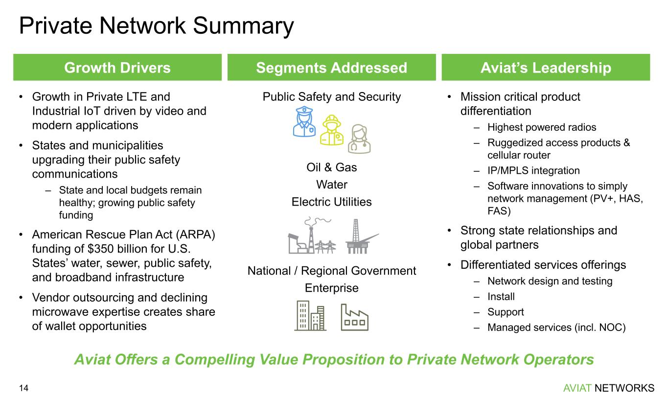 AVIAT网络•公共安全升级周期,由日益增长的带宽需求推动的公用事业和其他专用网络•到2027年专用LTE/5G市场将达到$ 8B • Aviat的端到端产品和服务允许增加钱包捕获的份额和竞争优势•全球5G升级周期的早期阶段;预计到2028年移动网络数据流量将以26%的复合年增长率增长•无线传输占蜂窝传输链路的60% •全球5G传输市场的微波无线电市场预计到2028年将以16%的复合年增长率增长•美国政府为建设农村宽带网络提供的资助计划超过700亿美元•微波是运营商降低总拥有成本的令人信服的解决方案并加快部署速度• Aviat独特的电子商务平台为直接面向网络运营商的渠道提供了Aviat的市场机会13 阿维亚网络正因其创新的产品组合和专注于总拥有成本最低的专网移动网络和5G农村宽带而获得额外的市场份额