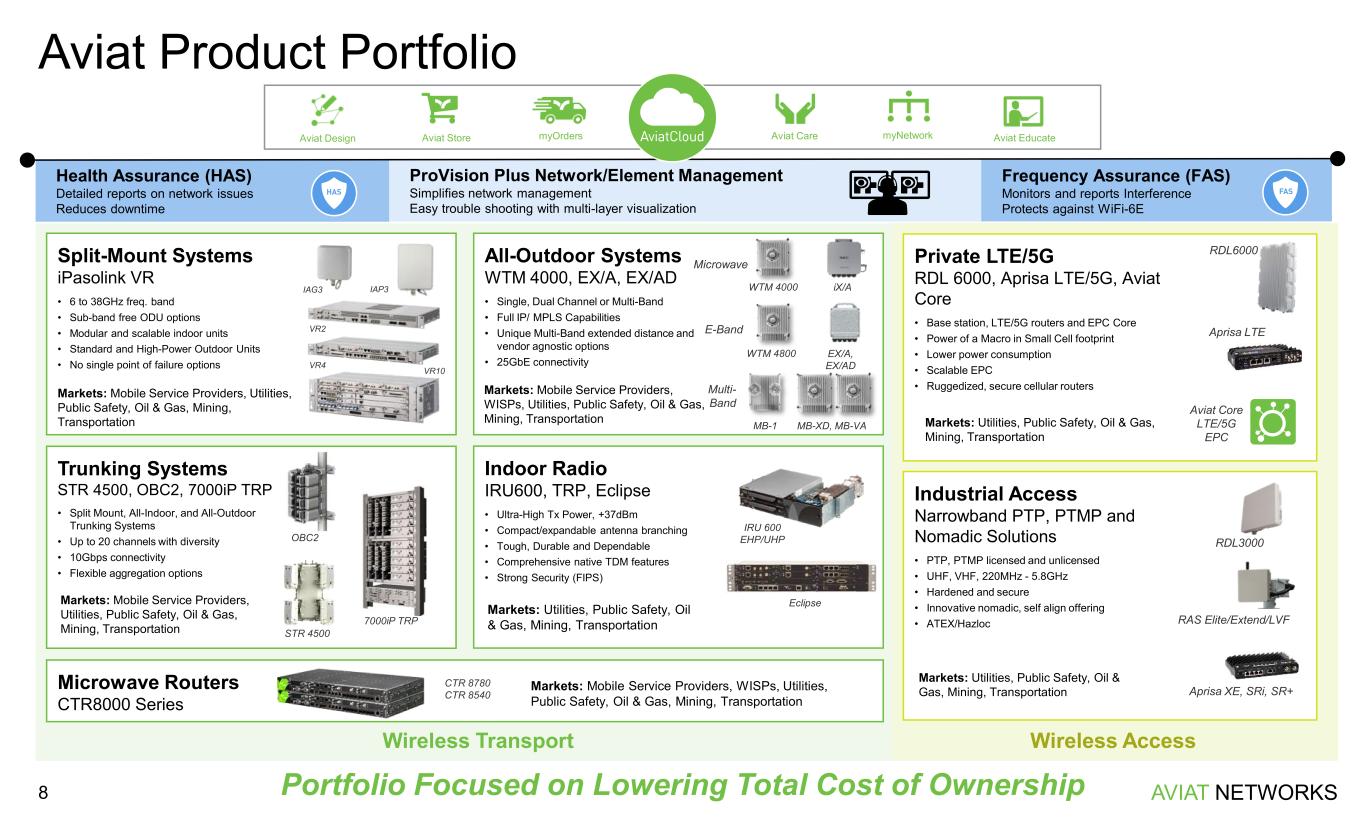 AVIAT NETWORKS无线传输和接入市场概述7 AviAT差异化与专网、5G和农村宽带无线接入增长市场国家和地方政府公用事业公共安全4G/5G移动无线传输核心市场工业许可/未许可的PTP/PTMP工业许可的私人LTE/5G光纤接入/蜂窝其他应用»工业微波Aviat差异化同类最佳无线传输产品独特的软件和服务颠覆性供应链和电子商务高频交易