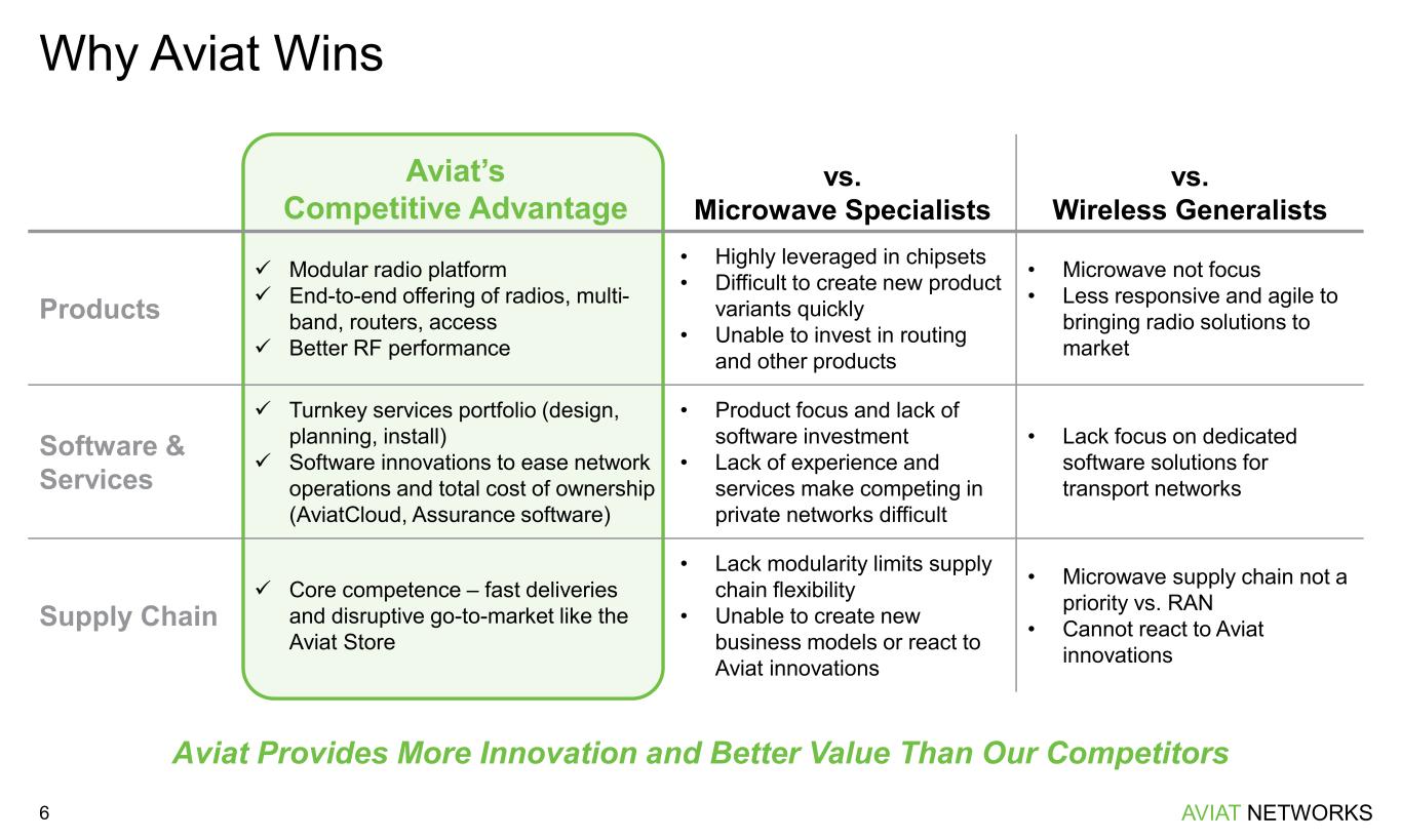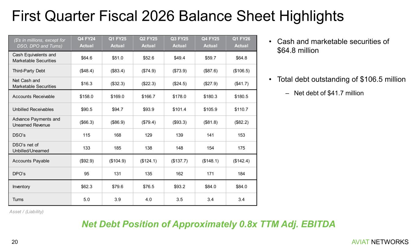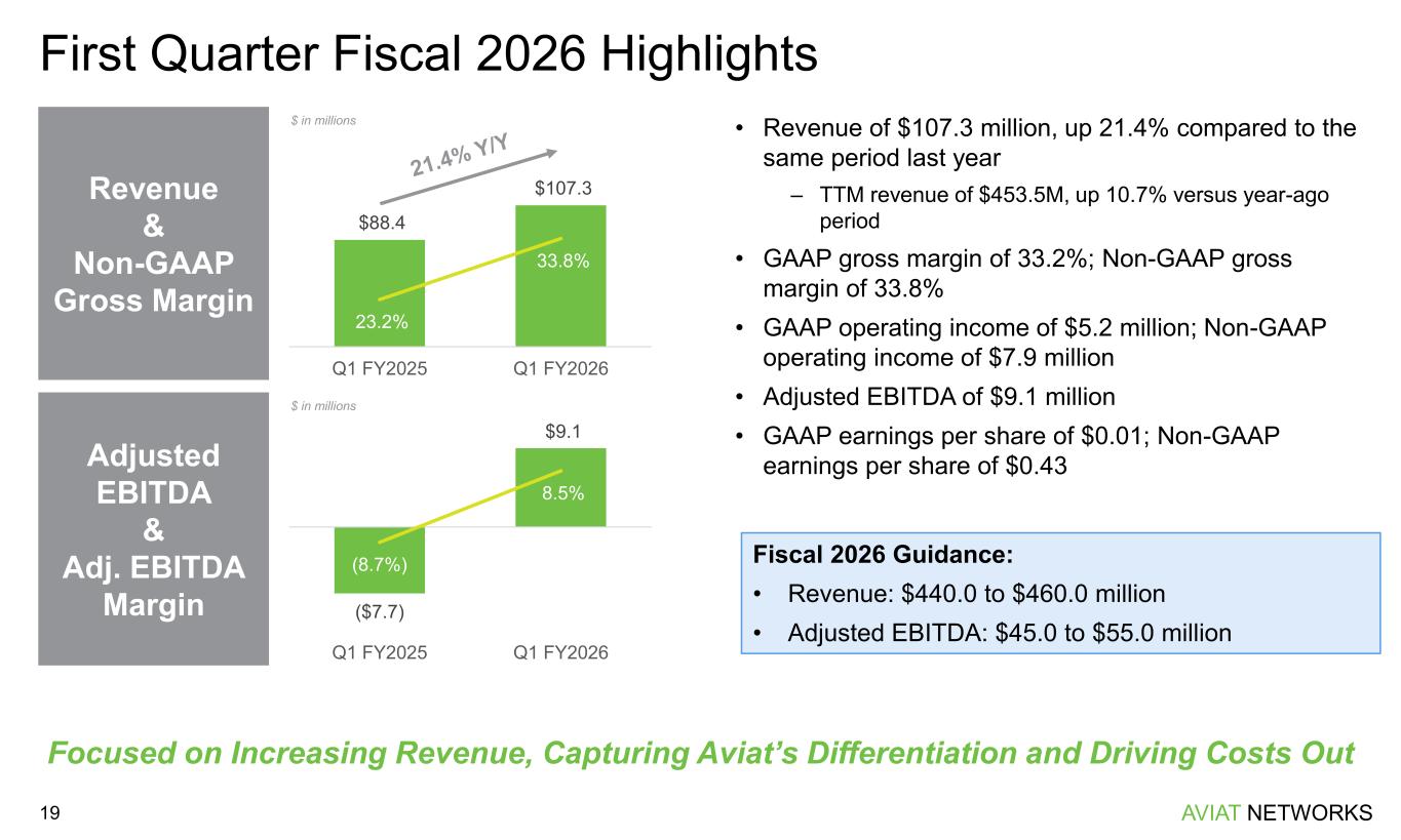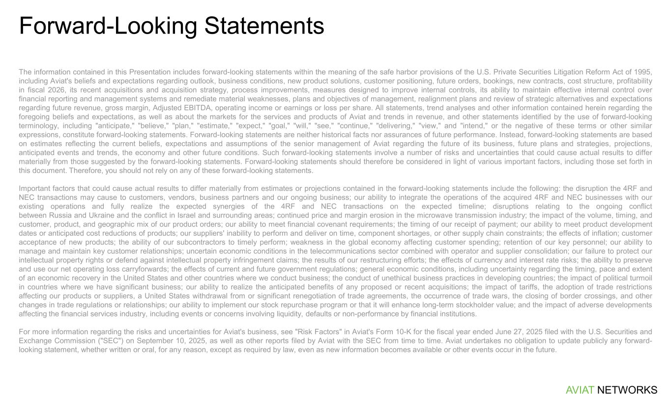本演示文稿中包含的信息包括1995年美国《私人证券诉讼改革法案》安全港条款含义内的前瞻性陈述,包括Aviat对前景、业务状况、新产品解决方案、客户定位、未来订单、预订、新合同、成本结构、2026财年的盈利能力、其最近的收购和收购战略、流程改进、旨在改善内部控制的措施、其对财务报告和管理系统保持有效内部控制以及纠正管理的重大弱点的能力、计划和目标,重新调整计划,审查有关未来收入、毛利率、调整后EBITDA、营业收入或每股收益或亏损的战略替代方案和预期。此处包含的所有关于上述信念和预期的陈述、趋势分析和其他信息,以及关于Aviat的服务和产品的市场和收入趋势,以及使用前瞻性术语确定的其他陈述,包括“预期”、“相信”、“计划”、“估计”、“预期”、“目标”、“将”、“看到”、“继续”、“交付”、“观点”和“打算”,或这些术语的否定或其他类似表述,均构成前瞻性陈述。前瞻性陈述既不是历史事实,也不是对未来业绩的保证。相反,前瞻性陈述是基于反映Aviat高级管理层当前对其业务未来、未来计划和战略、预测、预期事件和趋势、经济和其他未来状况的信念、期望和假设的估计。此类前瞻性陈述涉及许多风险和不确定性,可能导致实际结果与前瞻性陈述所暗示的结果存在重大差异。因此,应结合各种重要因素,包括本文件所述因素,考虑前瞻性陈述。因此,你不应该依赖这些前瞻性陈述中的任何一个。可能导致实际结果与前瞻性陈述中包含的估计或预测存在重大差异的重要因素包括:4RF和NEC交易可能对客户、供应商造成的干扰,商业伙伴和我们正在进行的业务;我们有能力将收购的4射频和NEC业务的运营与我们现有的运营进行整合,并在预期的时间线上充分实现4射频和NEC交易的预期协同效应;与俄罗斯和乌克兰之间的持续冲突以及以色列及周边地区的冲突有关的中断;微波传输行业的持续价格和利润率侵蚀;数量、时间以及客户、产品、我们产品订单的地域组合;我们满足财务契约要求的能力;我们收到付款的时间;我们满足产品开发日期或产品预期成本降低的能力;我们的供应商无法按时履行和交付,组件短缺,或其他供应链限制;通货膨胀的影响;客户对新产品的接受程度;我们的分包商及时履约的能力;全球经济疲软影响客户支出;保留我们的关键人员;我们管理和维护关键客户关系的能力;电信部门不确定的经济状况以及运营商和供应商的整合;我们未能保护我们的知识产权或就知识产权侵权索赔进行辩护;我们重组努力的结果;货币和利率风险的影响;保全能力并使用我们的净经营亏损结转;当前和未来政府法规的影响;一般经济状况,包括美国和我们开展业务的其他国家经济复苏的时间、速度和程度的不确定性;发展中国家的不道德商业行为;我们有重大业务的国家的政治动荡的影响;我们实现任何拟议或最近收购的预期收益的能力;关税的影响,采取影响我们产品或供应商的贸易限制,a美国退出或重大重新谈判贸易协定、发生贸易战、关闭边境口岸,以及贸易法规或关系的其他变化;我们实施股票回购计划的能力或这将提高长期股东价值;以及影响金融服务行业的不利发展的影响,包括涉及流动性的事件或担忧, 金融机构违约或不履约。有关Aviat业务的风险和不确定性的更多信息,请参阅Aviat于2025年9月10日向美国证券交易委员会(“SEC”)提交的截至2025年6月27日的财政年度的10-K表格中的“风险因素”,以及Aviat不时向SEC提交的其他报告。Aviat不承担以任何理由公开更新任何前瞻性陈述的义务,无论是书面的还是口头的,除非法律要求,即使未来有新的信息可用或发生其他事件。前瞻性陈述AVIAT网络