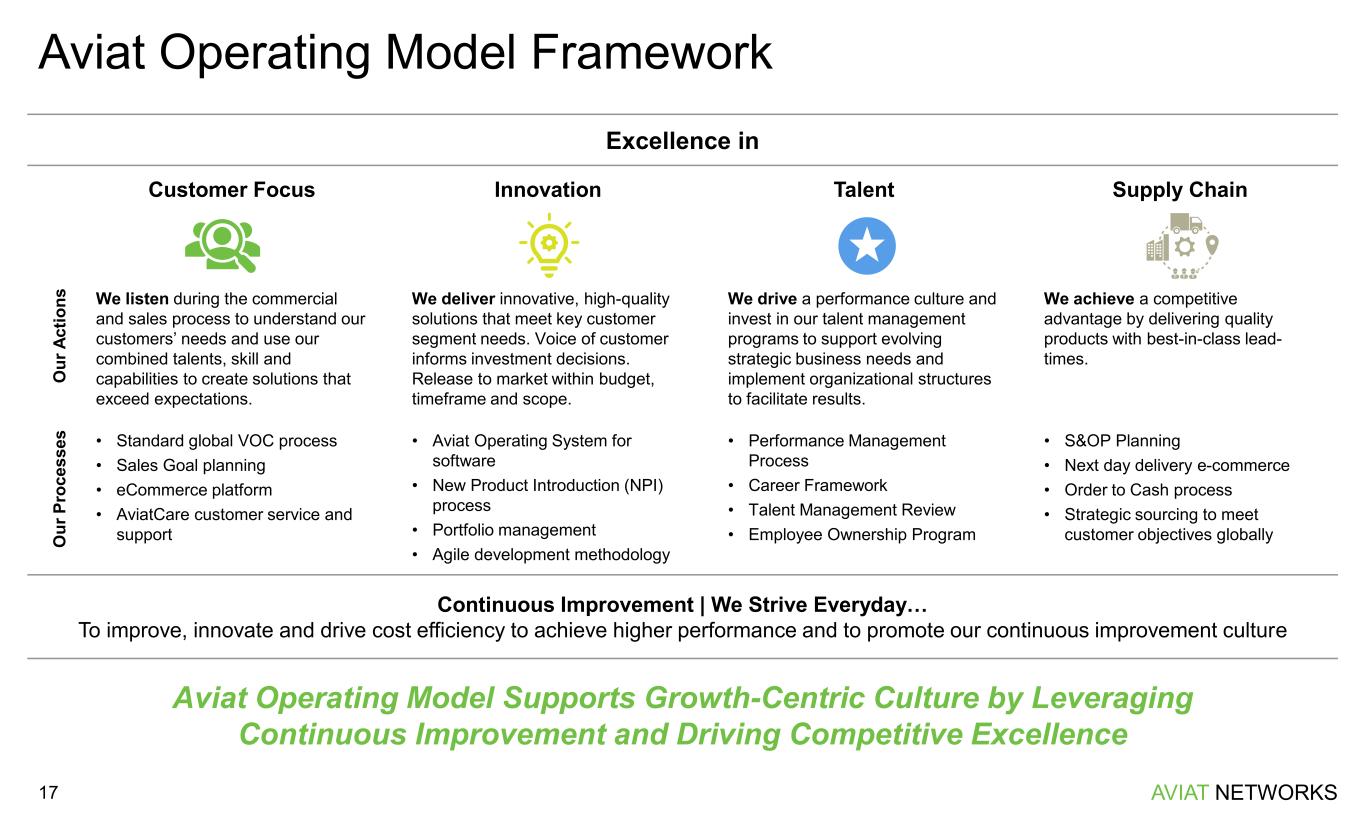 AVIAT NETWORKS17 AVIAT运营模式通过利用持续改进和推动竞争卓越来支持以增长为中心的文化AVIAT运营模式框架卓越的客户焦点创新人才供应链o u r a c ti o n我们在商业和销售过程中倾听,以了解客户的需求,并利用我们结合的人才、技能和能力来创造超出预期的解决方案。我们提供满足关键客户细分需求的创新、高质量解决方案。客户的声音为投资决策提供信息。在预算、时间范围和范围内向市场发布。我们推动绩效文化,并投资于我们的人才管理计划,以支持不断变化的战略业务需求,并实施组织结构以促进结果。我们通过交付具有一流领先时间的优质产品来实现竞争优势。O u r p o c e s s e s •标准全球VOC流程•销售目标规划•电子商务平台• AviatCare客户服务和支持• Aviat软件操作系统•新产品引入(NPI)流程•产品组合管理•敏捷开发方法•绩效管理流程•职业框架•人才管理审查•员工所有权计划• S & OP规划•次日交付电子商务•订单到现金流程•战略采购以满足客户目标全球持续改进|我们每天都在努力……改进,创新和驱动成本效率以实现更高的绩效并促进我们的持续改进文化
