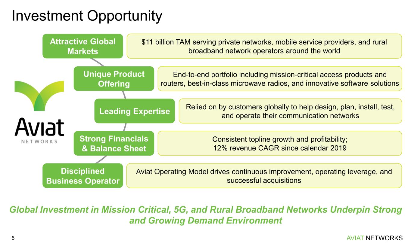 AVIAT NETWORKS4由新的领导层和超过75年的专业知识的始终如一的执行力所激励的长期无线领导地位1944年阿维亚网络的无线起源可以追溯到Lenkurt Electric 2007年Harris Stratex Networks由于Harris MCD和Stratex Networks合并而形成的形式2010年Harris Stratex更名为阿维亚网络 2020年新的管理层领导为公司带来了重新关注客户和纪律严明的运营模式2022 阿维亚网络完成了对Redline Communications的收购,将接入解决方案添加到其产品组合中2023 阿维亚网络完成对NEC微波业务(Pasolink)微波部门的收购2024 阿维亚网络完成对4RF的收购,将工业SCADA和蜂窝路由器产品添加到其接入产品组合中