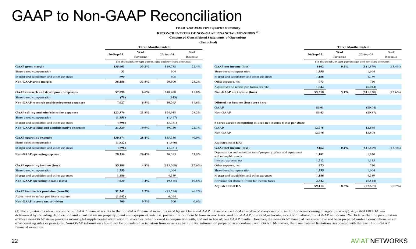 AVIAT NETWORKS22GAAP与Non-GAAP对账2026财年第一季度Non-GAAP财务措施的汇总对账(1)简明合并经营报表(未经审计)收入收入%的百分比收入收入收入收入收入收入GAAP毛利率$ 35,66333.2% $ 19,78822.4% GAAP净收入(亏损)$ 1620.2%($ 11,879)(13.4%)股份补偿33104股份补偿1,551,664并购及其他费用590608并购及其他费用1,1864,389非GAAP毛利率36,28633.8% 20,50023.2%其他费用,净额973710调整以反映备考税率1,642(6,014)GAAP研发费用$ 7,0986.6% $ 10,40811.8% Non-GAAP净收入(亏损)$ 5,5185.1%($ 11,130)(12.6%)股权报酬(71)(143)Non-GAAP研发费用7,0276.5% 10,26511.6%稀释后每股净收益(亏损):GAAP $ 0.01($ 0.94)GAAP销售和管理费用$ 23,37621.8% $ 24,94828.2% Non-GAAP $ 0.43($ 0.87)股权报酬(1,451)(1,417)并购和其他费用(596)(3,781)用于计算稀释后每股净收益(亏损)的股份Non-GAAP出售管理费用21,32919.9% 19,75022.3% GAAP 12,97612,646 Non-GAAP 12,97612,804 GAAP运营费用$ 30,47428.4% $ 35,35640.0%股权报酬(1,522)(1,560)调整后EBITDA:并购和其他费用(596)(3,781)GAAP净收入(亏损)$ 1620.2%($ 11,879)(13.4%)Non-GAAP运营费用28,35626.4% 30,01533.9%物业、厂房和设备及无形资产折旧和摊销1,1821,830利息费用,净额1,7121,115 GAAP营业收入(亏损)$ 5,1894.8%($ 15,568)(17.6%)其他费用,净973710股份报酬1,5551,664股份报酬1,5551,664并购及其他费用1,1864,389并购及其他费用1,1864,389非美国通用会计准则营业收入(亏损)7,9307.4%(9,515)(10.8%)所得税拨备(受益)2,342(5,514)调整后EBITDA 9,1128.5%(7,685美元)(8.7%)GAAP所得税拨备(收益)2,3422.2%(5,514美元)(6.2%)调整以反映备考税率(1,642)6,014非美国通用会计准则所得税拨备7000.7% 5000.6%(1)上述调整将我们的GAAP财务业绩与我们使用的非GAAP财务指标进行了核对。我们的非美国通用会计准则净利润不包括基于股份的薪酬,以及其他非经常性费用(回收)。调整后的EBITDA是通过从GAAP净收入中剔除物业、厂房和设备的折旧和摊销、利息、所得税拨备或收益以及如上所述的非GAAP税前调整确定的。我们认为,这些非公认会计原则项目的介绍为投资者提供了有意义的补充信息,当与我们的公认会计原则结果结合起来看时,而不是代替我们的结果。然而,非美国通用会计准则财务指标并未在一套全面的会计规则或原则下编制。非GAAP信息不应与根据GAAP编制的信息分开考虑,或作为其替代。此外,使用非公认会计准则财务指标存在重大限制。(单位:千,百分比和每股金额除外)截至26-Sep-25 27-Sep-24止三个月(单位:千,百分比和每股金额除外)截至26-Sep-25 27-Sep-24止三个月
