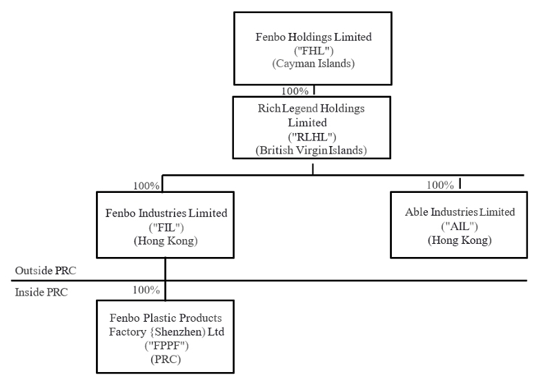 FHL是一家在开曼群岛注册成立的控股公司,没有自己的实质性业务。我们通过我们的子公司Fenbo Industries Limited(“FIL”)和Able Industries Ltd.(“AIL”)(均在香港注册成立)在香港开展业务,并通过在中华人民共和国(“中国”或“中国”)注册成立的Fenbo Plastic Products Factory(Shenzhen)Ltd.(“FPPF”)(FIL、AIL和FPPF,统称“运营子公司”)在中国开展业务。我们直接持有我们在中国和香港的运营子公司的股权,我们目前没有使用可变利益实体(“VIE”)结构。