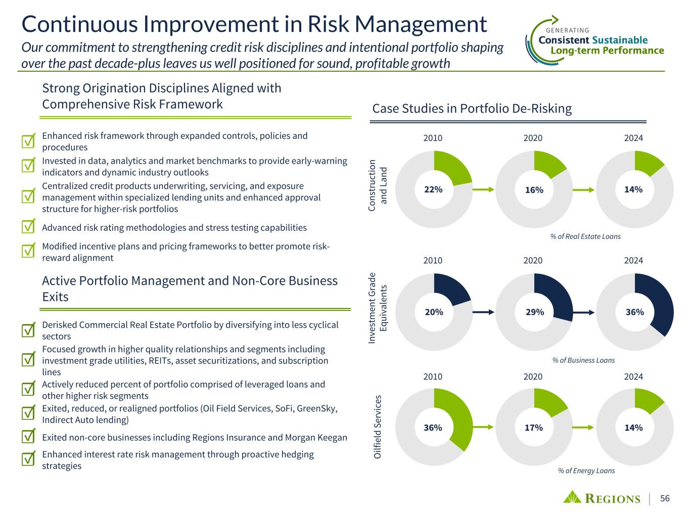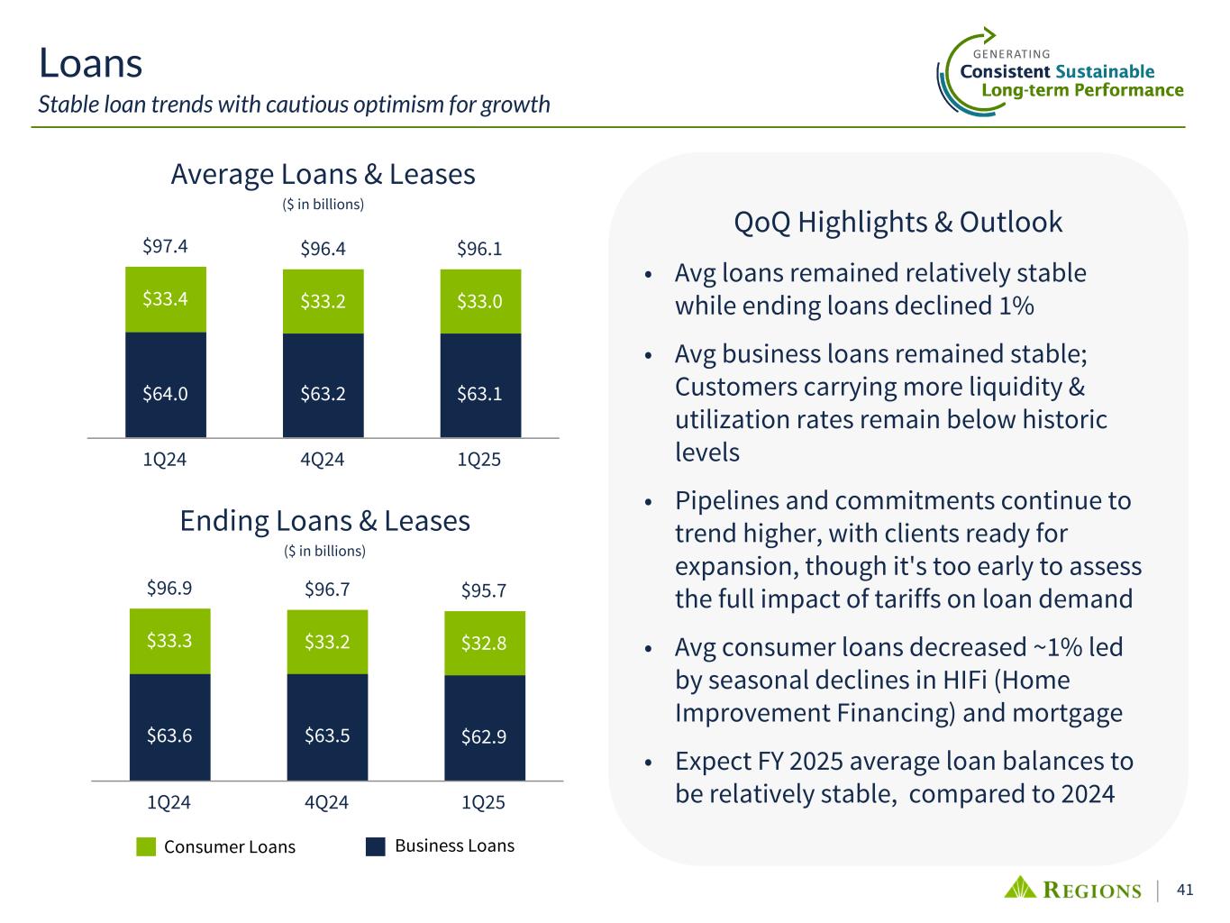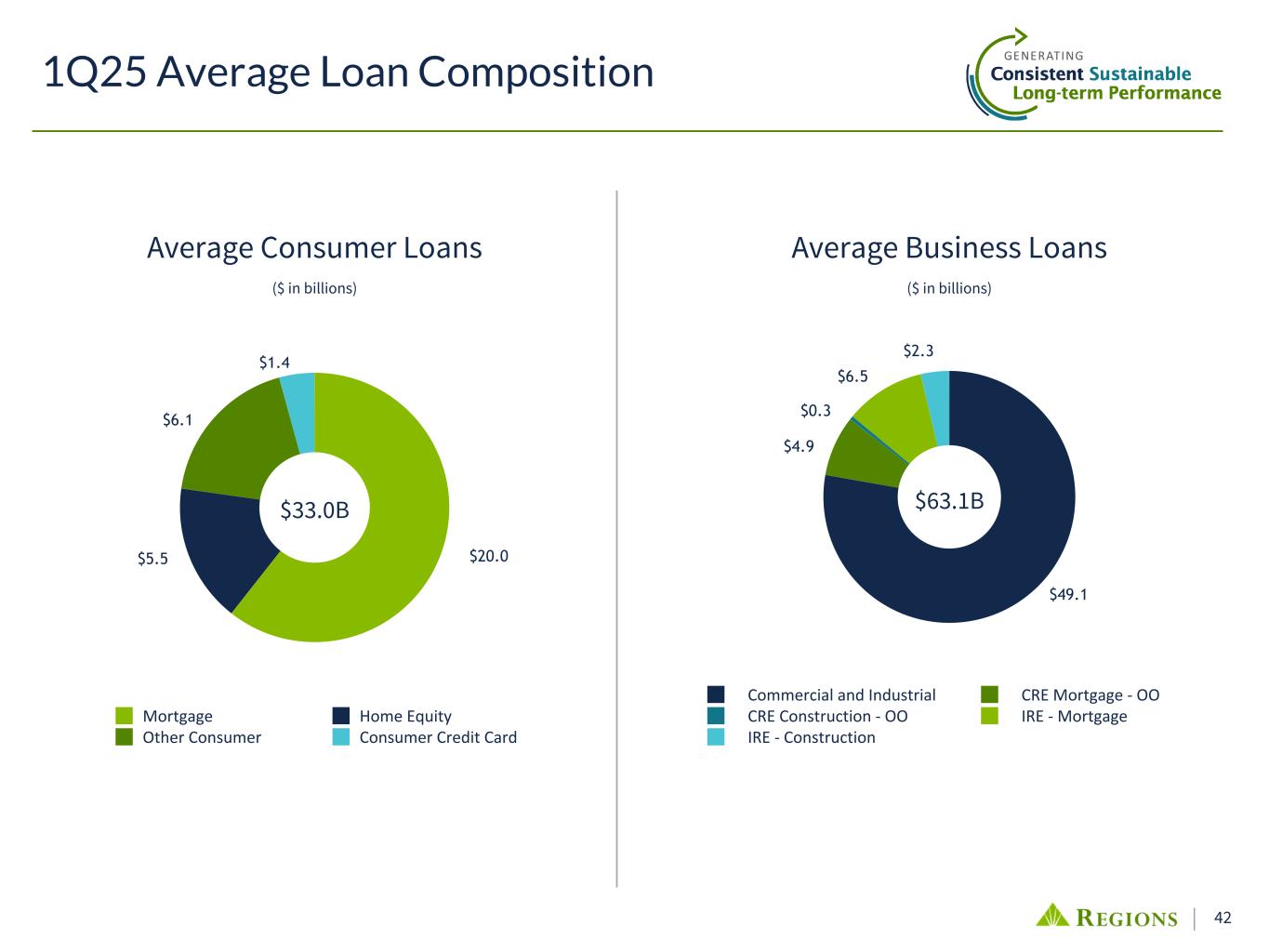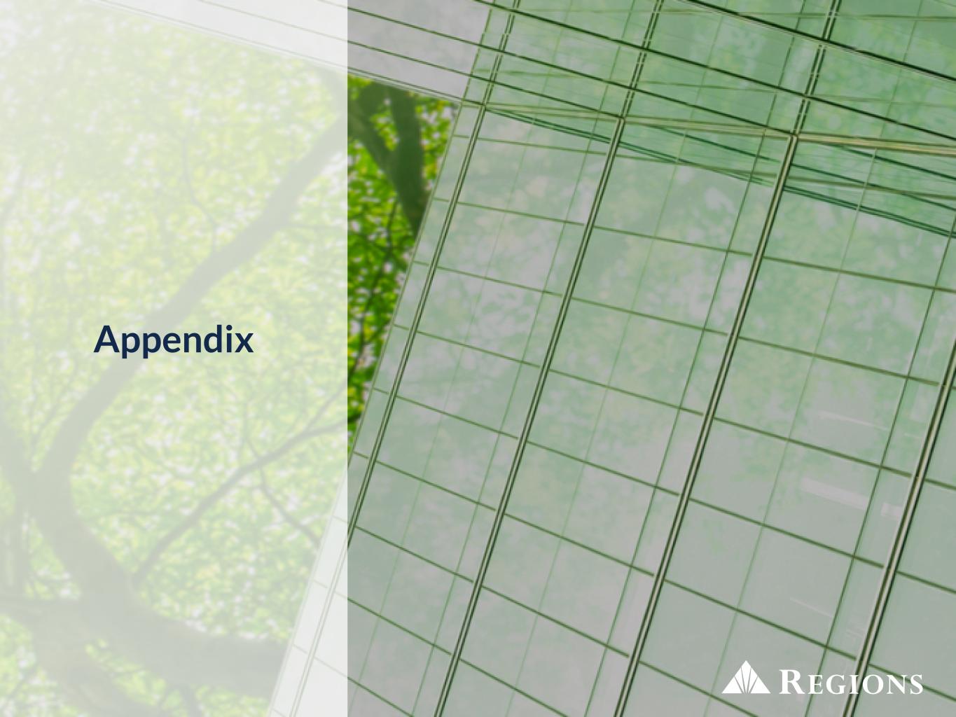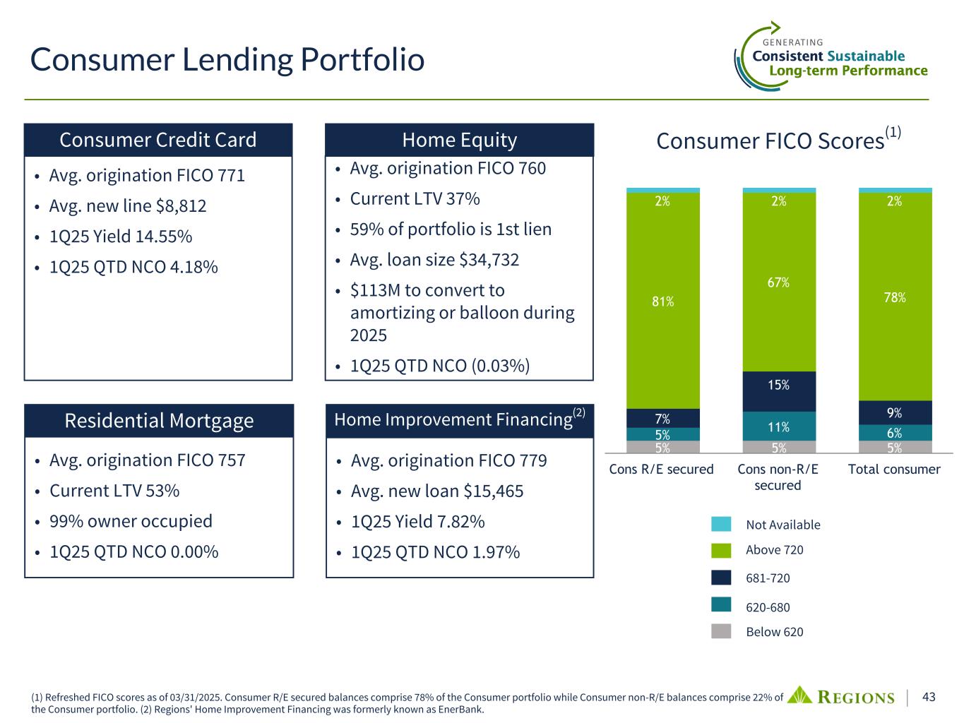 43个消费贷款组合•平均发起FICO 757 •当前LTV 53% •99%所有者占用• 25年第一季度QTD NCO 0.00 %•平均发起FICO 760 •当前LTV 37% •投资组合的59%为第一留置权•平均贷款规模34,732美元• 1.13亿美元转换为摊销或在2025年期间出现气球• 2015年第一季度QTD NCO(0.03%)•平均发起FICO 779 •平均新贷款15,465美元• 25年第一季度收益率7.82% • 25年第一季度QTD NCO 1.97% ••平均发起FICO 771 •平均新线8,812美元• 25年第一季度收益率14.55% • 25年第一季度QTD NCO 4.18% 5% 5% 5% 5% 5% 5% 11% 6% 7% 15% 9% 81% 67% 78% 2% 2% cons R/E有担保Cons non-R/E有担保总消费者不能高于720 620-680低于620 681-720消费者FICO评分(1)(1)更新截至2025年3月31日的FICO评分。消费者R/E担保余额占消费者投资组合的78%,而消费者非R/E余额占消费者投资组合的22%。(2)Regions的家装融资前身为EnerBank。住宅抵押消费信用卡家居净值家装融资(二)