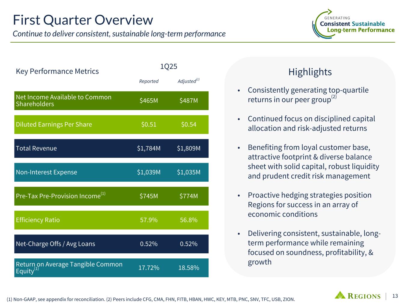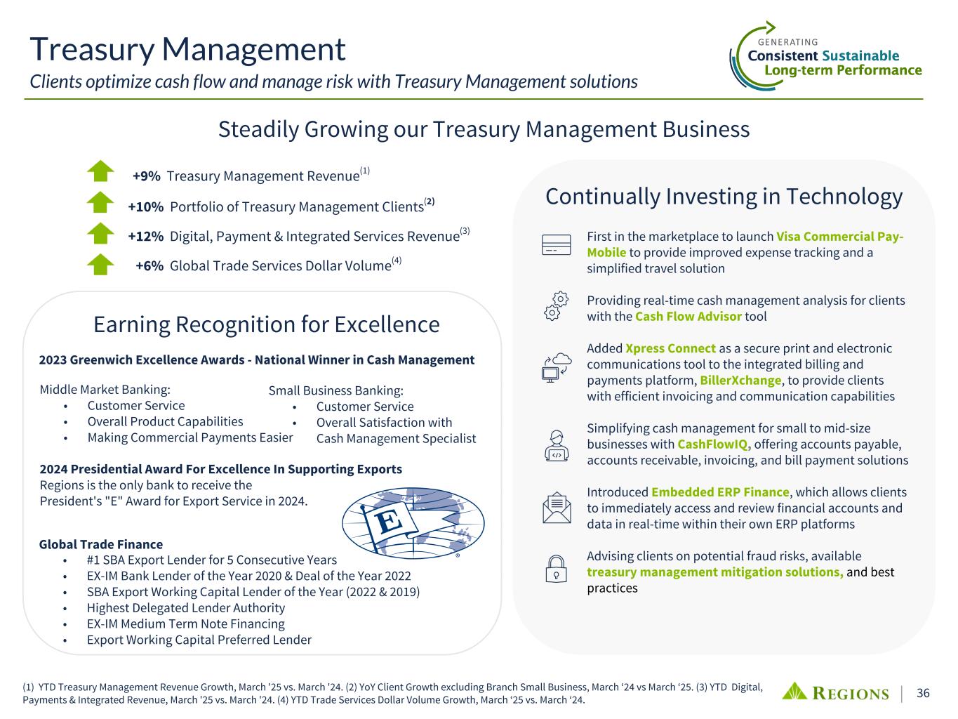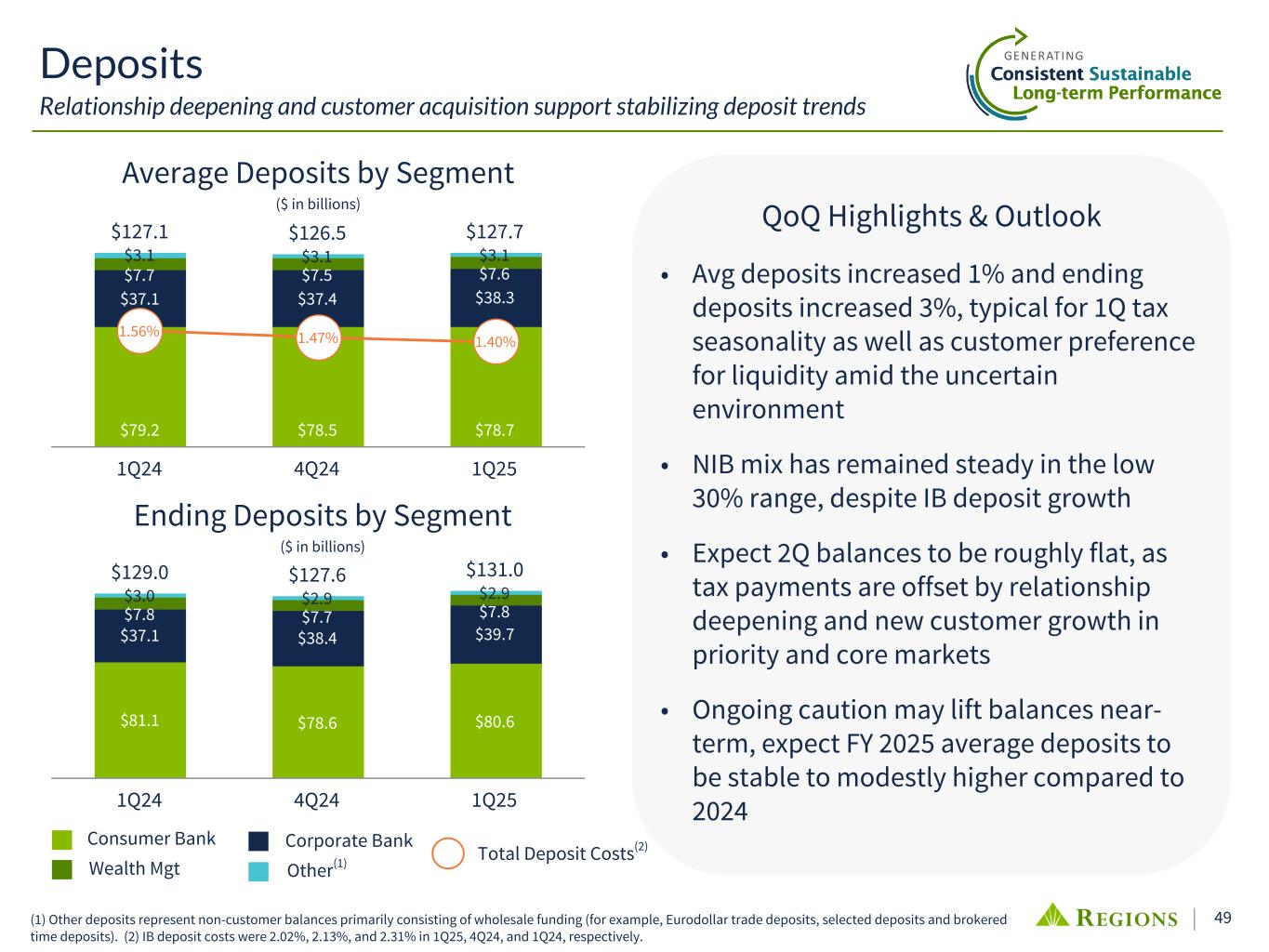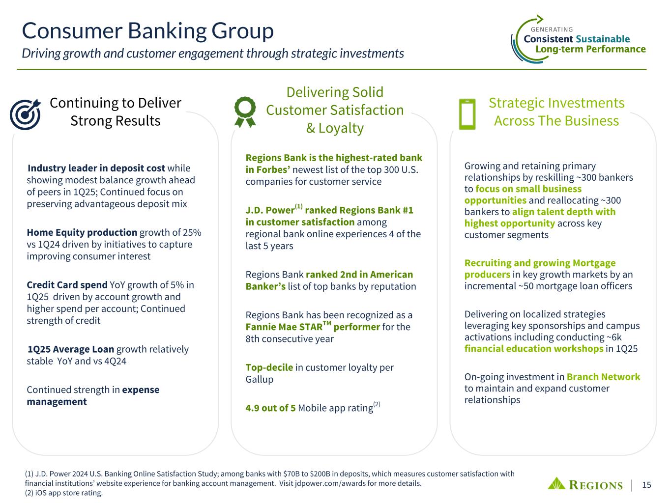 15个人银行集团通过战略投资推动增长和客户参与度存款成本行业领先,同时在25年第一季度显示出领先于同行的适度余额增长;继续专注于保持具有优势的存款组合房屋净值生产增长25%与24年第一季度相比,这是由捕捉消费者兴趣改善的举措推动的,信用卡支出在25年第一季度同比增长5%,这是由账户增长和每个账户的支出增加推动的;信贷持续强劲25年第一季度平均贷款增长相对稳定同比以及vs 4Q24费用管理持续走强(1)J.D. Power 2024美国银行业在线满意度研究;在拥有$ 70B至$ 200B存款的银行中,衡量客户对金融机构的银行账户管理网站体验的满意度。访问jdpower.com/awards了解更多详情。(2)iOS应用商店评级。Regions Bank是《福布斯》最新美国客户服务300强企业榜单中评级最高的银行J.D. Power(1)在区域银行在线体验中客户满意度排名第一Regions Bank在过去5年中排名4 Regions Bank在American Banker的声誉顶级银行榜单中排名第2 Regions Bank连续8年被公认为Fannie Mae STARTM表现者,客户忠诚度最高,盖洛普评分为4.9分(满分5分)移动应用评分(2)提供坚实的客户满意度和不断增长的忠诚度并通过对约300名银行家进行再培训以专注于小型商业机会和重新分配约300名银行家以使人才深度与关键客户群中的最高机会保持一致来保留主要关系,通过增加约50名抵押贷款信贷员在关键增长市场招聘和增长抵押贷款生产商,利用关键赞助和校园活动交付本地化战略,包括在2015年第一季度开展约6k场金融教育研讨会对分行网络的持续投资,以维持和扩大整个业务的客户关系战略投资继续提供强劲的结果