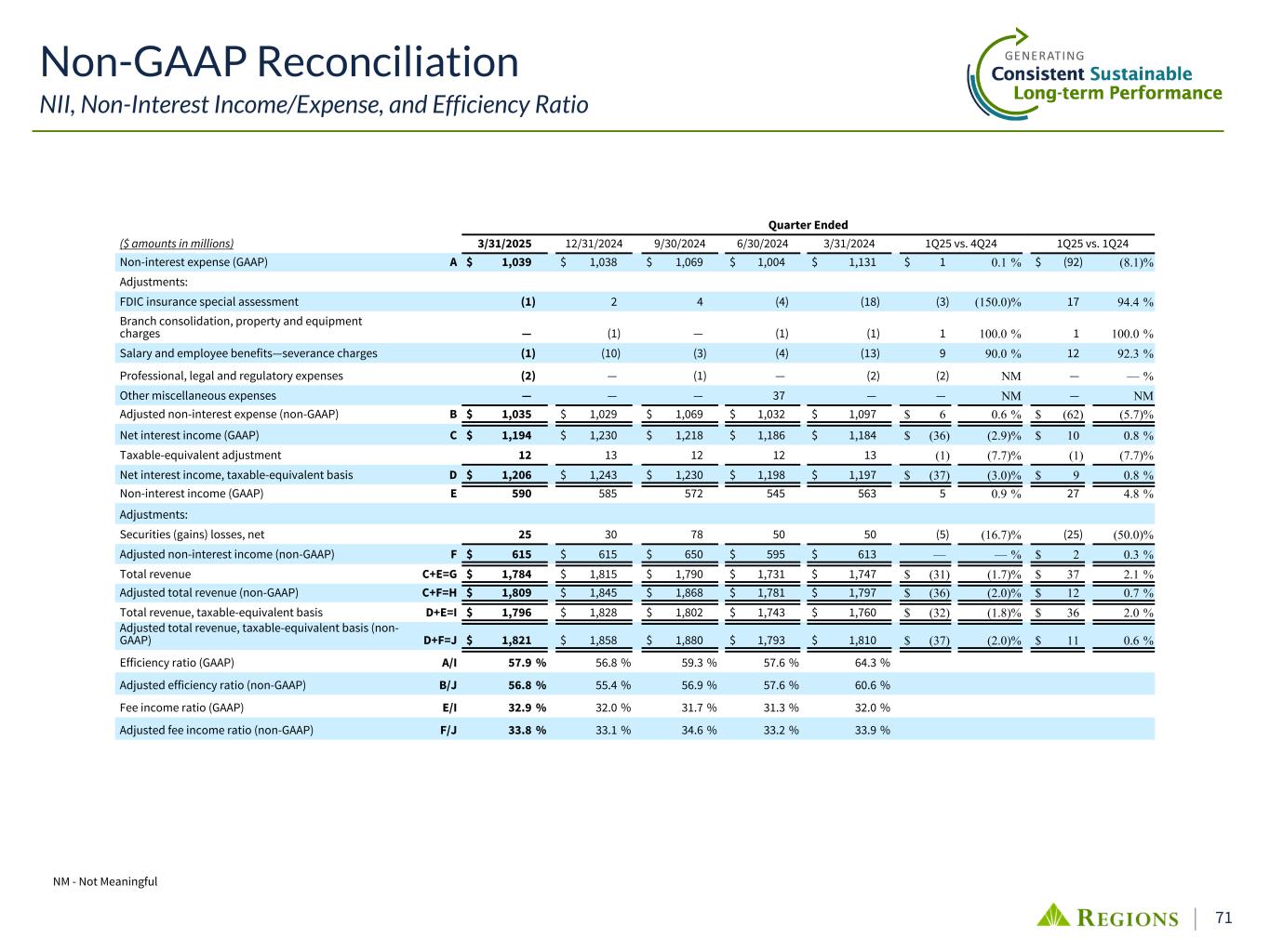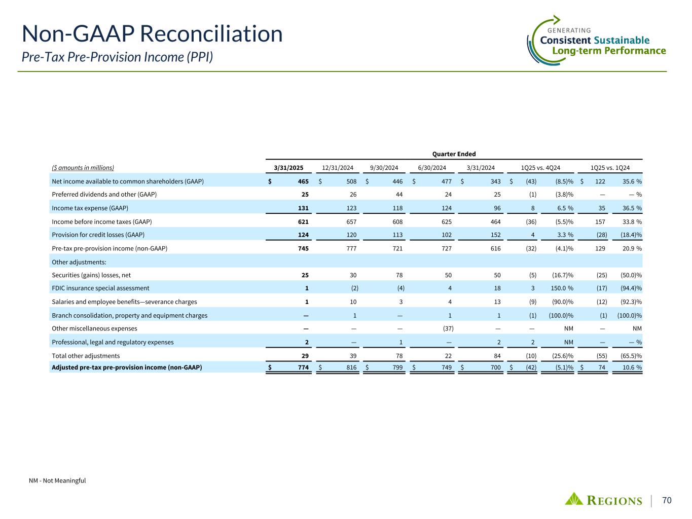 70 Non-GAAP调节税前拨备前收入(PPI)季度末(百万美元)3/31/202512/31/20249/30/20246/30/20243/31/2024 1Q25 vs. 4Q24 1Q25 vs. 1Q24普通股股东可获得的净收入(GAAP)$ 465 $ 508 $ 446 $ 477 $ 343 $(43)(8.5)% $ 12235.6%优先股息其他(GAAP)2526442425(1)(3.8)% ——%所得税费用(GAAP)1311231181249686.5% 3536.5%所得税前收入(GAAP)621657608625464(36)(5.5)% 15733.8%信用损失准备金(GAAP)12412011310215243.3%(28)(18.4)%税前拨备前收入(non-GAAP)745777721727616(32)(4.1)% 12920.9%其他调整:证券(收益)损失,净额2530785050(5)(16.7)%(25)(50.0)% FDIC保险特别评估1(2)(4)4183150.0%(17)(94.4)%工资和雇员福利—遣散费1103413(9)(90.0)%(12)(92.3)%分支机构合并、财产和设备费用— 1 — 11(1)(100.0)%(1)(100.0)%其他杂项费用————(37)—— NM—NM Professional,法律和监管费用2 — 1 — 22 NM ——%其他调整合计2939782284(10)(25.6)%(55)(65.5)%调整后税前拨备前收入(非公认会计准则)$ 774 $ 816 $ 799 $ 749 $ 700 $(42)(5.1)% $ 7410.6% NM-没有意义