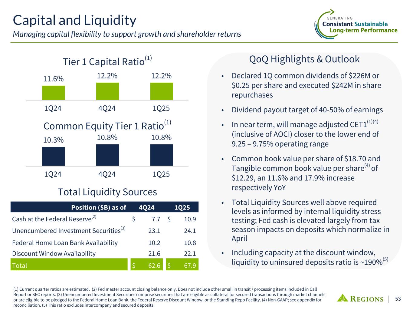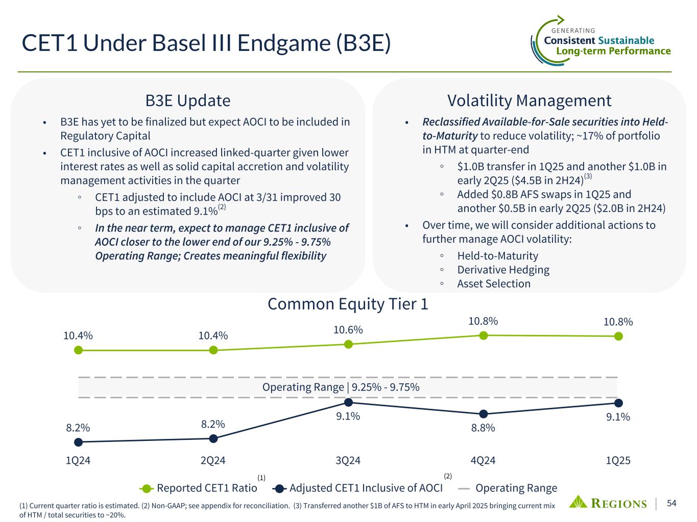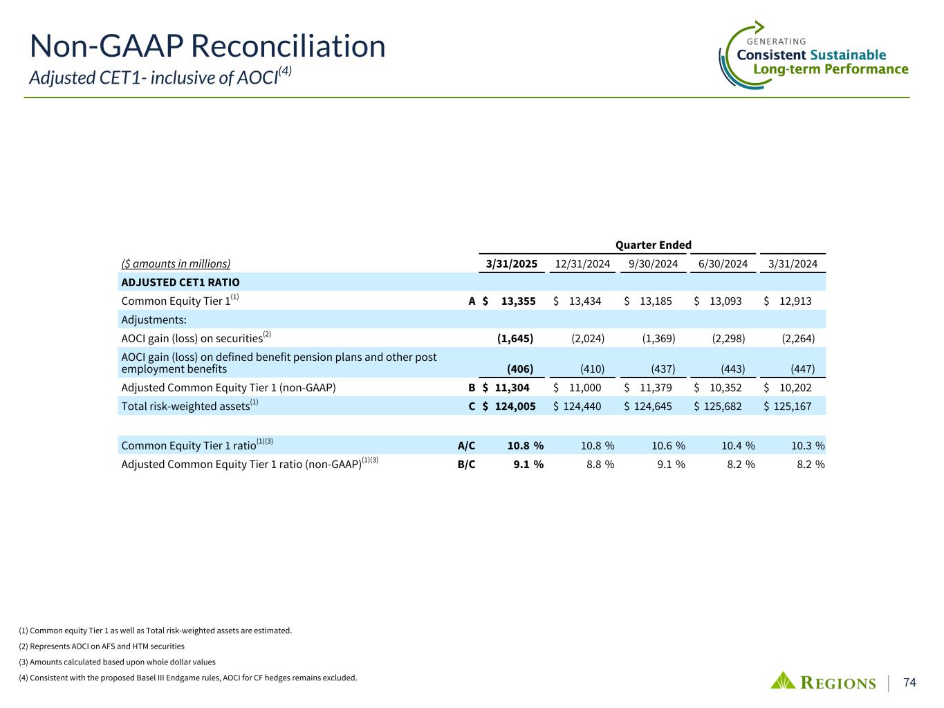 74季度末(百万美元)3/31/202512/31/20249/30/20246/30/20243/31/2024调整后CET1比率普通股一级(1)A $ 13,355 $ 13,434 $ 13,185 $ 13,093 $ 12,913调整:AOCI收益(损失)证券(2)(1,645)(2,024)(1,369)(2,298)(2,264)AOCI收益(损失)固定福利养老金计划和其他离职后福利(406)(410)(437)(443)(447)调整后普通股一级(非公认会计原则)B $ 11,304 $ 11,000 $ 11,379 $ 10,352 $ 10,202风险加权资产总额(1)C $ 124,005 $ 124,440 $ 124,645 $ 125,682 $ 125,167普通股一级比率(1)(3)A/C 10.8% 10.8% 10.6% 10.4% 10.3%调整后普通股一级比率(非公认会计原则)(1)(3)B/C 9.1% 8.8% 9.1% 8.2% 8.2%非公认会计原则调节调整后的CET1-包括AOCI(4)(1)普通股一级以及风险加权资产总额为估计数。(2)代表AFS和HTM证券的AOCI(3)根据整美元价值计算的金额(4)与拟议的巴塞尔III终局规则一致,CF对冲的AOCI仍被排除在外。