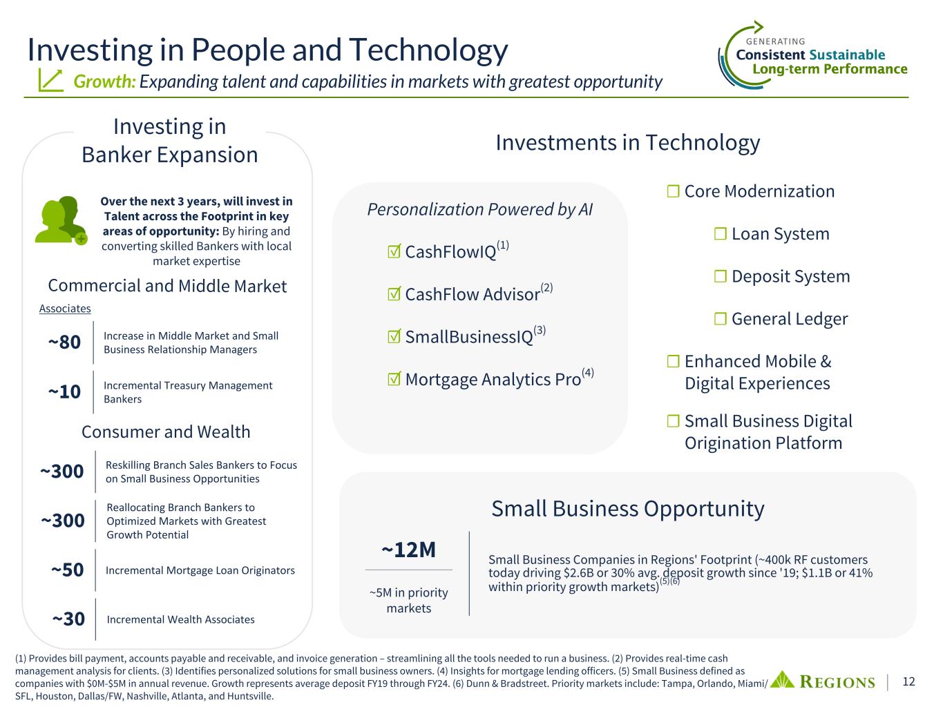 11‘25-’30人口复合年增长率0.48% 0.71% 1.10%美国地区足迹优先市场优先市场增长机会(1)1.1% 1.1% 0.9% 0.7% 1.4% 1.8% 1.2% 1.4%纳什维尔坦帕亚特兰大迈阿密/SFL奥兰多亨茨维尔休斯顿达拉斯/FW建立在我们成功增长的基础上:对优先市场的战略投资推动存款扩张(1)优先市场包括:坦帕、奥兰多、迈阿密/SFL、休斯顿、达拉斯/FW、纳什维尔、亚特兰大和亨茨维尔。(2)截至2024年6月优先市场的射频存款。数据来源:FDIC存款数据。(3)资料来源:标普 Capital IQ。标普的人口统计数据由Claritas主要根据美国人口普查数据提供。百分比增长代表该期间的复合年增长率。截至2025年4月28日,所有标普 Cap IQ数据均有拉动。(4)数十亿美元。Nat‘l avg:0.48%优先市场25-’30年预计人口增长(3)50% vs. 34%地区存款增长(1)自19年以来超过市场继续投资于优先市场证明了成功的往绩记录..。最大化增长机会(3)$ 1.5T存款机会(RF $ 38B)(2)建立在成功的基础上,增量投资支持增长,同时保持在核心业务和市场的优势。6 of 8 priority markets(1)Gaining share since 2019 $ 12.5b deposit growth in priority markets(1)since 2019 deposits(4)MKT share rank $ 10.2 11.0% 3 $ 6.57.6% 5 $ 5.7 2.5% 7 $ 5.4 1.6% 13 $ 2.8 3.8% 6 $ 2.62 3.1% 1 $ 2.3 0.74% 16 $ 2.2 0.54% 20