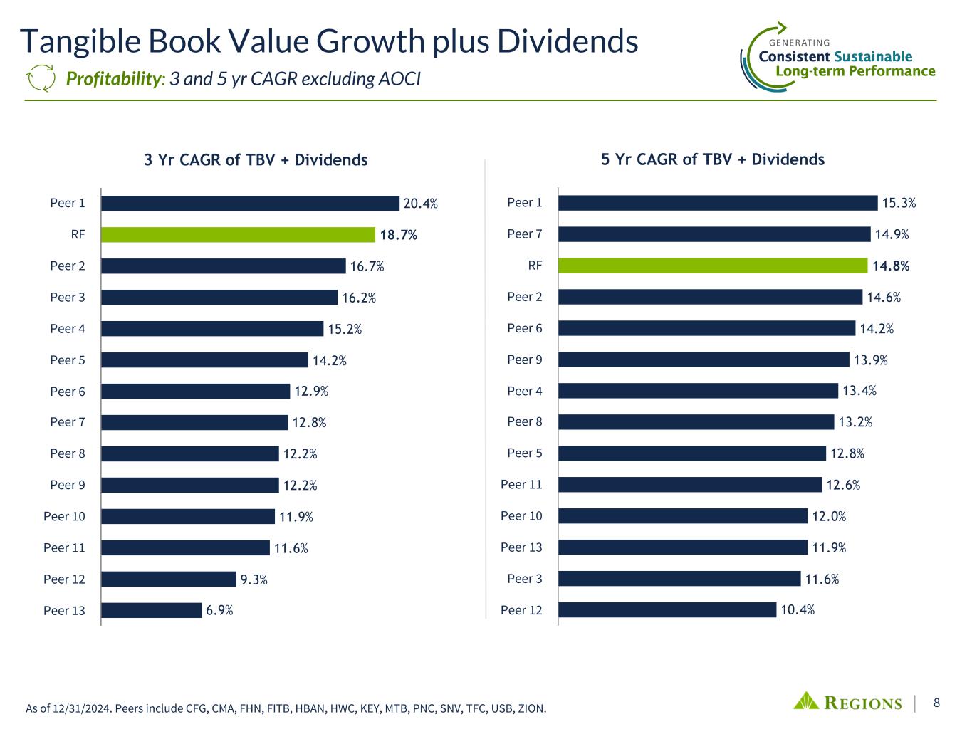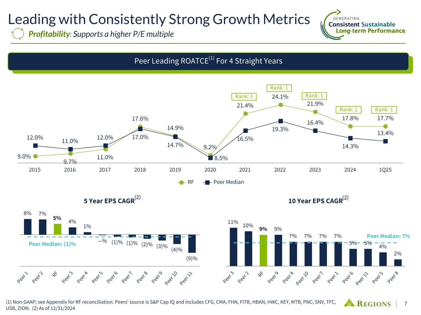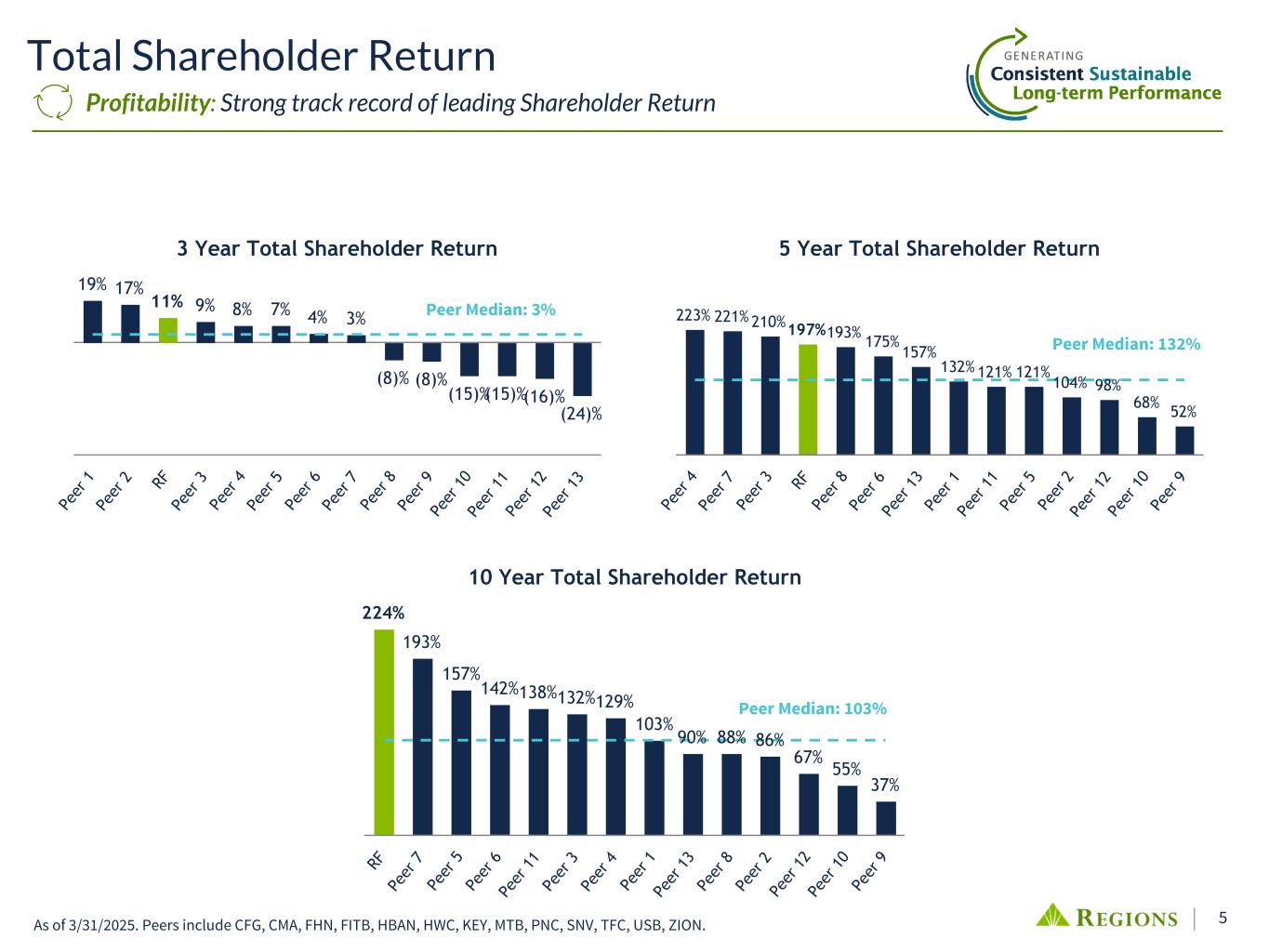 53年股东总回报19% 17% 11% 9% 8% 7% 4% 3%(8)%(8)%(15)%(15)%(15)%(15)%(16)%(24)% Pe er 1 Pe er 2 RF Pe er 3 Pe er 4 Pe er 5 Pe er 6 Pe er 7 Pe er 8 Pe er 9 Pe er 10 Pe er 11 Pe er 12 Pe er 135 Year Total Shareholder Return 223% 221% 210% 193% 193% 175% 157% 132% 121% 121% 104% 98% 68% 52% Pe er 4 Pe er 7 Pe er 3 RF Pe er 8 Pe er 6 Pe er 13 Peer 1 PE er 11 PE er 5 PE er 2 PE er 12 PE er 10 PE er 9 Total Shareholder Return 10 Year Total Shareholder Return 224% 193% 157% 142% 138% 132% 129% 103% 90% 88% 86% 67% 55% 37% RF PE er 7 PE er 5 PE er 6 PE er 11 PE er 3 PE er 4 PE er 1 PE er 13 PE er 8 PE er 2 PE er 12 PE er 10 PE er 9 Peer Median:3% Peer Median:132% Peer Median:103% As of 3/31/2025。同行有CFG、CMA、FHN、FITB、HBAN、HWC、KEY、MTB、PNC、SNV、TFC、USB、ZION。盈利能力:领先股东回报的强劲业绩记录