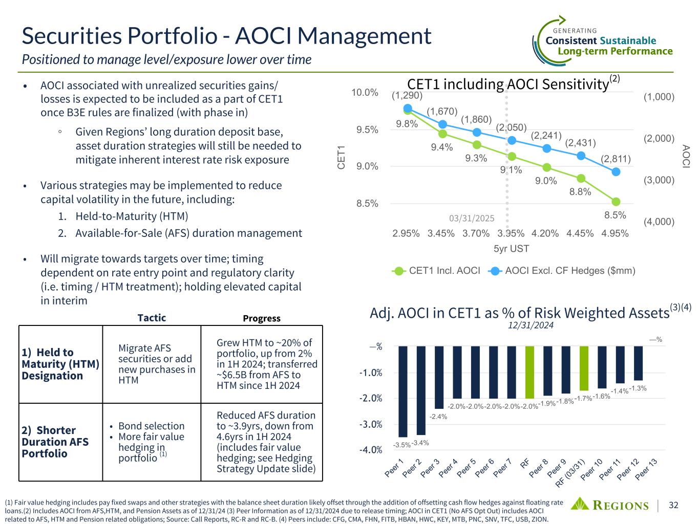 32 •一旦B3E规则最终确定(分阶段实施),与未实现证券收益/损失相关的AOCI预计将作为CET1的一部分被纳入丨鉴于各地区的长期存款基础,仍需要资产久期策略来减轻固有的利率风险敞口•未来可能会实施各种策略来降低资本波动,包括:1。持有至到期(HTM)2。可供出售(AFS)久期管理•将随着时间推移向目标迁移;时间取决于利率切入点和监管明确性(即时序/HTM处理);在中期持有较高的资本(1)公允价值套期保值包括支付固定掉期和其他策略,资产负债表久期可能通过增加浮动利率贷款的现金流对冲来抵消。(2)包括截至12/31/24来自AFS、HTM和养老金资产的AOCI(3)由于发布时间,截至12/31/2024的同行信息;CET1中的AOCI(无AFS选择退出)包括与AFS相关的AOCI,HTM和养老金相关义务;来源:Call Reports,RC-R和RC-B。(4)同行包括:CFG、CMA、FHN、FITB、TERM2、HBAN、HWC、KEY、MTB、TERM5、TERMPNCPNC、SNV、TERM7、TFC、USB、ZION。证券投资组合-AOCI管理层定位于随着时间的推移管理较低水平/风险敞口-3.5 %-3.4 %-2.4 %-2.0 %-2.0 %-2.0 %-1.9 %-1.8 %-1.7 %-1.6 %-1.4 %-1.3 %—% PEE r 1 PEE r 2 PEE r 3 PEE r 4 PEE r 5 PEE r 6 PEE r 7 RF PEE r 8 PEE r 9 RF(03/31)PEE r 10 PEE r 11 PEE r 12 PEE r 13-4.0 %-3.0 %-2.0 %-1.0 %—% Adj. AOCI in CET1占风险加权资产的百分比(3)(4)12/31/2024战术进展1)持有至到期(HTM)指定迁移AFS证券或在HTM中增加新的购买增加了HTM至投资组合的约20%,高于2024年上半年的2%;自2024年上半年以来从AFS向HTM转移了约6.5B美元2)更短的久期AFS投资组合•债券选择•投资组合中更多的公允价值对冲(1)将AFS久期降低至~3.9年,低于2024年上半年的4.6年(包括公允价值套期保值;见对冲策略更新幻灯片)5年期UST C E T1 A O C I 9.8% 9.4% 9.3% 9.1% 9.0% 8.8% 8.5%(1,290)(1,670)(1,860)(2,050)(2,241)(2,431)(2,811)CET1 Incl。AOCI AOCI不限成员名额。CF对冲($ mm)2.95% 3.45% 3.70% 3.95% 4.20% 4.45% 4.95% 8.5% 9.0% 9.5% 10.0%(4,000)(3,000)(2,000)(1,000)CET1包括AOCI敏感性(2)03/31/2025