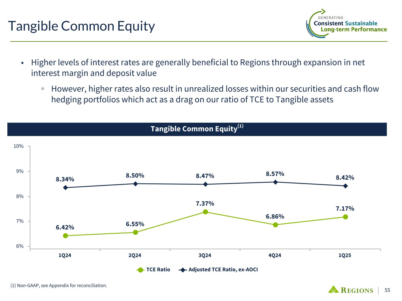 556.42% 6.55% 7.37% 6.86% 7.17% 8.34% 8.50% 8.47% 8.57% 8.42% TCE比率调整后TCE比率,前AOCI 1Q24 2Q24 3Q24 4Q24 1Q25 6% 7% 8% 9% 10%有形普通股权益(1)非美国通用会计准则,调节见附录。•更高的利率水平通常通过净息差和存款价值的扩大而对各地区有利丨然而,更高的利率也会导致我们的证券和现金流对冲投资组合出现未实现的损失,从而拖累我们的TCE与有形资产有形普通股权益的比率(1)
