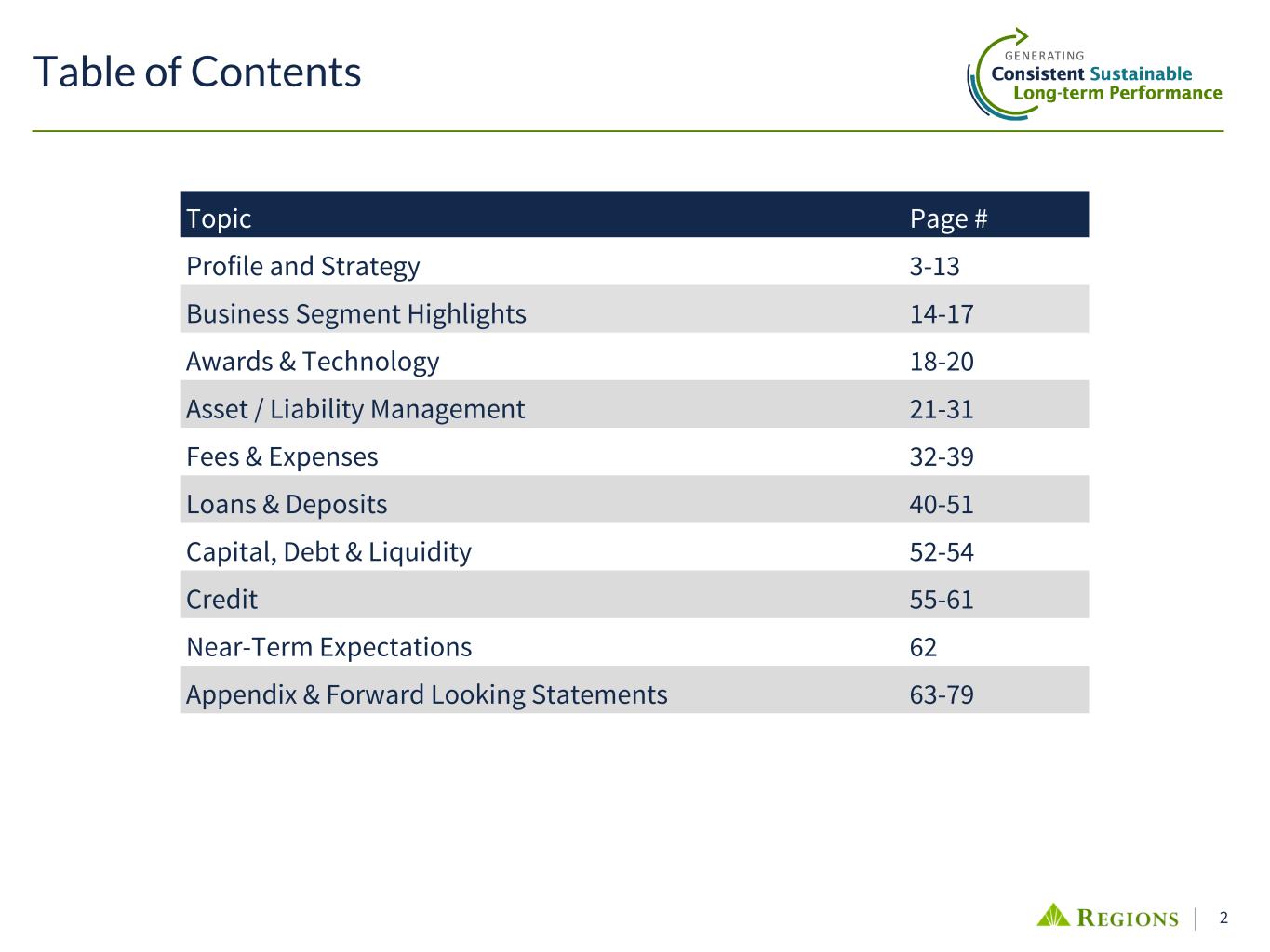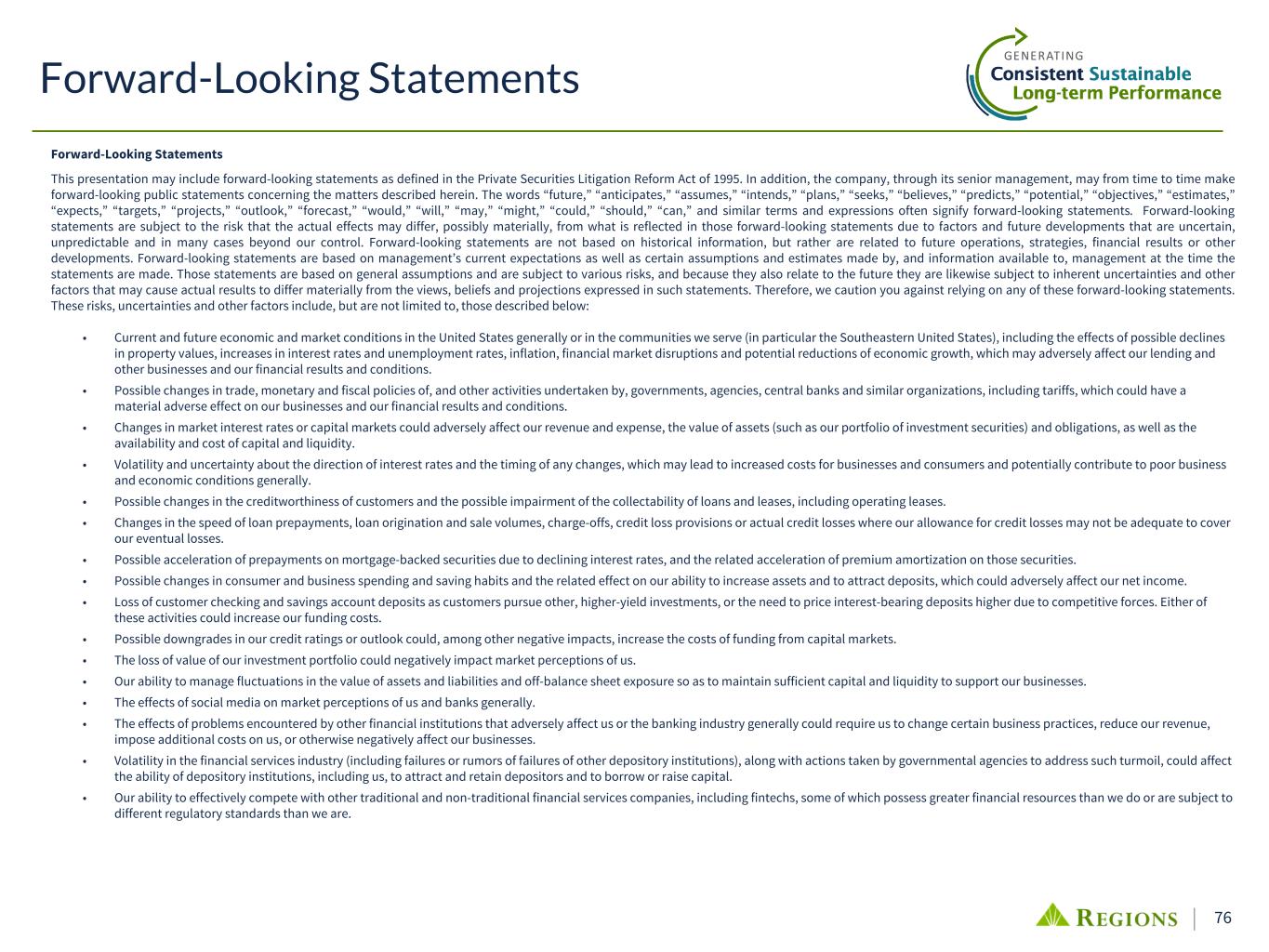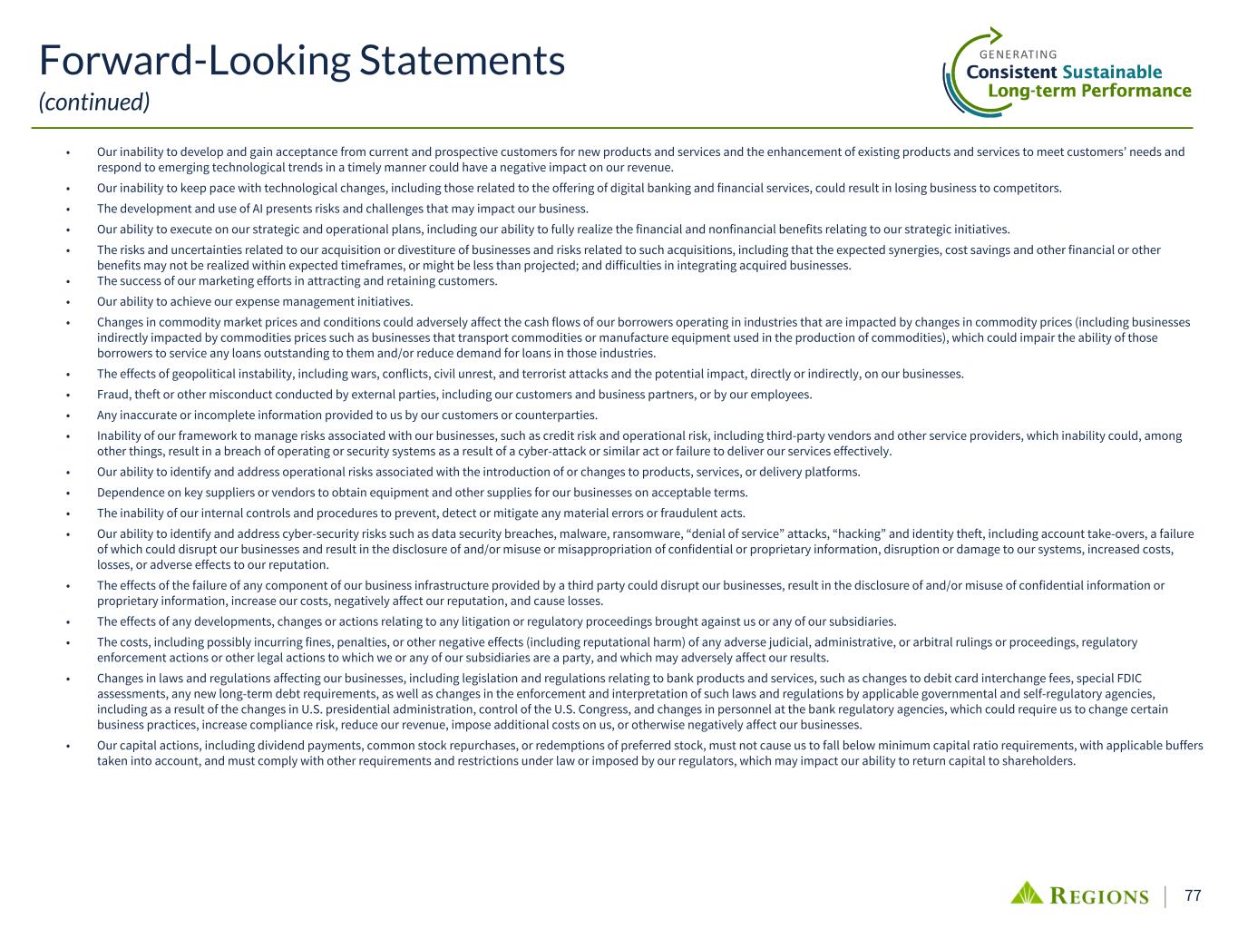 78 •由于此类测试和要求的重要性,我们遵守压力测试和资本规划要求的能力(作为CCAR流程或其他方面的一部分)可能继续需要我们管理资源的大量投资。•我们遵守适用的资本和流动性要求(其中包括《巴塞尔协议III规则》)的能力,包括我们在内部产生资本或以优惠条件筹集资本的能力,如果我们未能达到要求,我们的财务状况和市场对我们的看法可能会受到负面影响。•我们招聘和留住有才干和有经验的人员以协助我们的产品和服务的开发、管理和运营的能力可能会受到不时生效的法律法规变化的影响。•我们从子公司,特别是地区银行获得股息的能力,可能会影响我们的流动性和向股东支付股息的能力。•我们的普通股价格波动以及无法在时间框架内和/或按照预期条款完成股票回购。•我们的公司注册证书和章程中的反收购法律和专属法院地条款的影响。•新税法的影响和/或对现有税法的解释,这可能会影响我们的收益、资本比率以及我们向股东返还资本的能力。• FASB或其他监管机构可能要求的会计政策或程序变更可能会对我们的财务报表以及我们报告这些结果的方式产生重大影响,而有关此类变更将如何影响我们的财务结果的预期和初步分析可能被证明是不正确的。•由于税法变化、报告单位经营下滑的经济环境的不利变化或其他因素,我们的商誉或其他无形资产的任何减值、资产的任何重新定价或我们的递延税项资产的估值备抵的任何调整。•人为和自然灾害的影响,包括火灾、洪水、干旱、龙卷风、飓风和环境破坏(尤其是在美国东南部),这可能会对我们的运营和/或我们的贷款组合产生负面影响,并增加我们开展业务的成本。未来地震、火灾、飓风、龙卷风、干旱、洪水等与天气有关的事件的严重程度和频率难以预测,并可能因全球气候变化而加剧。•大流行对我们的业务、运营以及财务业绩和状况的影响。任何大流行的持续时间和严重程度以及与此类事件相关的政府行为或其他限制都可能扰乱全球经济,对我们的资本和流动性状况产生不利影响,损害借款人偿还未偿还贷款的能力并增加我们的信贷损失准备金,损害抵押品价值并导致收入损失或额外费用。•与上述任何项目相关的事态发展对我们声誉造成的任何损害的影响。•我们向SEC提交的报告中不时发现的其他风险。上述因素清单并不详尽。有关这些和其他可能导致实际结果与预期不同的因素的讨论,请查看各地区截至2024年12月31日止年度的10-K表格年度报告以及各地区随后向SEC提交的文件中的标题“前瞻性陈述”和“风险因素”。您不应过分依赖任何前瞻性陈述,这些陈述仅在作出之日起生效。可能导致我们的实际结果不同的因素或事件可能会不时出现,并不可能预测所有这些因素或事件。我们不承担任何义务,也不打算更新或修改由于未来发展、新信息或其他原因而不时作出的任何前瞻性陈述,除非法律可能要求。Regions的投资者关系联系人为达纳 Nolan,电话:(205)264-7040;Regions的媒体联系人为Jeremy King,电话:(205)264-4551。前瞻性陈述(续)