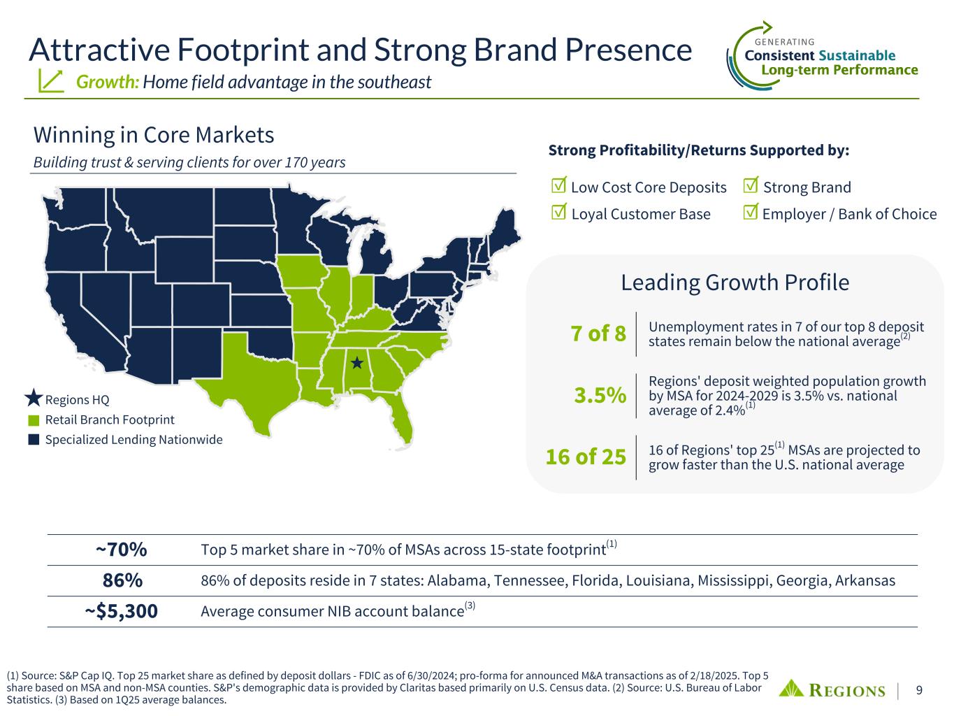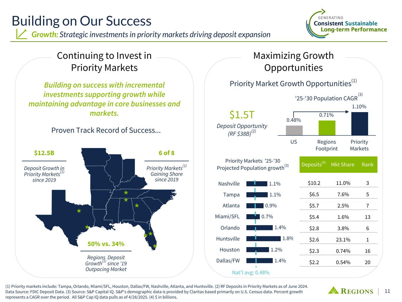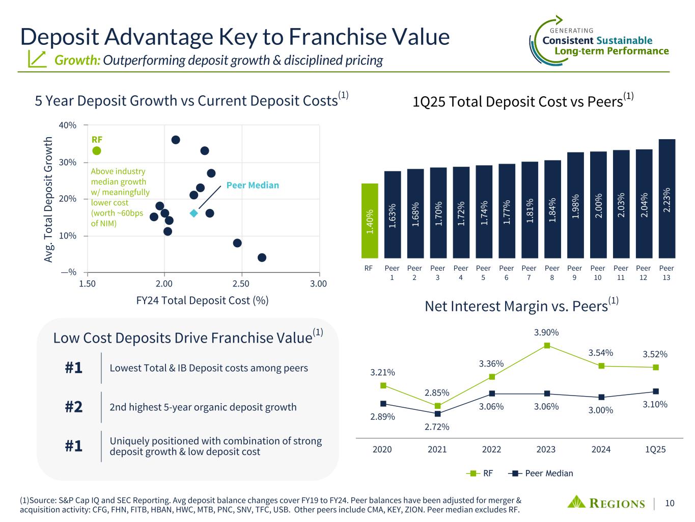 9领先的增长概况有吸引力的足迹和强大的品牌影响力增长:东南地区的主场优势总部零售分行足迹专业贷款全国制胜核心市场建立信任&服务客户超过170年强大的盈利能力/回报支持:☑低成本核心存款☑强势品牌☑忠诚的客户群☑雇主/首选银行~70%在15个州的约70%的MSA中的前5名市场份额(1)86% 86%的存款分布在7个州:阿拉巴马州、田纳西州、佛罗里达州、路易斯安那州、密西西比州、佐治亚州,阿肯色州~5,300美元的消费者NIB账户平均余额(3)我们排名前8位的存款州中有7个州的8个失业率中有7个州的失业率仍低于全国平均水平(2)3.5%各地区2024-2029年按MSA计算的存款加权人口增长率为3.5%,而全国平均水平为2.4%(1)2516个地区的前25名中有16个州(1)MSA的增长速度预计将快于美国全国平均水平(1)资料来源:标普 CAP IQ。按存款美元定义的前25名市场份额-截至2024年6月30日的FDIC;截至2025年2月18日已宣布的并购交易的备考。基于MSA和非MSA县的前5名份额。标普的人口统计数据由Claritas提供,主要基于美国人口普查数据。(2)资料来源:美国劳工统计局。(3)基于1Q25平均余额。