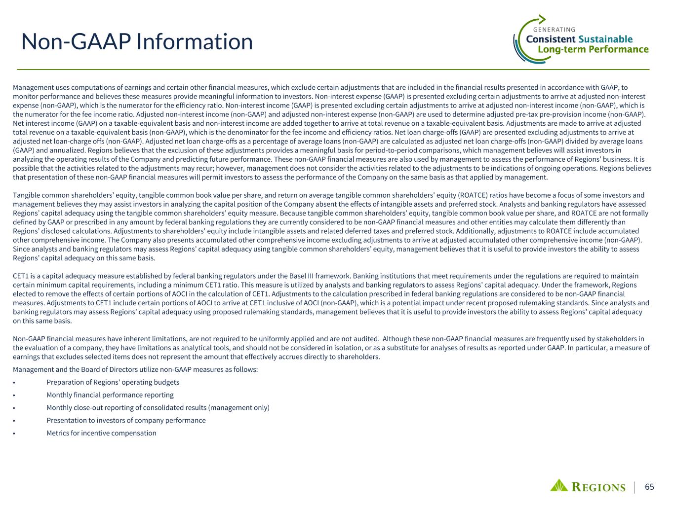 65管理层使用收益计算和某些其他财务指标,其中不包括根据公认会计原则列报的财务业绩中包含的某些调整,来监测业绩,并认为这些指标为投资者提供了有意义的信息。非利息费用(GAAP)的列报不包括某些调整,以得出调整后的非利息费用(non-GAAP),这是效率比率的分子。非利息收入(GAAP)的列报不包括某些调整,以得出调整后的非利息收入(non-GAAP),这是手续费收入比率的分子。调整后的非利息收入(non-GAAP)和调整后的非利息费用(non-GAAP)用于确定调整后的税前拨备前收入(non-GAAP)。以应税等值为基础的净利息收入(GAAP)和非利息收入相加,得出以应税等值为基础的总收入。进行调整以在应税等值基础上(非美国通用会计准则)得出调整后的总收入,这是费用收入和效率比率的分母。净贷款冲销(GAAP)的列报不包括调整,以得出调整后的净贷款冲销(non-GAAP)。调整后的净贷款冲销占平均贷款的百分比(non-GAAP)计算方法为调整后的净贷款冲销(non-GAAP)除以平均贷款(GAAP)并进行年化。Regions认为,排除这些调整为期间比较提供了有意义的基础,管理层认为这将有助于投资者分析公司的经营业绩和预测未来的业绩。管理层还使用这些非公认会计准则财务指标来评估各地区的业务表现。与调整相关的活动可能会再次发生;然而,管理层并不认为与调整相关的活动是正在进行的业务的迹象。Regions认为,这些非公认会计准则财务指标的列报将使投资者能够在与管理层应用的相同基础上评估公司的业绩。有形普通股股东权益、每股有形普通股账面价值、平均有形普通股股东权益回报率(ROATCE)比率已成为一些投资者关注的焦点,管理层认为,他们可能会在没有无形资产和优先股影响的情况下,帮助投资者分析公司的资本状况。分析师和银行业监管机构使用有形普通股股东权益衡量标准评估了各地区的资本充足率。由于有形普通股股东权益、每股有形普通股账面价值和ROATCE未由GAAP正式定义,也未由联邦银行法规规定任何金额,因此目前它们被视为非GAAP财务指标,其他实体的计算方式可能与各地区披露的计算方式不同。股东权益调整包括无形资产和相关的递延税项和优先股。此外,ROATCE的调整还包括累计其他综合收益。公司还列报不计调整的累计其他综合收益,以得出调整后的累计其他综合收益(非美国通用会计准则)。由于分析师和银行业监管机构可能会使用有形普通股股东权益评估各地区的资本充足率,管理层认为,在同样的基础上为投资者提供评估各地区资本充足率的能力是有用的。CET1是联邦银行监管机构在巴塞尔协议III框架下制定的资本充足衡量标准。符合规定要求的银行机构被要求保持一定的最低资本要求,包括最低CET1比率。分析师和银行业监管机构利用这一衡量标准来评估各地区的资本充足率。在该框架下,各地区选择在计算CET1时去除AOCI某些部分的影响。对联邦银行法规规定的计算进行调整被视为非公认会计准则财务措施。对CET1的调整包括AOCI的某些部分,以达到CET1包括AOCI(非GAAP),这是根据最近提议的规则制定标准产生的潜在影响。由于分析师和银行业监管机构可能会使用拟议的规则制定标准来评估各地区的资本充足率,管理层认为,在同样的基础上为投资者提供评估各地区资本充足率的能力是有用的。非美国通用会计准则财务指标具有固有局限性,不需要统一应用,也不需要经过审计。虽然这些非GAAP财务指标经常被利益相关者用于评估一家公司,但它们作为分析工具具有局限性,不应孤立地考虑,或作为根据GAAP报告的结果分析的替代品。特别是, 不包括选定项目的收益衡量标准并不代表有效地直接计入股东的金额。管理层和董事会采用非公认会计原则措施如下:•编制各地区的经营预算•月度财务业绩报告•合并业绩的月度收尾报告(仅限管理层)•向投资者介绍公司业绩•激励薪酬的指标非公认会计原则信息