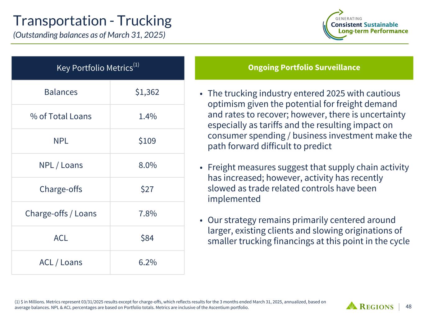 48运输-卡车运输(截至2025年3月31日的未清余额)(1)百万美元。指标代表2025年3月31日的业绩,但冲销除外,冲销反映了截至2025年3月31日止3个月的业绩,按年计算,基于平均余额。NPL & ACL百分比基于投资组合总额。指标包含Ascentium投资组合。关键投资组合指标(1)余额占总贷款的1362% 1.4%不良贷款109美元不良贷款/贷款8.0%冲销27美元冲销/贷款7.8% ACL 84美元ACL/贷款6.2% •鉴于货运需求和费率复苏的潜力,卡车运输行业以谨慎乐观的态度进入2025年;然而,存在不确定性,尤其是因为关税以及由此对消费者支出/商业投资产生的影响使得前进的道路难以预测•运费措施表明供应链活动有所增加;然而,由于实施了与贸易相关的管制,活动最近有所放缓•我们的战略仍然主要围绕较大的现有客户和在周期持续投资组合监控的这一点上减缓小型卡车运输融资的来源