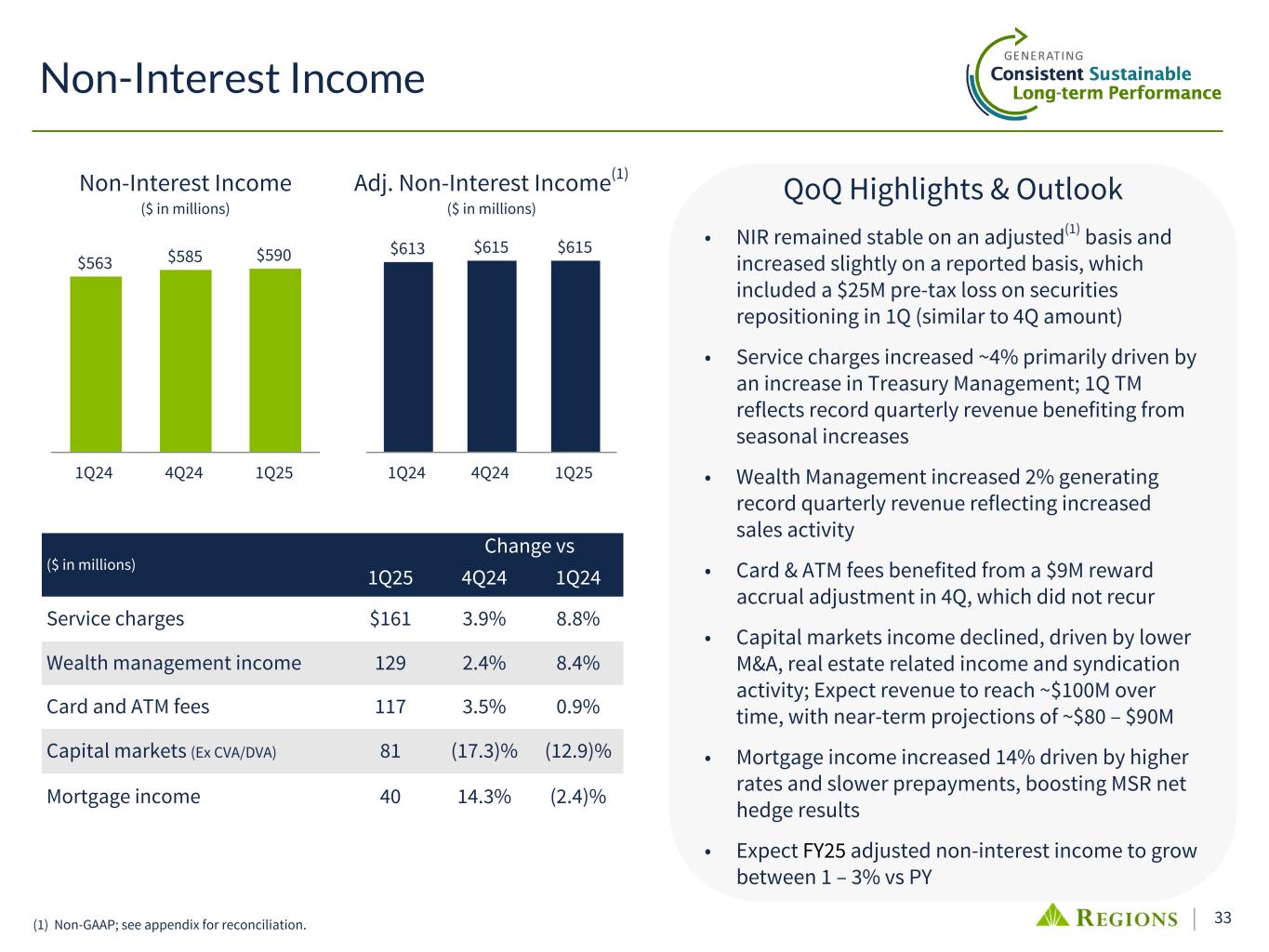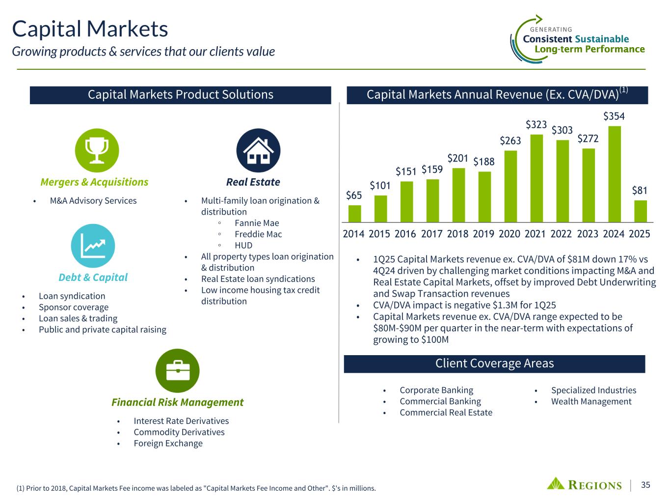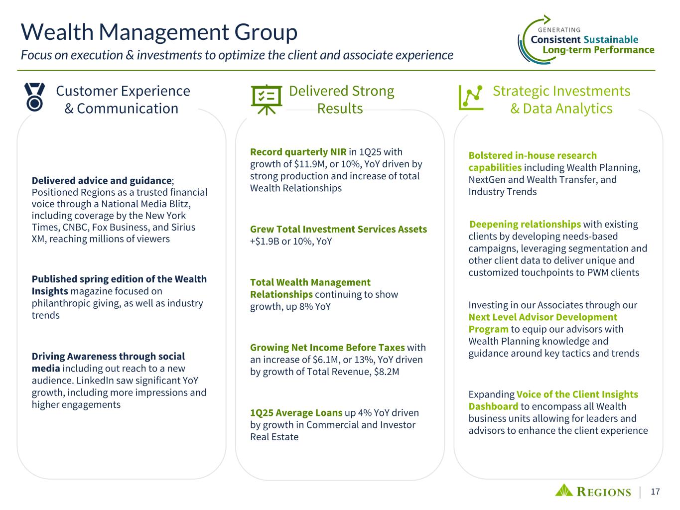 17提供了建议和指导;通过全国媒体闪电战将Regions定位为值得信赖的金融声音,包括纽约时报、CNBC、福克斯商业频道和Sirius XM的报道,覆盖数百万观众《财富洞察》杂志出版的春季版侧重于慈善捐赠,以及通过社交媒体推动提高认识的行业趋势,包括接触新的受众。LinkedIn同比增长显著,包括更多的展示次数和更高的参与度,在2025年第一季度录得1190万美元的季度NIR增长,或10%,同比受强劲的生产和总财富关系增加的推动,总投资服务资产增长+ $ 1.9B或10%,总财富管理关系同比继续呈现增长,同比增长8%,税前净收入增长610万美元,或13%,同比受总收入增长的推动,820万美元25年第一季度平均贷款同比增长4%,这得益于商业和投资者房地产财富管理集团的增长,专注于执行和投资以优化客户和员工体验带来了强劲的结果客户体验和沟通增强了内部研究能力,包括财富规划、下一代和财富转移,以及通过开展基于需求的活动加深与现有客户关系的行业趋势,利用细分和其他客户数据,通过我们的Next Level Advisor Development Program向投资于我们员工的PWM客户提供独特和定制的接触点,为我们的顾问提供围绕关键策略和趋势的财富规划知识和指导,扩大客户的声音Insights Dashboard涵盖所有财富业务部门,允许领导者和顾问增强客户体验战略投资和数据分析