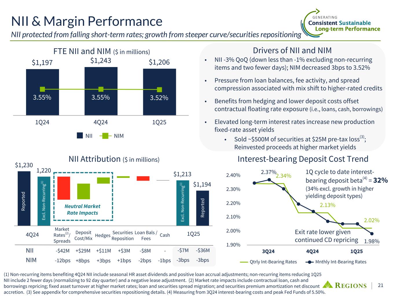 21 $ 1,2301,220 $ 1,213 $ 1,194 Ex cl。N on-R ec ur rin g(1)• NII环比-3 %(剔除非经常性项目下降不到-1 %,减少两天);NIM下降3个基点至3.52% •贷款余额、费用活动和与混合转向更高评级信贷相关的利差压缩带来的压力•对冲和较低存款成本带来的好处抵消了合同浮动利率敞口(即贷款、现金、借款)•长期利率上升提高新生产固定利率资产收益率•以2500万美元的税前亏损出售了约5亿美元的证券(3);以更高的市场收益率再投资收益证券重置对冲(1)受益于4Q24 NII的非经常性项目包括季节性人力资源资产股息和积极的贷款应计调整;减少1Q25 NII的非经常性项目包括减少2天(正常化为92天季度)和负租赁调整。(2)市场利率影响包括合同贷款、现金和借款重新定价;较高市场利率下的固定资产周转率;贷款和证券利差迁移;证券溢价摊销净折价增值。(3)综合证券调仓详情见附录。(4)从3Q24计息成本和峰值联邦基金5.50%来衡量。市场利率(2)/利差1Q254Q24 + 3bps-2bps-12bps + 1100万美元-800万美元-4200万美元NIM NII &保证金表现NII免受短期利率下降的影响;来自更陡峭的曲线/证券重新定位贷款棒/费用的增长+ $ 3M + 1bps $ 1,197 $ 1,243 $ 1,2063.55% 3.55% 3.52% 1Q244Q241Q25NII NIM-$ 3600万存款成本/混合FTE NII和NIM(百万美元)NII归因(百万美元)NII的驱动因素NIM + 8bps + 2900万美元中性市场利率影响2.34% 2.13% 2.02% 2.37% 1.98% Qtrly int-bearing rates Mnthly int-bearing rates 3Q24 4Q24 1Q25 1.90% 2.00% 2.10% 2.20% 2.30% 2.40%计息存款成本趋势1Q周期至今计息存款beta(4)= 32%(34%不包括较高收益存款类型的增长)Re po rt ed re po rt ed ex cl。N on-R ec ur rin g(1)-700万美元-3bps现金--1bps退出利率较低,因为CD重新定价持续-3bps