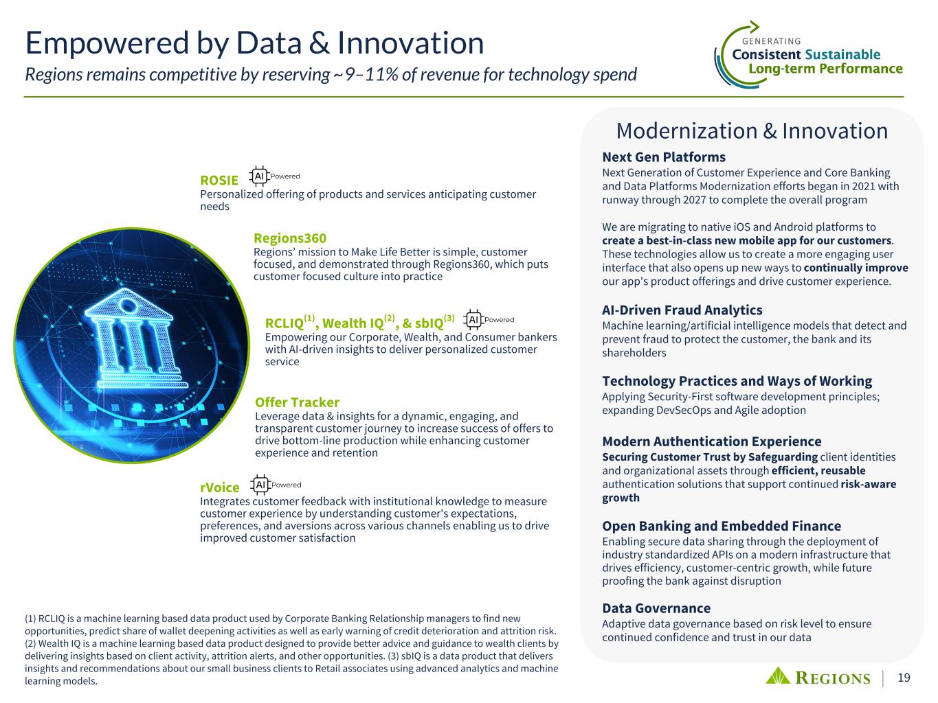 19由数据和创新赋能的地区保持竞争力,将约9– 11%的收入用于技术支出下一代平台下一代客户体验和核心银行和数据平台的现代化努力始于2021年,跑道将持续到2027年,以完成整体计划我们正在迁移到原生iOS和Android平台,为我们的客户创建一流的新移动应用程序。这些技术使我们能够创建一个更具吸引力的用户界面,这也为不断改进我们的应用程序的产品供应和推动客户体验开辟了新途径。AI驱动的欺诈分析机器学习/人工智能模型,可检测和预防欺诈行为,以保护客户、银行及其股东的技术实践和工作方式,应用安全优先的软件开发原则;扩展DevSecOps和敏捷采用现代认证体验,通过高效、可重用的认证解决方案保护客户身份和组织资产,从而保护客户信任,支持持续的风险意识增长开放银行和嵌入式金融通过在推动效率、以客户为中心的增长的现代基础设施上部署行业标准化API,实现安全数据共享,在未来为银行提供抗中断数据治理的同时,基于风险水平的自适应数据治理,以确保对我们的数据现代化和创新持续的信心和信任ROSIE个性化提供预测客户需求的产品和服务Regions360 Regions让生活更美好的使命简单、以客户为中心,并通过Regions360进行了展示,Regions360将以客户为中心的文化付诸实践RCLIQ(1)、Wealth IQ(2)和& sBIQ(3)为我们的企业、财富和消费者银行家提供人工智能驱动的洞察力,以提供个性化的客户服务,提供Tracker利用数据和洞察力实现动态、引人入胜,和透明的客户旅程,提高优惠的成功率,以推动底线生产,同时提高客户体验和保留率rVoice将客户反馈与机构知识相结合,通过了解客户的期望、偏好和跨各种渠道的厌恶情绪来衡量客户体验,使我们能够推动提高客户满意度(1)RCLIQ是一种基于机器学习的数据产品,公司银行关系经理用于寻找新机会、预测钱包深化活动的份额以及预警信用恶化和流失风险。(2)Wealth IQ是一款基于机器学习的数据产品,旨在通过提供基于客户活动、流失警报和其他机会的洞察力,为财富客户提供更好的建议和指导。(3)sbiQ是一种数据产品,它使用高级分析和机器学习模型向零售员工提供有关我们小型企业客户的见解和建议。