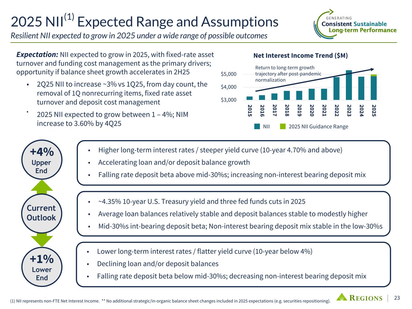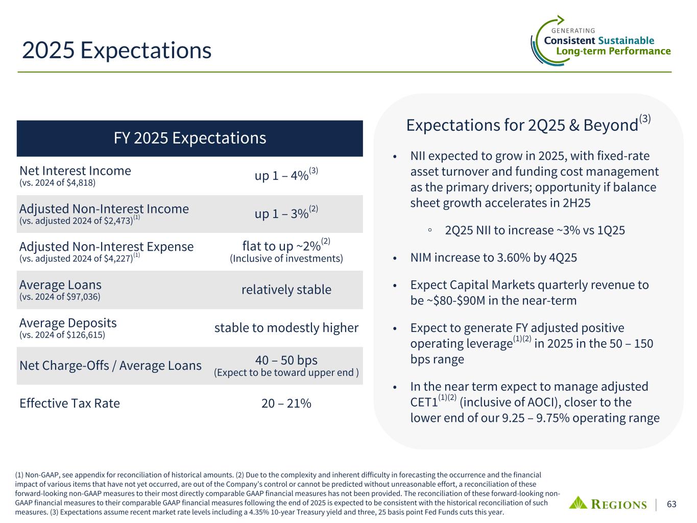 对2Q25 & Beyond的63次预期(3)• NII预计将在2025年增长,固定利率资产周转率和融资成本管理是主要驱动因素;如果2H25资产负债表增长加速,则是机会⑤ 2Q25 NII将比1Q25增长约3% •到4Q25 NIM将增长至3.60% •预计资本市场季度收入在短期内约为80-9000万美元•预计将在2025年产生FY调整后的正经营杠杆(1)(2),范围在50 – 150个基点•近期内预计将管理调整后的CET1(1)(2)(包括AOCI),更接近我们9.25 – 9.75%运营区间2025年预期(1)非公认会计原则的下限,历史金额的调节见附录。(2)由于预测尚未发生、超出公司控制范围或未经不合理努力无法预测的各种项目的发生和财务影响的复杂性和固有困难,未提供这些前瞻性非公认会计原则措施与其最直接可比的公认会计原则财务措施的对账。2025年底之后,这些前瞻性非GAAP财务指标与其可比GAAP财务指标的对账预计将与此类指标的历史对账保持一致。(3)预期假设近期市场利率水平包括4.35%的10年期国债收益率和今年3次、25个基点的联邦基金削减。2025财年预期净利息收入(与2024年的4,818美元相比)增长1 – 4%(3)调整后非利息收入(与调整后的2024年的2,473美元相比)(1)增长1 – 3%(2)调整后非利息费用(与调整后的2024年的4,227美元相比)(1)持平至增长约2%(2)(包括投资)平均贷款(与2024年的97,036美元相比)相对稳定的平均存款(与2024年的126,615美元相比)稳定到略高的净冲销/平均贷款40 – 50个基点(预计将接近上限)有效税率20 – 21%