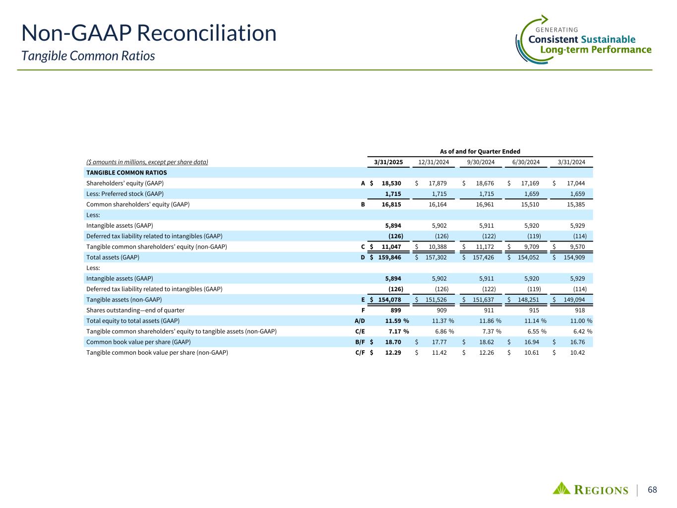 68截至本季度末(百万美元,每股数据除外)3/31/202512/31/20249/30/20246/30/20243/31/2024有形共同比率股东权益(GAAP)A $ 18,530 $ 17,879 $ 18,676 $ 17,169 $ 17,044减:优先股(GAAP)1,7151,7151,6591,659普通股股东权益(GAAP)B 16,81516,16416,96115,51015,385减:无形资产(GAAP)5,8945,9025,9115,9205,929与无形资产相关的递延所得税负债(GAAP)(126)(126)(122)(119)(114)有形普通股股东权益(non-GAAP)C $ 11,047 $ 10,388 $ 11,172 $ 9,709 $ 9,570总资产(GAAP5,8945,9025,9115,9205,929与无形资产相关的递延所得税负债(GAAP)(126)(126)(122)(119)(114)有形资产(non-GAAP)154,078美元151,526美元151,637美元148,251美元149,094美元流通股——季度末F 899909911911915918总股本比总资产(GAAP)A/D 11.59% 11.37% 11.86% 11.14% 11.00%有形普通股股东权益比有形资产(non-GAAP)C/E 7.17% 6.86% 7.37% 6.55% 6.42%每股普通帐面价值(GAAP)B/F $ 18.70 $ 17.77 $ 18.62 $ 16.94 $ 16.76有形普通帐面价值每股份(非美国通用会计准则)C/F $ 12.29 $ 11.42 $ 12.26 $ 10.61 $ 10.42非美国通用会计准则和解有形共同比率