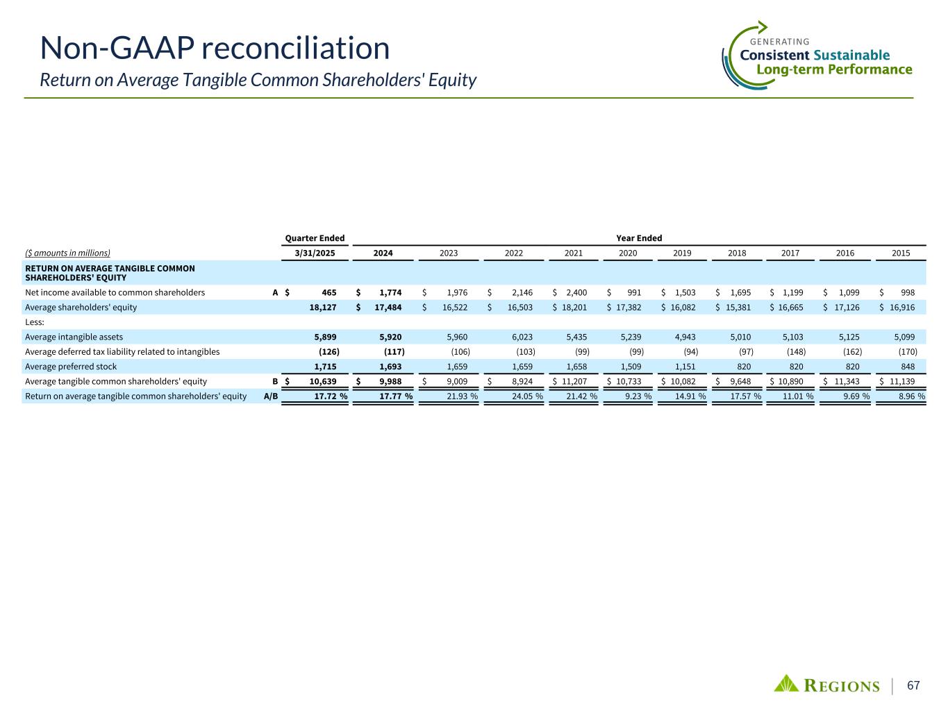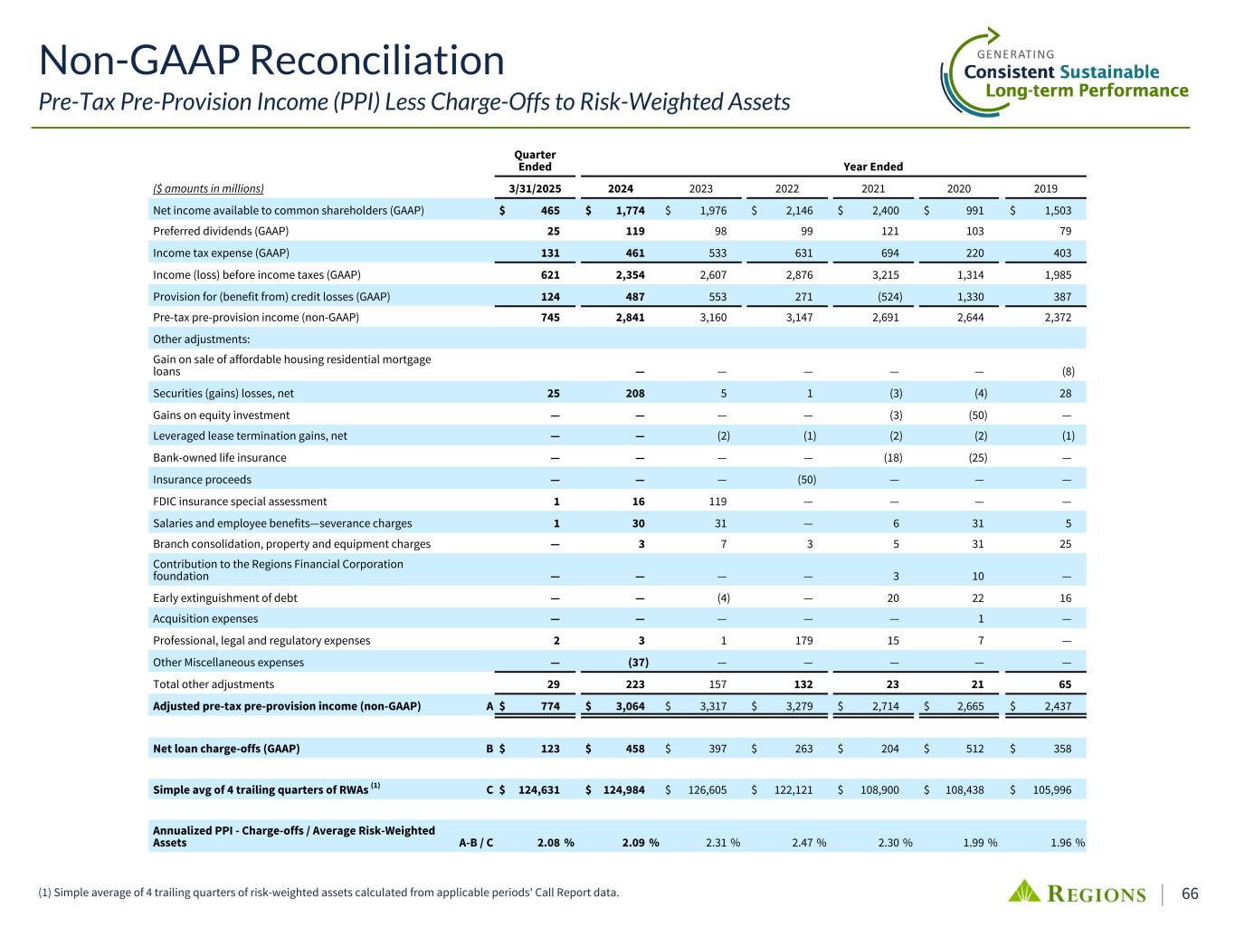66季度末年终(百万美元)3/31/2025202420232022202120202019普通股股东可获得的净收入(GAAP)465美元1,774美元1,976美元2,146美元2,400美元991美元1,503美元优先股息(GAAP)25119989912110379所得税费用(GAAP)131461533631694220403所得税前收入(亏损)(GAAP)6212,3542,6072,8763,2151,3141,985拨备(受益于)信贷损失(GAAP)124487553271(524)1,330387税前拨备前收入(非GAAP)7452,8413,1603,1472,6912,6442,372其他调整:出售经济适用住房住宅抵押贷款收益————(8)证券(收益)损失,净额2520851(3)(4)28股权投资收益————(3)(50)——杠杆租赁终止收益,净额——(2)(1)(2)(2)(1)银行自有寿险————(18)(25)——保险收益————(50)———— FDIC保险特别评估116119 ————工资和员工福利——遣散费13031 — 6315分支机构合并、财产和设备费用—— 37353125对地区金融公司基础的贡献———— 310 ——提前清偿债务———— 202216购置费用———— 1 ——专业,法律和监管费用231179157 —其他杂项费用—(37)————其他调整合计29223157132232165调整后税前拨备前收入(非公认会计原则)A $ 774 $ 3,064 $ 3,317 $ 3,279 $ 2,714 $ 2,665 $ 2,437净贷款冲销(GAAP)B $ 123 $ 458 $ 397 $ 263 $ 204 $ 512 $ 358简单平均4个季度的风险加权资产(1)C $ 124,631 $ 124,984 $ 126,605 $ 122,121 $ 108,900 $ 108,438 $ 105,996年化PPI-冲销/平均风险加权资产A-B/C 2.08% 2.09% 2.31% 2.47% 2.30% 1.99% 1.96%(1)从适用期间的调用报告数据计算得出的风险加权资产的4个尾随季度的简单平均。非美国通用会计准则调节税前拨备收入(PPI)减去对风险加权资产的冲销