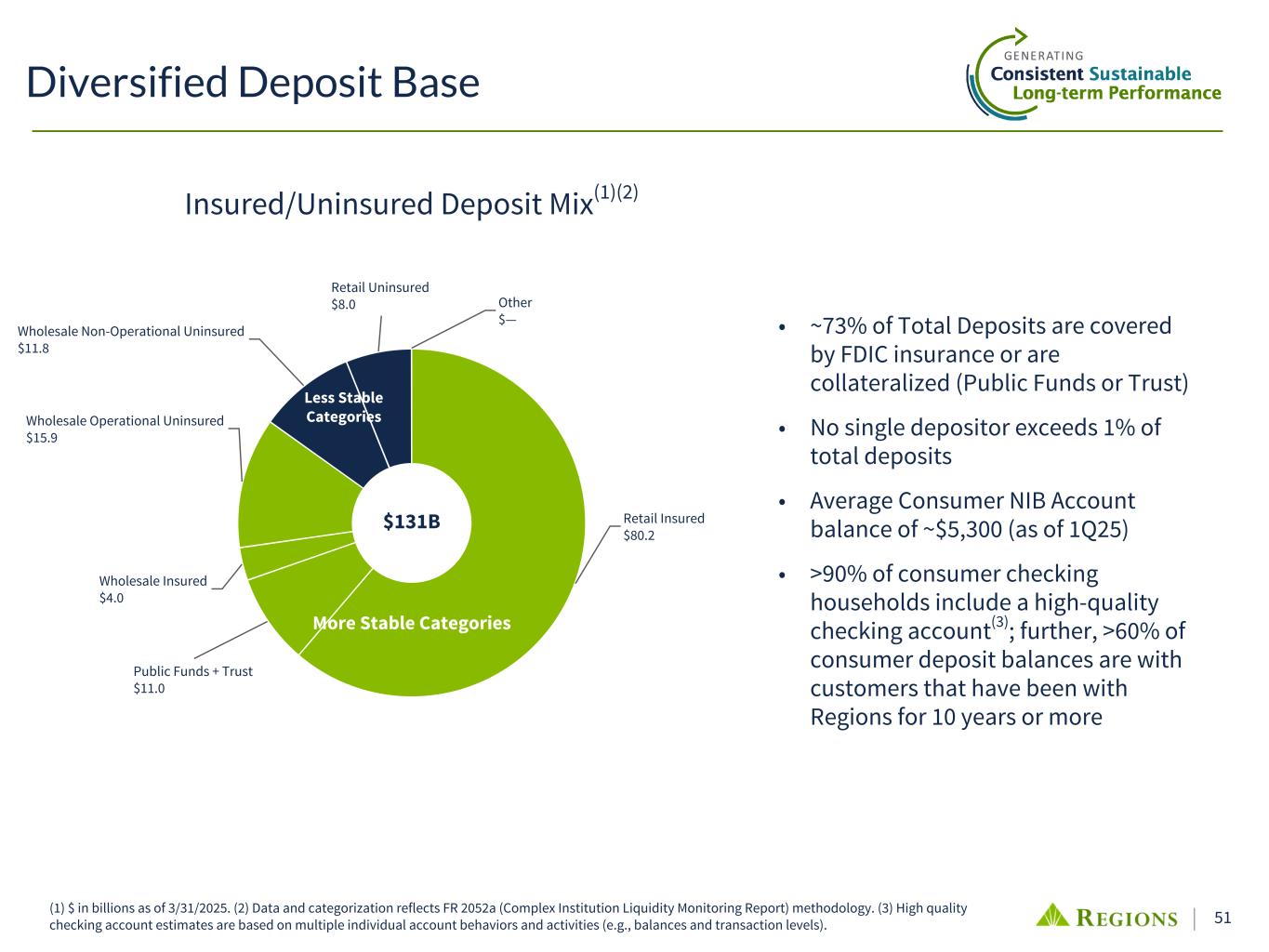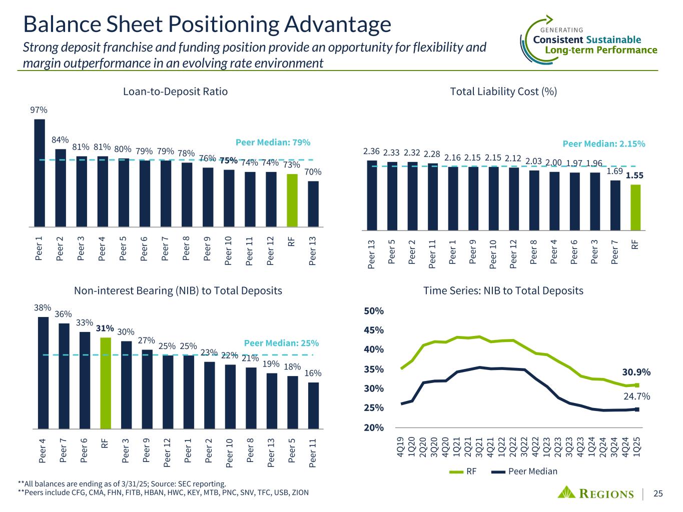 262.50% 5.43% 4.50% 0.82% 2.02% 1.03% 2.96% 2.48%联邦基金RF IB存款成本同业中位数1Q17 3Q17 1Q18 3Q18 1Q19 3Q19 1Q20 3Q20 1Q21 3Q21 1Q22 3Q22 1Q23 3Q23 1Q24 3Q24 1Q25。—% 1.00% 2.00% 3.00% 4.00% 5.00% 6.00% 59% 35% 55% 55% 29% 43%同行中值RF‘04-’07周期‘15-’19周期‘21-’24周期0% 25% 50% 75%(1)同行包括CFG、CMA、FHN、FITB、HBAN、HWC、TERM4、KEY、MTB、PNC、SNV、TFC、USB、ZION(2)截至2025年3月31日的零售CD到期日;余额不包括未来展期计息存款成本vs.同业(1)es地区存款定价存款定价优于预期的表现将持续存在•各地区的存款构成通过多个利率上升周期导致重新定价(beta)在同业集团中处于最低水平•在过去两个周期中一致的利率寻求行为;在美联储紧缩幅度的推动下,‘21-’24的全周期beta更高紧缩周期的持续时间• Ability随着市场利率下降而将存款重新定价得更低,这与迄今为止30%左右的表现和保护NII所需的金额一致;随着CD到期并重新定价更低2.34% $ 5.1 $ 3.2 $ 2.1$ 0.9 $ 0.54.2% 3.5% 3.8% 3.0% 2.9% Volume $ B Rate 2Q25 3Q25 4Q25 1Q26 2Q26零售CD到期日(截至2025年3月31日)(2)