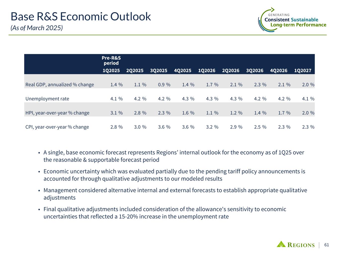 60个环比亮点•第一季度备抵与上一季度相比基本持平,导致拨备费用为1.24亿美元• ACL保持一致的原因是:丨冲销导致特定准备金借款人减少⑤投资组合净流失和剩余平均贷款期限缩短导致投资组合减少,部分被一些信贷质量恶化所抵消丨基准经济预测恶化和由于对新关税影响的担忧导致的经济不确定性导致的质量调整净增加1729美元(20)美元(16)37美元1730美元信贷损失备抵03/31/2025(百万美元)12/31/2024投资组合变动经济/质量变动特定准备金变动