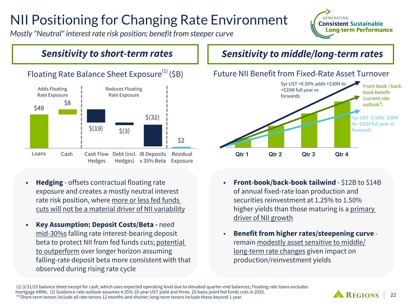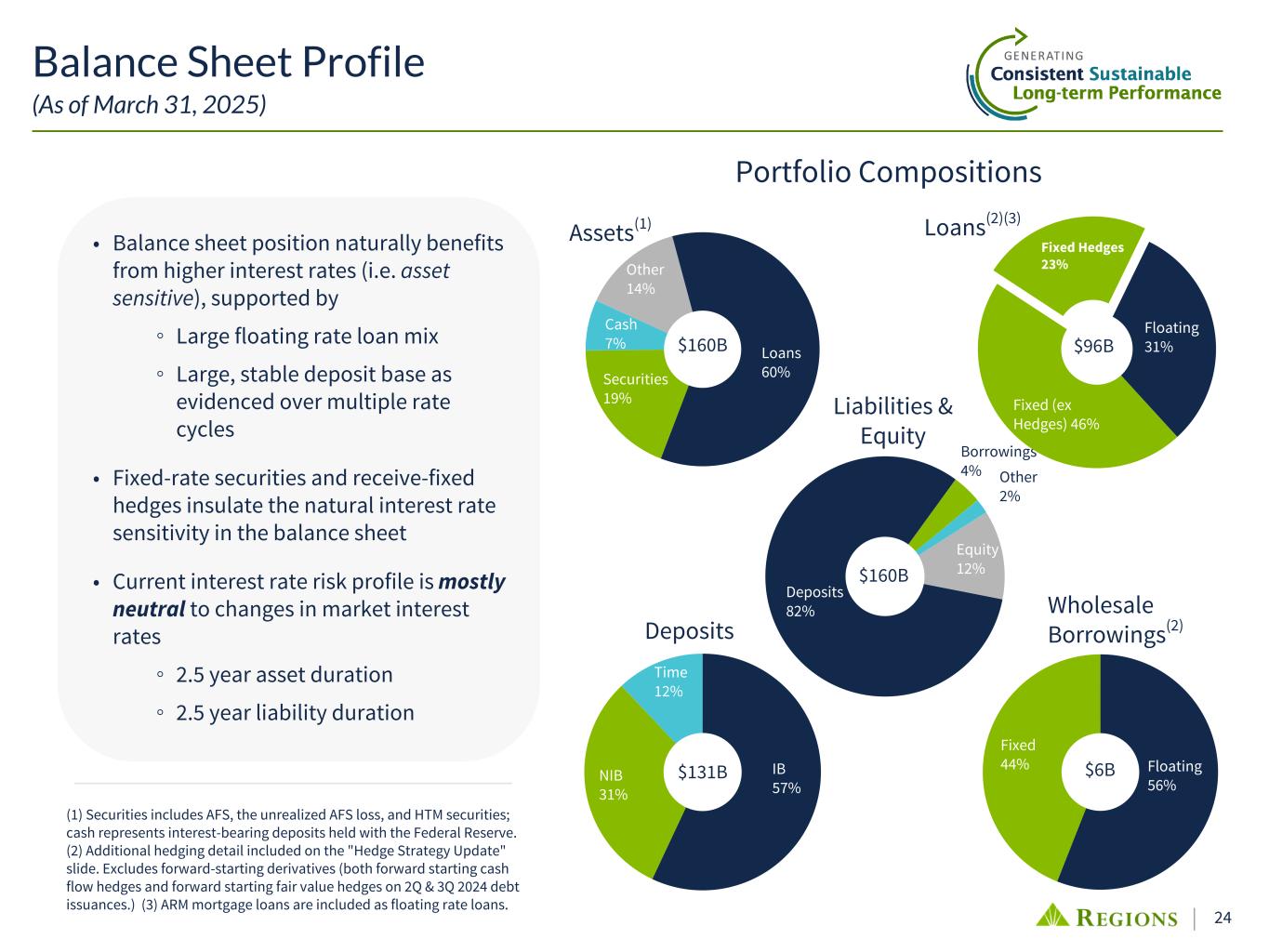 24 •资产负债表状况自然受益于更高的利率(即对资产敏感),这得益于⑤大型浮动利率贷款组合⑤大型、多个利率周期所证明的稳定的存款基础•固定利率证券和收款-固定对冲隔离了资产负债表中的自然利率敏感性•当前的利率风险状况对市场利率的变化大多是中性的⑤ 2.5年资产久期⑤ 2.5年负债久期浮动56%固定44%存款82%借款4%其他2%股权12% IB 57% NIB 31%时间12%贷款60%证券19%现金7%其他14%浮动31%固定(除对冲)46%固定对冲23% $ 131B贷款(2)(3)$ 96B资产负债表概况(截至3月31日,2025年)投资组合构成$ 160B资产(1)负债和权益$ 160B批发借款(2)$ 6B存款(1)证券包括AFS、未实现AFS损失和HTM证券;现金代表在美联储持有的计息存款。(2)“对冲策略更新”幻灯片中包含的额外对冲细节。不包括远期起始衍生工具(2024年第二季度和第三季度债务发行的远期起始现金流对冲和远期起始公允价值对冲。)(3)ARM抵押贷款被列为浮动利率贷款。