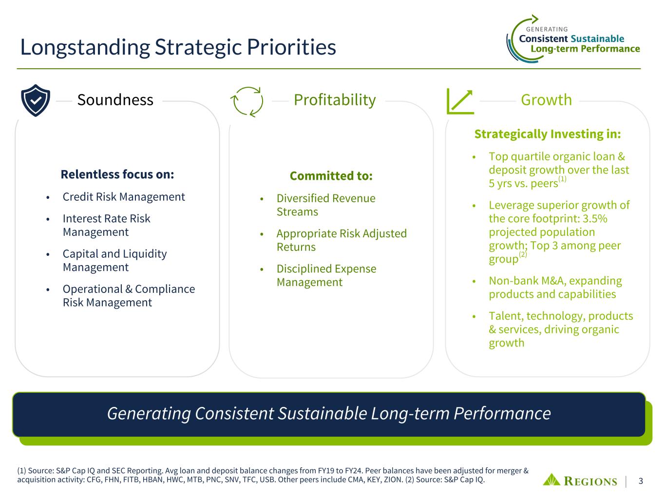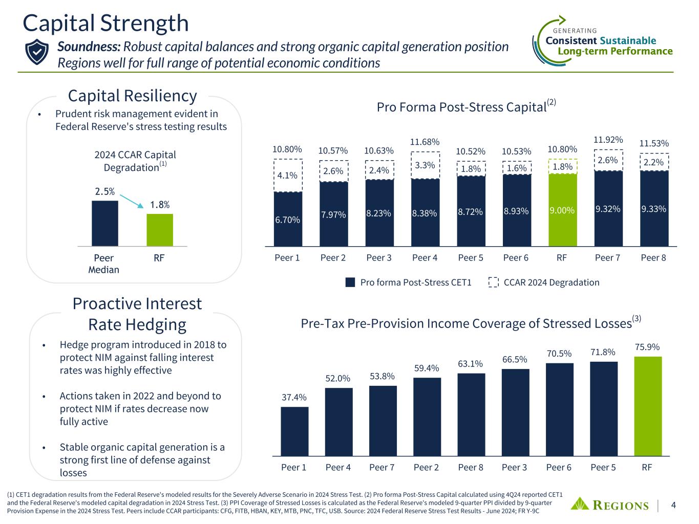 3个长期战略优先事项致力于:•多元化收入流•适当的风险调整后回报•有纪律的费用管理盈利能力战略性投资于:•过去5年与同行相比,有机贷款和存款增长排名前四分之一(1)•利用核心足迹的卓越增长:预计人口增长3.5%;同行集团前3名(2)•非银行并购,扩大产品和能力•人才、技术、产品和服务,推动有机增长不懈关注:•信用风险管理•利率风险管理•资本和流动性管理•运营和合规风险管理稳健(1)资料来源:标普 Cap IQ和SEC报告。19财年至24财年的平均贷款和存款余额变化。同行余额已根据并购活动进行了调整:CFG、FHN、FITB、HBAN、HWC、TERM3、MTB、TERMPNCPNC、SNV、TFC、USB。其他同行包括CMA、KEY、ZION。(2)资料来源:标普 Cap IQ。产生始终如一的可持续长期业绩