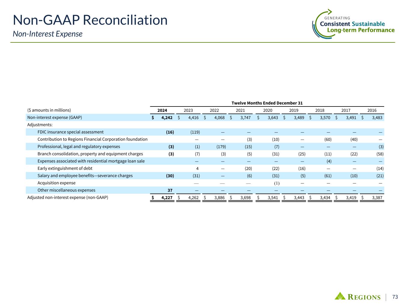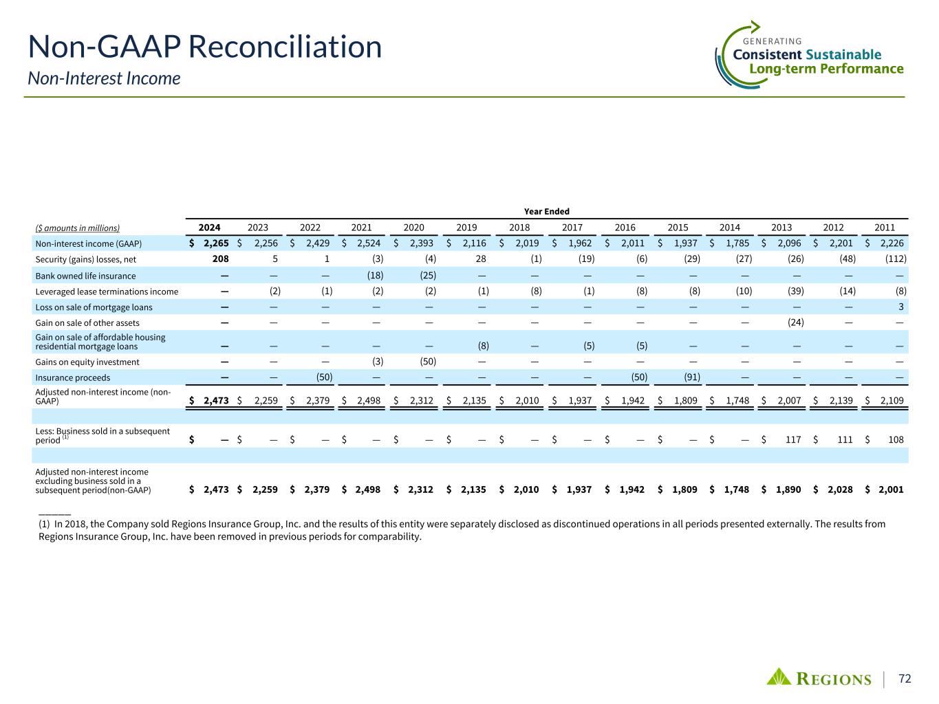 72非GAAP调节非利息收入年终(百万美元)202420232022202120202019201820172017201620152014201320122011非利息收入(GAAP)2265美元2256美元2429美元2524美元2393美元2116美元2,0 19美元1,962美元2,0 11美元1,937美元1,785美元2,096美元2,201美元2,226美元安全(收益)损失,净额20851(3)(4)28(1)(19)(6)(29)(27)(26)(48)(112)银行自有寿险————(18)(25)————————杠杆租赁终止收益——(2)(1)(2)(2)(1)(8)(8)(10)(39)(14)(8)出售抵押贷款损失———————————— 3出售其他资产收益——————————————(24)——出售保障性住房住宅抵押贷款收益——————(8)——(5)(5)————股权投资收益————(3)(50)————————保险收益————(50)————(50)(91)————调整后非利息收入(非公认会计原则)2473美元2259美元2379美元2498美元2312美元2135美元2,010美元1,937美元1,942美元1,809美元1,748美元2,007美元2,139美元2,109减:以后期间出售的业务(1)$ — $ — $ — $ —$ — $ — $ — $ — $ — $ 117 $ 111 $ 108调整后的非利息收入,不包括以后期间出售的业务(非公认会计准则)$ 2,473 $ 2,259 $ 2,379 $ 2,498 $ 2,312 $ 2,135 $ 2,0 10 $ 1,937 $ 1,942 $ 1,809 $ 1,748 $ 1,890 $ 2,028 $ 2,001_____(1)2018年,公司出售了Regions Insurance Group,Inc.,该实体的业绩在对外列报的所有期间作为已终止经营业务单独披露。Regions Insurance Group,Inc.的结果已在前几期中被删除,以便于比较。