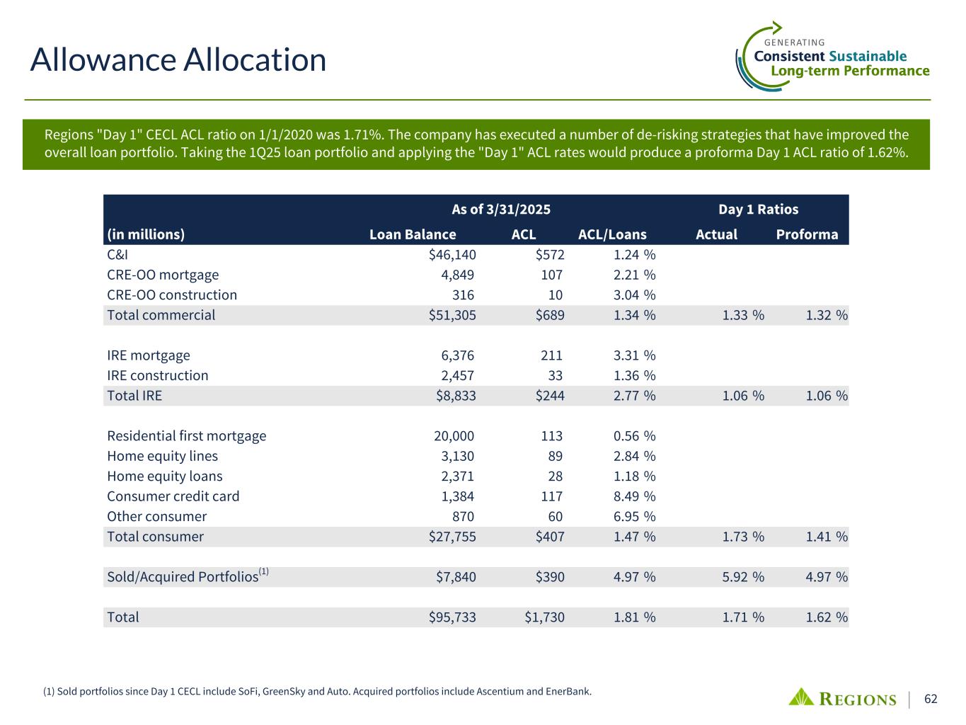 62截至2025年3月31日第1天比率(百万)贷款余额ACL ACL/贷款实际形式C & I $ 46,140 $ 5721.24% CRE-OO抵押贷款4,8491072.21% CRE-OO建设316103.04%商业总额$ 51,305 $ 689 1.34% 1.33% 1.32% IRE抵押贷款6,3762113.31% IRE建设2,457331.36% IRE总额$ 8,833 $ 2442.77% 1.06%住宅首次抵押贷款20,0001130.56%房屋净值额度3,130892.84%房屋净值贷款2,371281.18%消费信用卡1,3841178.49%其他消费者870606.95%总消费者$ 27,755 $ 4071.47% 1.73% 1.41% Sold/Acquired Portfolios(1)$ 7,840 $ 3904.97% 5.92% 4.97% total $ 95,733 $ 1,7301.81% 1.71% 1.62% allowance allocation regions“Day 1”CECL ACL ratio on 1/1/2020 was 1.71%。该公司执行了多项去风险策略,改善了整体贷款组合。取1Q25贷款组合并应用“Day1”ACL利率将产生1.62%的备考Day1 ACL比率。(1)CECL自第1天起出售的投资组合包括SoFi、GreenSky和Auto。收购的投资组合包括Ascentium和EnerBank。