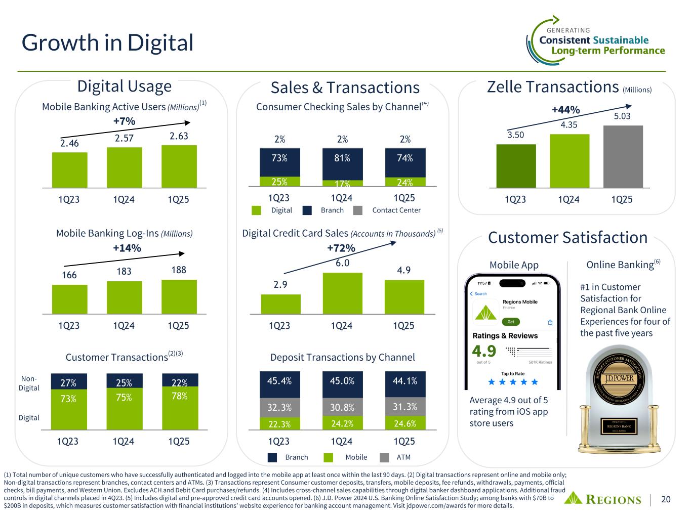 202.46 2.57 2.63 1Q23 1Q24 1Q25 3.50 4.355.03 1Q23 1Q24 1Q25 166183188 1Q23 1Q24 1Q25 22.3% 24.2% 24.6% 32.3% 30.8% 31.3% 45.4% 45.0% 44.1% 1Q23 1Q24 1Q25 2.96.04.9 1Q23 1Q24 1Q25 73% 75% 78% 27% 25% 22% 1Q23 1Q24 1Q25数字手机银行登录增长(百万)客户交易(2)(3)渠道手机银行活跃用户存款交易(百万)(1)数字信用卡销售(千户)(5)数字非数字移动ATM + 44% + 14% 25% 17% 24% 73% 81% 74% 2% 2% 1Q23客户满意度Zelle交易(百万)销售额&交易数字使用量+7%(1)在过去90天内至少成功认证并登录一次移动应用程序的唯一客户总数。(2)数字交易仅代表在线和移动;非数字交易代表分支机构、联络中心和ATM。(3)交易代表消费者客户存款、转账、移动存款、手续费退款、取款、支付、公务支票、账单支付、西联汇款。不包括ACH和借记卡购买/退款。(4)包括通过数字银行家仪表板应用程序的跨渠道销售能力。23年第4季度对数字渠道实施了额外的欺诈控制。(5)包括开立的数字和预先批准的信用卡账户。(6)J.D. Power 2024美国银行业在线满意度研究;在拥有$ 70B至$ 200B存款的银行中,衡量客户对金融机构的银行账户管理网站体验的满意度。访问jdpower.com/awards了解更多详情。+ 72%移动应用网银(6)过去五年四次区域银行线上体验客户满意度排名第一iOS应用商店用户平均评分4.9分(满分5分)