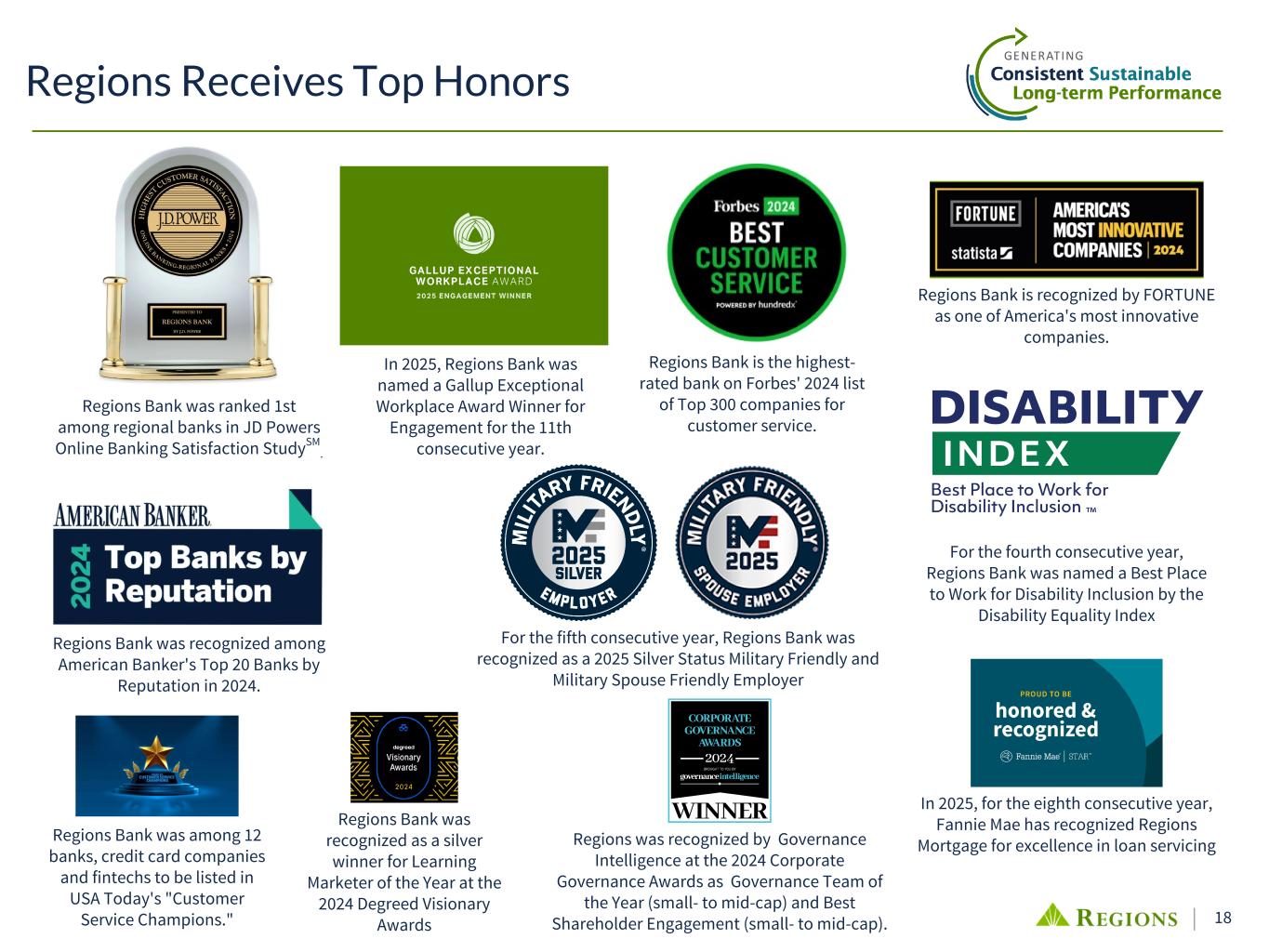 18个地区连续第五年获得最高荣誉,地区银行被认定为2025年银级军人友好和军人配偶友好雇主2025年,地区银行连续第11年被评为盖洛普卓越工作场所奖的敬业度获奖者。Regions Bank连续第四年被《残疾平等指数》(Disability Equality Index)评为残疾包容最佳工作场所Regions Bank是《福布斯》2024年客户服务300强企业榜单中评级最高的银行。Regions Bank被《财富》杂志评为美国最具创新力的公司之一。Regions Bank在京东 Powers网银满意度研究SM中荣获区域银行第1名。Regions Bank被公认为2024年《美国银行家》声誉排名前20的银行。Regions Bank是12家银行、信用卡公司和金融科技公司之一,将被列入USA Today的“客户服务冠军”。Regions在2024年公司治理奖中被Governance Intelligence评为年度治理团队(中小型股)和最佳股东参与度(中小型股)。Regions Bank在2024 Degreed Visionary Awards 2025上被评为年度学习营销人员银奖,这是房利美连续第八年表彰Regions Mortgage在贷款服务方面的卓越表现
