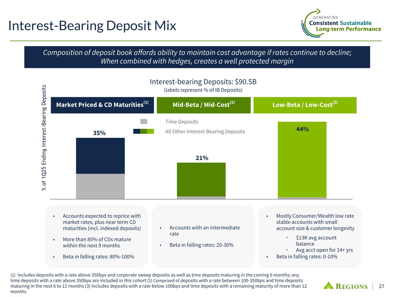 27%的1 Q 25 E nd in g in te re st-B ea ri ng D ep os its有息存款:$ 90.5b(标签代表IB存款的百分比)有息存款组合构成的存款账簿提供了在利率继续下降的情况下保持成本优势的能力;当与对冲相结合时,创造一个受到良好保护的保证金低贝塔/低成本(3)市场定价& CD期限(1)(1)包括利率在350bps以上的存款和企业扫货存款以及未来6个月到期的定期存款;任何利率在350bps以上的定期存款都包括在这个队列中(2)包括利率在100-350bps之间的存款和未来6至12个月到期的定期存款(3)包括利率在100bps以下的存款和剩余期限超过12个月的定期存款中Beta/中成本(2)定期存款所有其他有息存款35% 17% 21% 44% •预计将以市场利率重新定价的账户,加上近期CD到期日(包括指数化存款)•超过85%的CD在未来9个月内到期•利率下降期的Beta:80%-100 %•利率下降期的账户•利率下降期的Beta:20-30 %•主要是消费者/财富低利率稳定账户,账户规模小且客户寿命长⑤平均账户余额为1.3万美元⑤平均14年以上开放的Avg acct •利率下降期的Beta:0-10 %