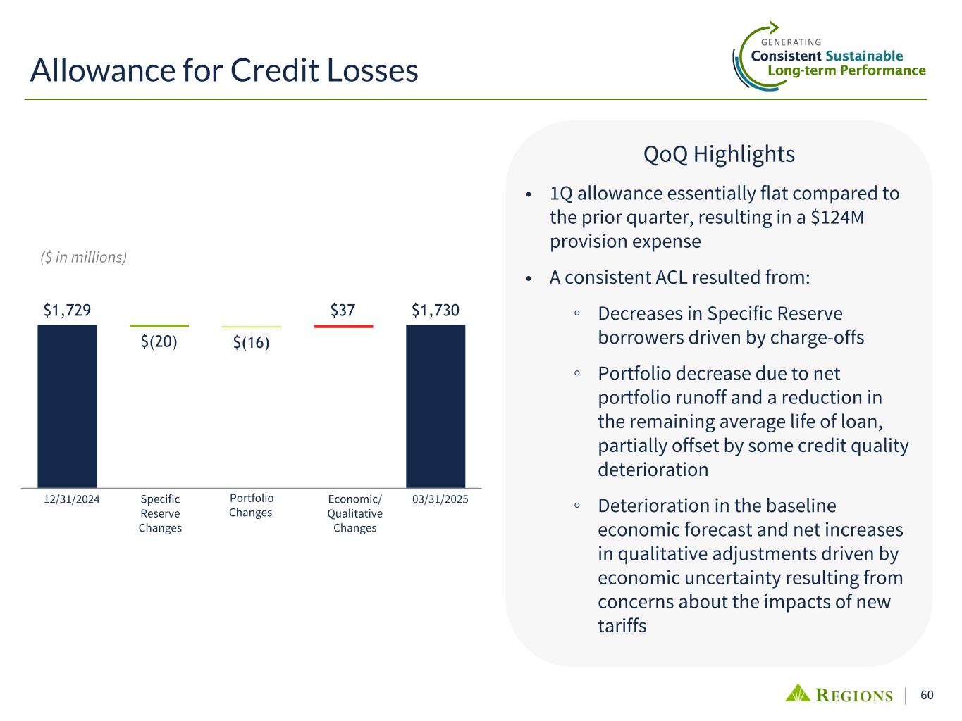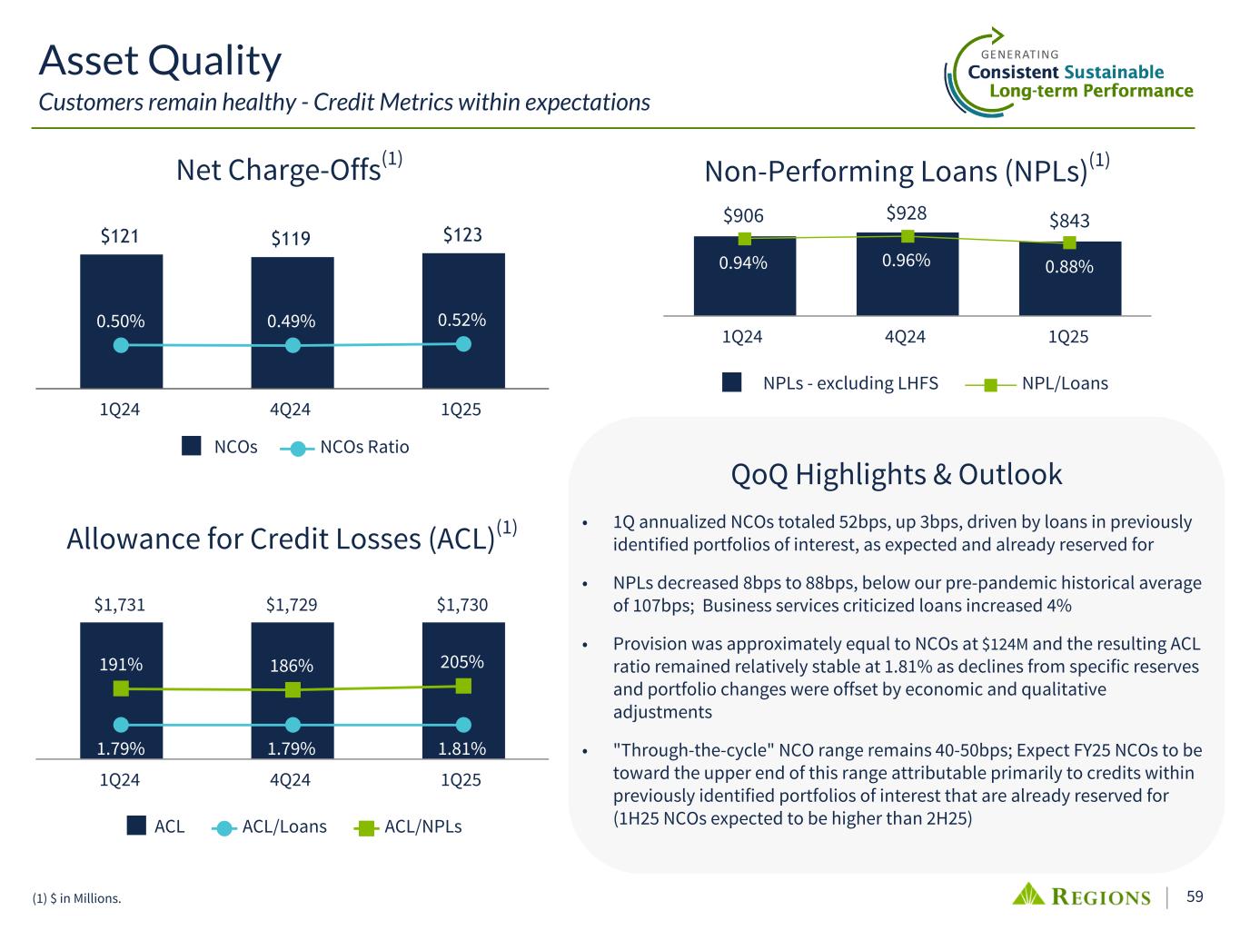 59 QoQ Highlights & Outlook •第一季度年化NCO总数为52bps,上升3bps,这是由先前确定的利息组合中的贷款推动的,一如预期,并且已经为•不良贷款下降8bps至88bps,低于我们大流行前107个基点的历史平均水平;商业服务受到批评的贷款增加4% •拨备约等于NCO,为1.24亿美元,由此产生的ACL比率保持相对稳定,为1.81%,因为特定准备金和投资组合变化的下降被经济和质量调整所抵消•“整个周期”NCO范围保持40-50个基点;预计25财年NCO将接近这一范围的上限,这主要归因于先前确定的利益组合内的信贷已为(预计1H25 NCO高于2H25)资产质量客户保持健康-信用指标在预期范围内$ 1,731 $ 1,729 $ 1,7301.79% 1.79% 1.81% 191% 186% 205% ACL ACL/贷款ACL/NPLs 1Q24 4Q24 1Q25 $ 121 $ 119 $ 1230.50% 0.49% 0.52% NCO NCO比率1Q24 4Q24 1Q25 $ 906 $ 928 $ 8430.94% 0.96% 0.88% NPLs-不包括LHFS NPL/贷款1Q24 4Q24 1Q25(1)百万美元。净冲销(1)信贷损失准备金(ACL)(1)不良贷款(NPLs)(1)