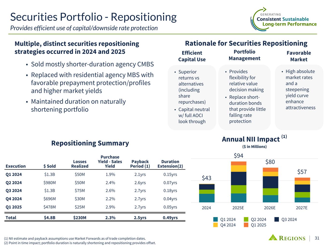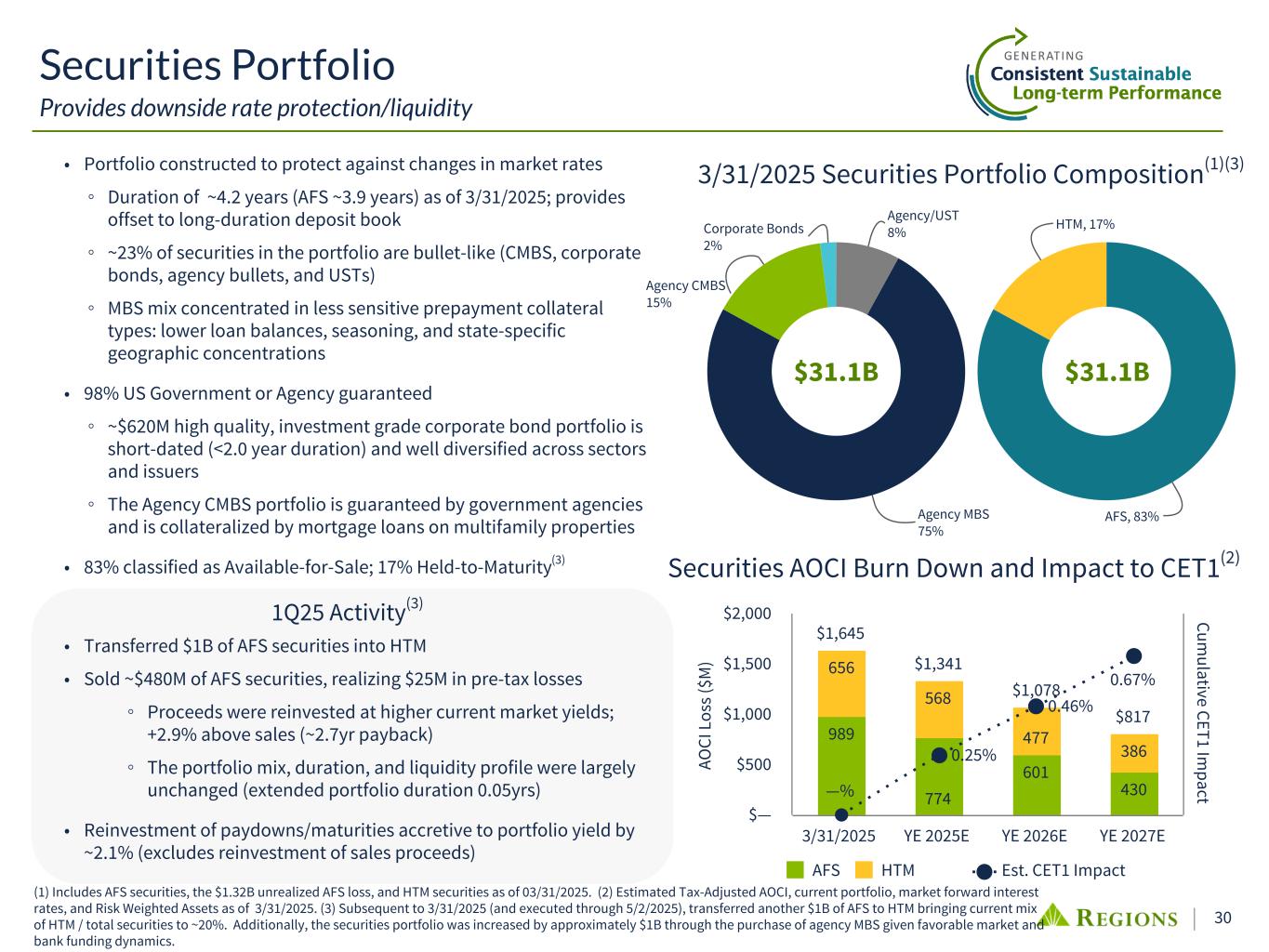 30 •为防止市场利率变化而构建的投资组合丨截至2025年3月31日,期限为~4.2年(AFS~3.9年);向长期存款账簿提供冲销⑤~23%的投资组合中的证券是子弹式的(CMBS、公司债、机构子弹和UST)⑤ MBS组合集中于不太敏感的提前还款抵押品类型:较低的贷款余额、调味料和特定州的地理集中度• 98%的美国政府或机构提供担保⑤~6.2亿美元的高质量,投资级公司债券投资组合期限较短(久期< 2.0年),并且在跨行业和发行人中具有很好的分散性⑤机构CMBS投资组合由政府机构提供担保,并以多户住宅的抵押贷款作抵押•83%归类为可供出售;17%持有至到期(3)•将1B美元的AFS证券转入HTM •出售了约4.8亿美元的AFS证券,实现了2500万美元的税前亏损⑤收益以当前市场收益率更高的价格进行再投资;比销售额高出+ 2.9%(~2.7年的投资回收期)⑤投资组合组合、久期、流动性状况基本没有变化(投资组合久期延长0.05年)•将还款/到期日再投资可使投资组合收益率增加约2.1%(不包括销售收益再投资)代理/UST 8%代理MBS 75%代理CMBS 15%公司债券2%证券投资组合提供下行利率保护/流动性3/31/2025证券投资组合构成(1)(3)$ 31.1B证券AOCI烧毁和对CET1的影响(2)AO CI L OS s($ M)和最终的CET1 IM pact 989774601630656568477386 $ 1,645 $ 1,341 $ 1,078 $ 817 — % 0.25% 0.46% 0.67% AFS HTM EST。CET1 Impact 3/31/2025 YE 2025E YE 2026E YE 2027E $ — $ 500 $ 1,000 $ 1,500 $ 2,0001Q25活动(3)AFS,83% HTM,17%(1)包括AFS证券,截至2025年3月31日的1.32B美元未实现AFS损失和HTM证券。(2)截至2025年3月31日的税后调整后AOCI、当前组合、市场远期利率、风险加权资产估算。(3)在3/31/2025之后(并在5/2/2025之前执行),将另外1B美元的AFS转移到HTM,使HTM/总证券的当前组合达到~20%。此外,鉴于有利的市场和银行融资动态,通过购买代理MBS,证券投资组合增加了大约1B美元。$ 31.1b