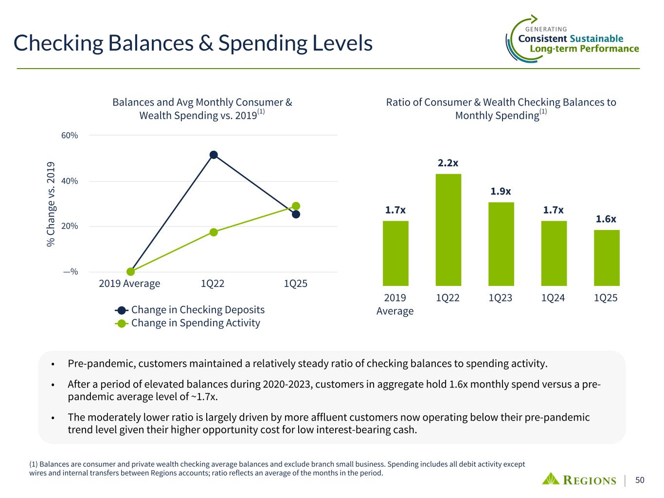 50 •大流行前,客户保持了相对稳定的支票余额与消费活动的比率。•在2020-2023年期间经历了一段时间的高余额后,客户总体上持有1.6倍的月支出,而大流行前的平均水平约为1.7倍。•这一适度较低的比率主要是由于较富裕的客户目前的运营水平低于大流行前的趋势水平,因为他们获得低计息现金的机会成本较高。检查余额和支出水平% C ha ng e vs. 20 19支票存款变化支出活动变化2019年平均1Q22 1Q25 —% 20% 40% 60%余额和平均每月消费者和财富支出与2019年相比(1)1.7x 2.2x 1.9x 1.7x 1.6x 2019年平均1Q22 1Q23 1Q24 1Q25消费者和财富支票余额与每月支出的比率(1)(1)余额为消费者和私人财富支票平均余额,不包括分支机构小型企业。支出包括除电汇和地区账户之间的内部转账之外的所有借方活动;比率反映了该期间月份的平均值。