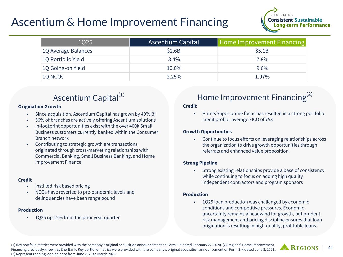 44 Ascentium & Home Improvement Financing(1)Key portfolio metrics were provided with the original acquisition announcement on Form 8-K dated February 27,2020。(2)各地区家装融资此前称为EnerBank。公司于2021年6月8日在表格8-K上的原始收购公告中提供了关键的投资组合指标。(3)指2020年6月至2025年3月的期末贷款余额。1Q25 Ascentium Capital家装融资1Q平均余额$ 2.6B $ 5.1B 1Q投资组合收益率8.4% 7.8% 1Q持续收益率10.0% 9.6% 1Q NCOS 2.25% 1.97% Ascentium Capital(1)发起式增长•自收购以来,Ascentium Capital增长了40%(3)• 56%的分支机构正在积极提供Ascentium解决方案•目前在消费者分支机构网络中存入的超过40万小企业客户存在足迹内的机会•有助于战略增长的是通过与商业银行、小企业银行的交叉营销关系发起的交易,和家装金融信贷•灌输基于风险的定价• NCO已恢复到大流行前的水平,拖欠率受范围限制生产• 25年第一季度比去年同期增长12%家装融资(2)信贷• Prime/Super Prime专注导致投资组合信用状况强劲;平均FICO为753个增长机会•继续集中努力利用整个组织的关系,通过推荐和增强价值主张来推动增长机会。强大的管道•强大的现有关系提供了一致性的基础,同时继续专注于增加高质量的独立承包商和项目赞助商制作• 1Q25贷款制作受到经济状况和竞争压力的挑战。经济不确定性仍然是增长的逆风,但审慎的风险管理和定价纪律确保贷款发放产生高质量、有利可图的贷款。
