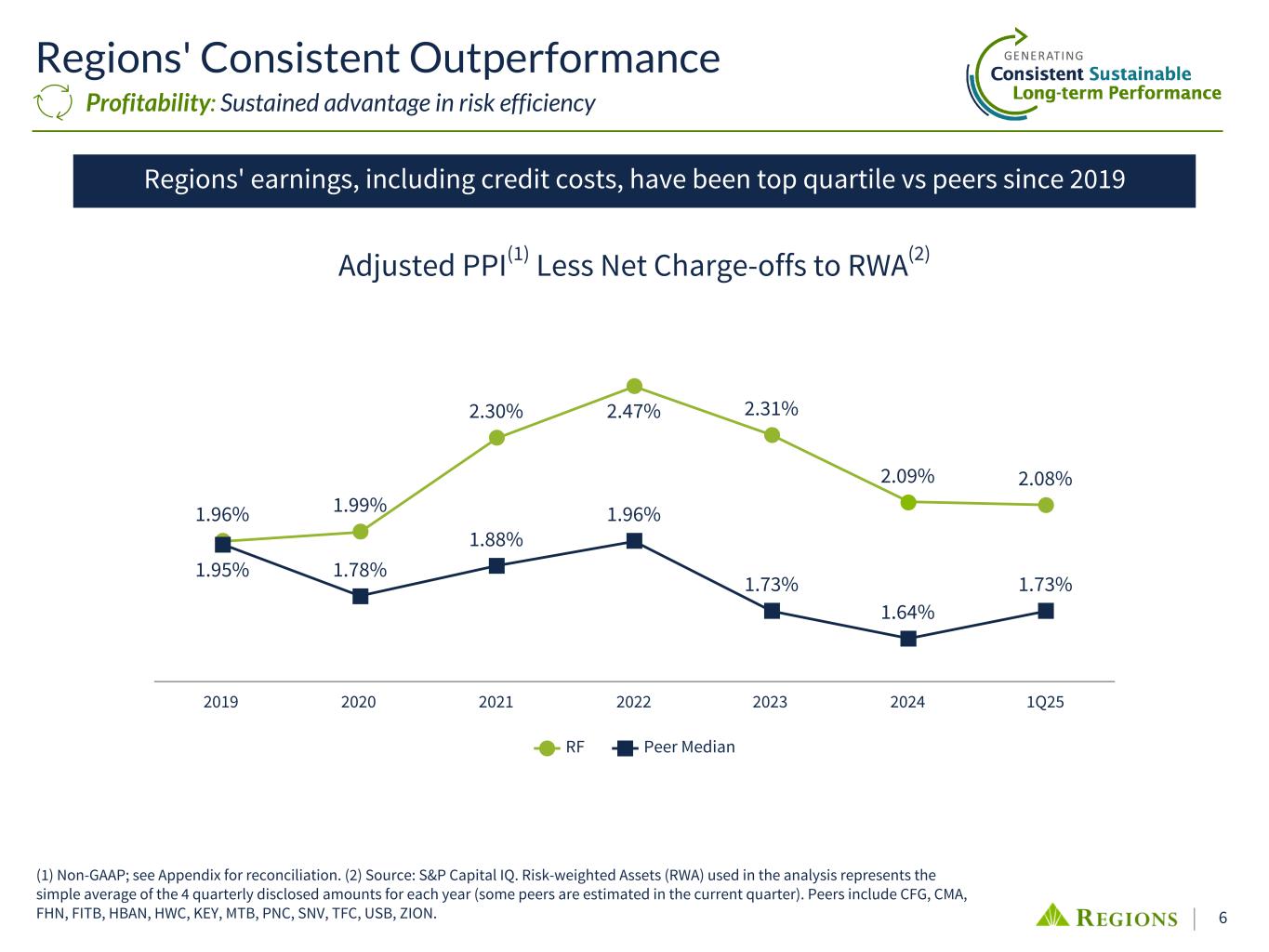 6个地区的表现始终优于经调整后的PPI(1)减去对RWA的净冲销(2)自2019年以来,包括信贷成本在内的各地区收益与同行相比一直处于前四分之一1.96% 1.99% 2.30% 2.47% 2.31% 2.09% 2.08% 1.95% 1.78% 1.88% 1.96% 1.73% 1.64% 1.73%射频同行中值201920202021202220232024 1Q25(1)non-GAAP;调节见附录。(2)资料来源:标普 Capital IQ。分析中使用的风险加权资产(RWA)表示每年4个季度披露金额的简单平均值(一些同行是在当前季度估计的)。同行包括CFG、CMA、FHN、FITB、HBAN、HWC、KEY、MTB、PNC、SNV、TFC、USB、ZION。盈利能力:风险效率持续优势