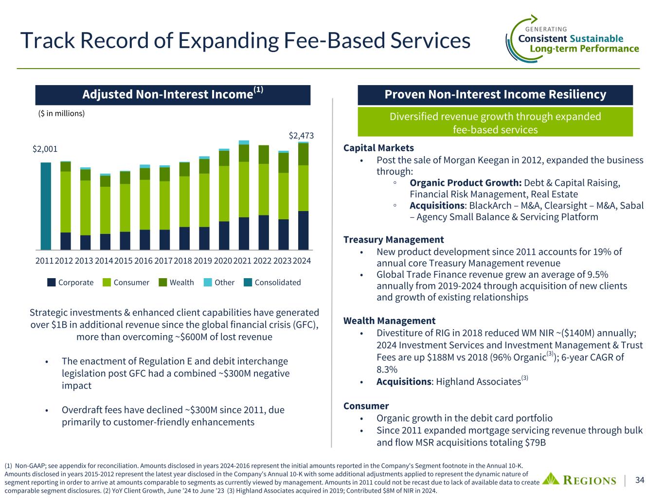 34扩大收费服务的往绩记录证明了非利息收入的弹性调整后的非利息收入(1)通过扩大收费服务实现多元化的收入增长(1)Non-GAAP;调节见附录。2024-2016年披露的金额代表年度10-K中公司分部脚注中报告的初始金额。2015-2012年披露的金额代表公司年度10-K中披露的最近一年,并应用了一些额外调整,以代表分部报告的动态性质,以便得出与管理层目前认为的分部可比的金额。由于缺乏可用于创建可比分部披露的可用数据,2011年的金额无法重算。(2)客户同比增长,24年6月至23年6月(3)2019年收购的Highland Associates;2024年贡献了800万美元的NIR。(百万美元)资本市场• 2012年出售Morgan Keegan后,通过以下方式扩展业务:⑤有机产品增长:债务和资本筹集、金融风险管理、房地产⑤收购:BlackArch –并购、Clearsight –并购,Sabal – Agency Small Balance & Servicing Platform Treasury Management •自2011年以来的新产品开发占年度核心Treasury Management收入的19% •通过获得新客户和现有关系的增长,全球贸易融资收入从2019-2024年平均每年增长9.5%财富管理• 2018年RIG的剥离每年减少了WM NIR~(1.4亿美元);2024年投资服务与2018年相比,投资管理和信托费用增加了1.88亿美元(96%有机(3));6年复合年增长率为8.3% •收购:Highland Associates(3)消费者•借记卡组合的有机增长•自2011年以来,通过大宗和流动MSR收购扩大了抵押贷款服务收入,总计79B美元的战略投资和增强的客户能力自全球金融危机(GFC)以来产生了超过10亿美元的额外收入,超过了约6亿美元的收入损失•全球金融危机后E条例和借方交换立法的颁布产生了总计约3亿美元的负面影响•自2011年以来,透支费用已下降约3亿美元,主要由于客户友好型增强企业消费者财富其他综合201120122013201420152016201720182019202020202021202220232024美元2,001美元2,473美元