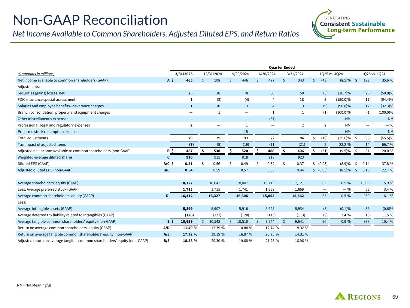 69非公认会计原则调节普通股股东可获得的净收入、调整后稀释每股收益和回报率NM-季度末没有意义(百万美元)3/31/202512/31/20249/30/20246/30/20243/31/2024 1Q25 vs. 4Q24 1Q25 vs. 1Q24普通股股东可获得的净收入(GAAP)A $ 465 $ 508 $ 446 $ 477 $ 343 $(43)(8.5)% $ 12235.6%调整:证券(收益)损失,净额2530785050(5)(16.7)%(25)(50.0)% FDIC保险特别评估1(2)(4)4183(150.0)%(17)(94.4)%工资和雇员福利—遣散费1103413(9)(90.0)%(12)(92.3)%分支机构合并、财产和设备费用— 1 — 11(1)(100.0)%(1)(100.0)%其他杂项费用————(37)—— NM—NM Professional,法律和监管费用2 — 1 — 2 2 NM ——%优先股赎回费用—— 15 ———— NM—NM总调整2939932284 $(10)(25.6)% $(55)(65.5)%调整项目的税收影响(7)(9)(19)(11)(21)222.2% 1466.7%普通股股东可获得的调整后净收入(非公认会计原则)B $ 487 $ 538 $ 520 $ 488 $ 406 $(51)(9.5)% $ 8120.0%加权平均摊薄股C910915918918923摊薄每股收益(GAAP)A/C $ 0.51 $0.56 $ 0.49 $ 0.52 $ 0.37 $(0.05)(8.9)% $ 0.14 37.8%调整后摊薄EPS(non-GAAP)B/C 0.54 0.59 0.57 0.53 0.44 $(0.05)(8.5)% $ 0.10 22.7%平均股东权益(GAAP)18,12718,04218,04716,71317,121850.5% 1,0065.9%减:平均优先股(GAAP)1,7151,7151,7411,6591,659 ——% 563.4%平均普通股股东权益(GAAP)D 16,41216,32716,30615,05415,462850.5% 9506.1%减:平均无形资产(GAAP)5,8995,9075,9165,9255,934(8)(0.1)%(35)(0.6)%平均递延与无形资产相关的纳税义务(GAAP)(126)(123)(120)(115)(113)(3)2.4%(13)11.5%平均有形普通股股东权益(non-GAAP)E $ 10,639 $ 10,543 $ 10,510 $ 9,244 $ 9,641960.9% 99810.4%平均普通股股东权益回报率(GAAP)A/D 11.49% 12.39% 10.88% 12.74% 8.92%平均有形普通股股东权益回报率(non-GAAP)A/E 17.72% 19.19% 16.87% 20.75% 14.31%调整后平均有形普通股股东权益回报率(non-GAAP)B/E 18.58% 20.30% 19.68% 21.23% 16.96%