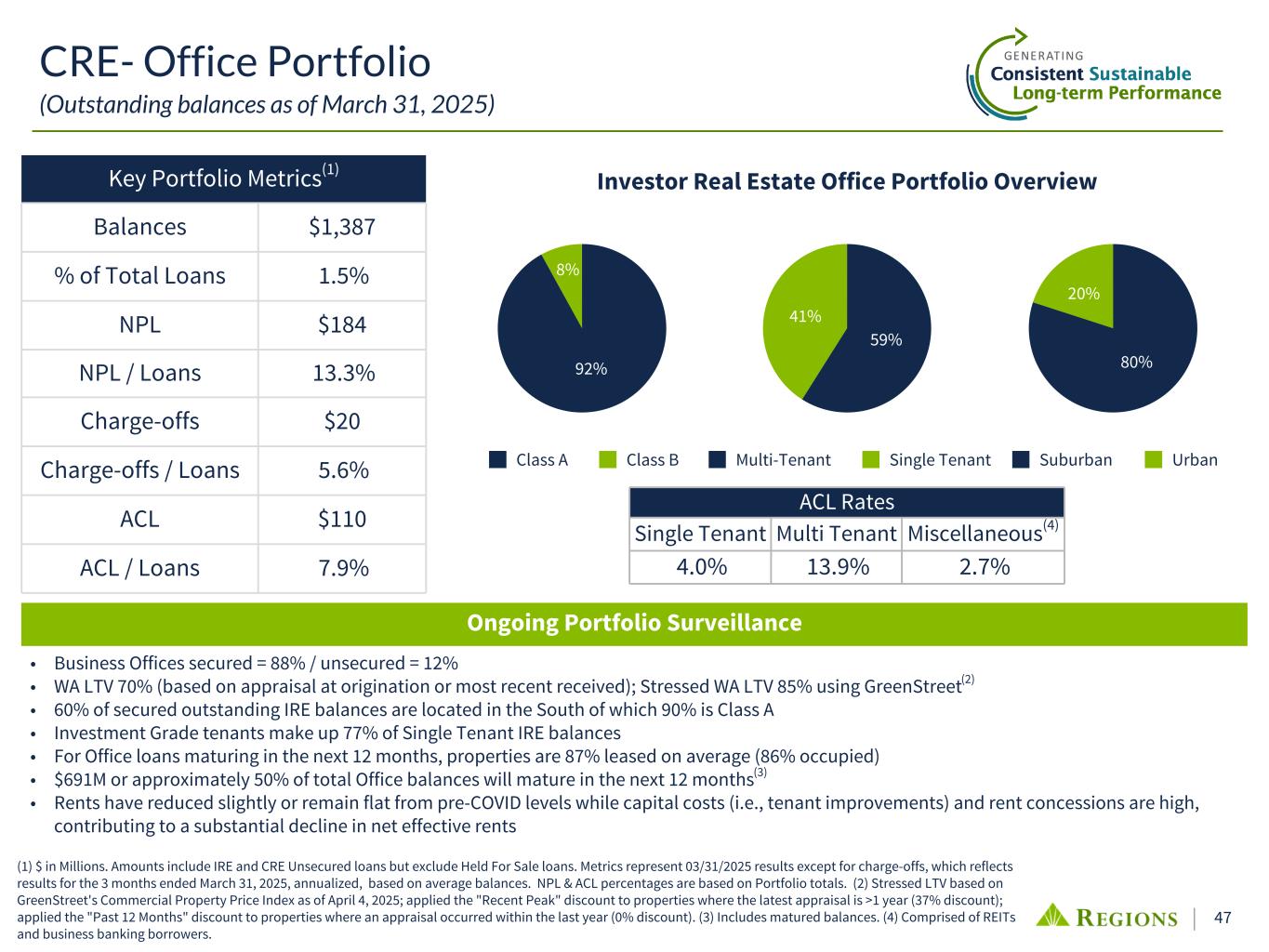 46商业房地产(截至2025年3月31日的未偿余额)高度多样化的投资组合(IRE包括无担保CRE)(1)不包括5.2B美元的自住CRE,其还款来源是个体企业,其信贷表现类似于压力时期的商业。(2)基于12/31/2024基于风险的资本估计。监管限额2006年12月联合监管印发《商业性房地产贷款集中度指引,健全风险管理做法》。Res.Homebuilders 8.5% Other 3.1% Hotel 4.9% Healthcare 7.8% Retail 8.9% Residential Land 0.4% Office 8.8% Data Center 1.0% Diversified 10.9% Industrial 14.9% Commercial Land 0.3% Self Storage 2.0% Apartments 28.5% $ 15.8B $ in billions % of total loans Unsecured CRE(include。RETS)$ 7.07.3% IRE 8.89.2% Total(1)$ 15.8 16.5%年贷款到期3% 22% 31% 26% 11% 5% 2% Multi-Family Office Other Real Estate Total Real Estate Matured 20252026202720282029 > 5 years $ — $ 1,000 $ 2,000 $ 3,000 Office 4% Data Center 3% Diversified 16% Apartments 5% Hotel 12% Industrial 26% Other 6% Self Storage 6% Retail 22% REITs in Total:$ 5.2B •用于可再生能源用途的无抵押贷款通常杠杆率较低,可获得较强的流动性丨65%的REIT未偿余额为投资级或映射至IG风险评级,这为整体投资组合提供了损失绝缘①剩余未担保的余额主要是由主要由IG赞助商支持的机构可再生能源基金•总可再生能源(包括美国证券交易委员会。CRE)对基于风险的资本(2):107%和建筑、土地和收购。& Dev.to Risk Based Capital:19%远低于监管限额(300%/100%)关键投资组合指标