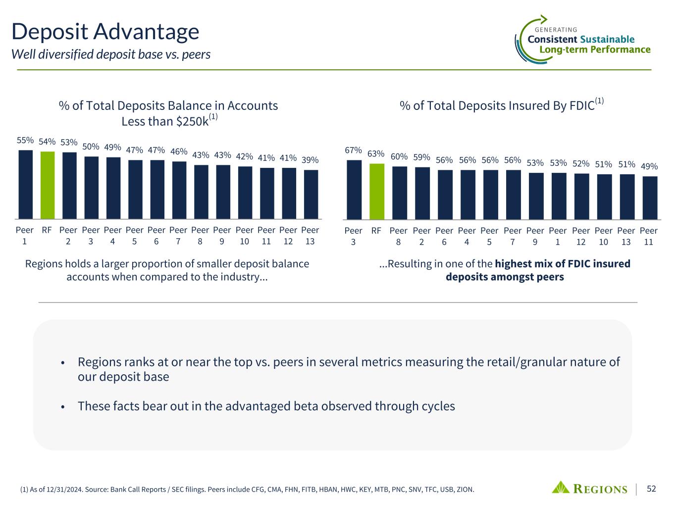 52存款优势Well diversified deposit base vs. peers(1)截至12/31/2024。资料来源:银行电话报告/SEC文件。同行包括CFG、CMA、FHN、FITB、HBAN、HWC、KEY、MTB、PNC、SNV、TFC、USB、ZION。...导致FDIC受保险存款在同行中的最高组合之一%受FDIC保险的总存款(1)低于25万美元账户中总存款余额的百分比(1)与行业相比,各地区拥有更大比例的较小存款余额账户..。67% 63% 60% 59% 56% 56% 56% 56% 56% 53% 53% 52% 51% 51% 49% Peer 3 RF Peer 8 Peer 2 Peer 6 Peer 4 Peer 5 Peer 7 Peer 9 Peer 1 Peer 12 Peer 10 Peer 10 Peer 13 Peer 11 55% 54% 53% 50% 49% 47% 47% 46% 43% 42% 41% 41% 39% Peer 1 RF Peer 2 Peer 3 Peer 4 Peer 5 Peer 6 Peer 7 Peer 8 Peer 9 Peer 10 Peer 11 Peer 12 Peer 13 •区域排名在衡量我们存款基础的零售/颗粒度性质的几个指标中,或接近与同行的最高水平•这些事实在通过周期观察到的优势贝塔中得到证实