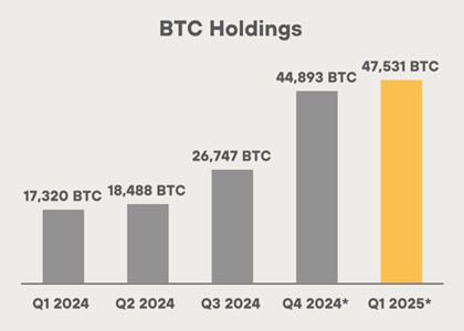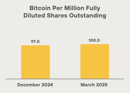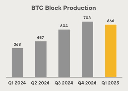 | – | 于2025年3月31日,我们持有47,531个BTC(包括借出和抵押的BTC)。期间2025年第一季度,我们挖到了2,286个比特币。2025年3月31日,我们的BTC每股收益率为3.5%。 |